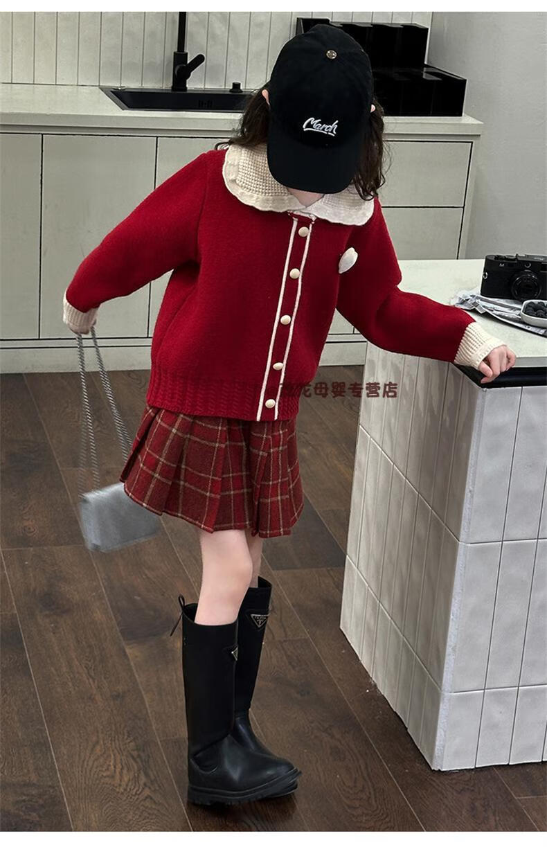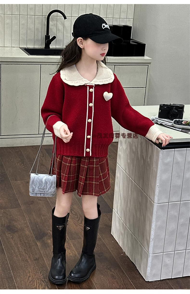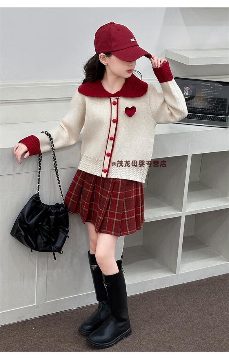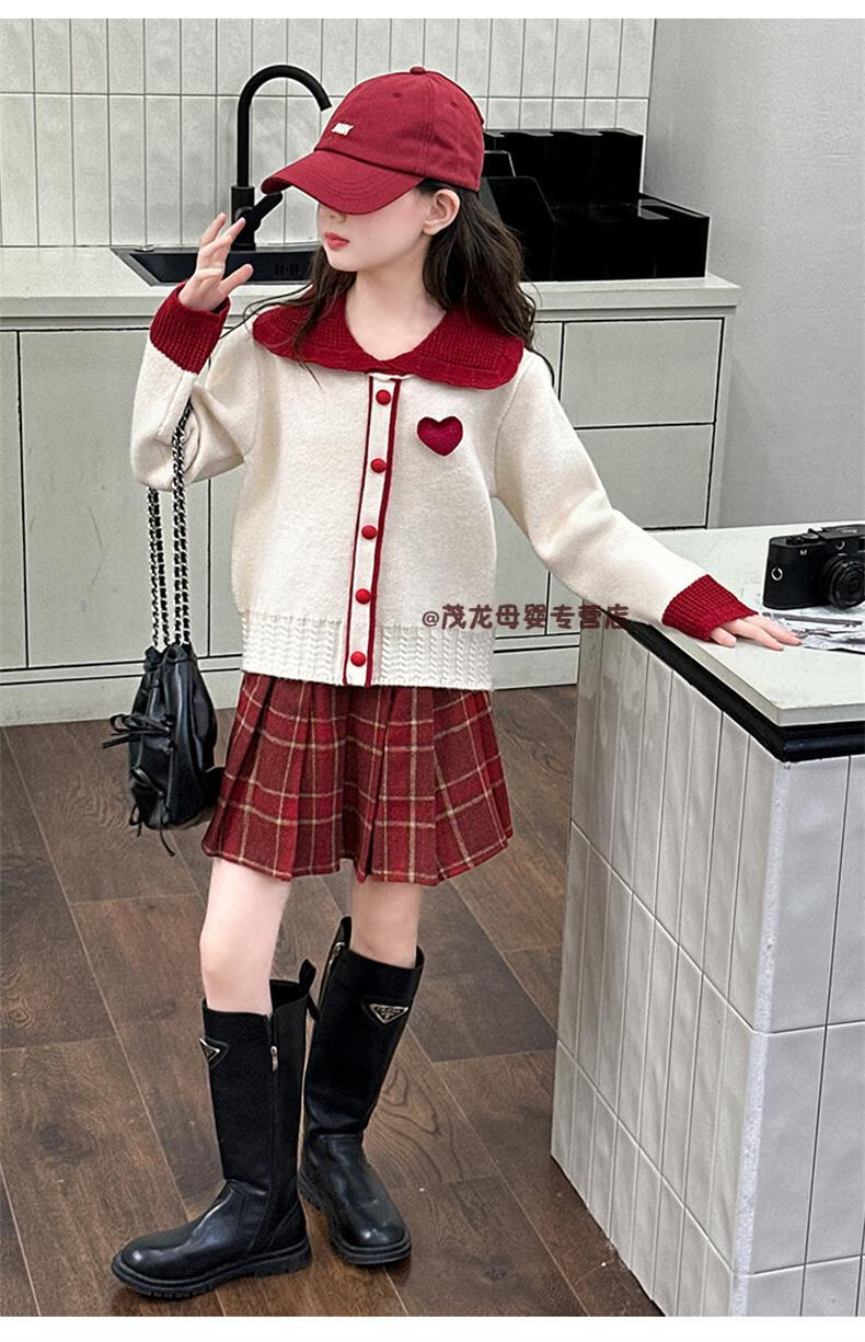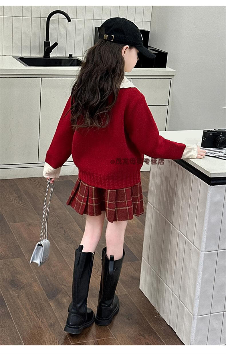 G.duck Girls Autumn and Winter Skirt New Year Suit 2026 New Children's Pleated Skirt Girls Big Children College Style New Year Clothes Suit Rice Sweater + Red Skirt 150 cm