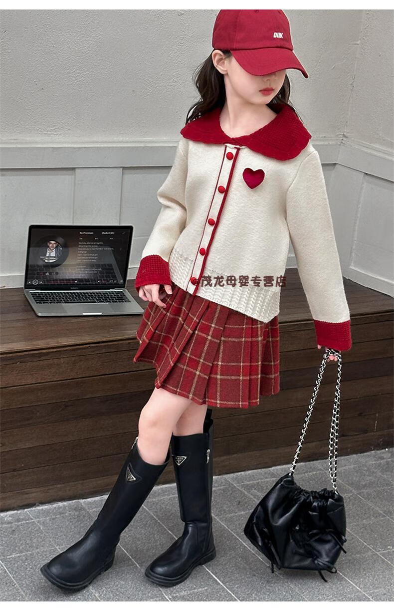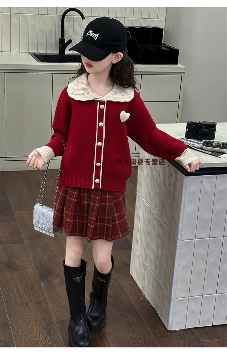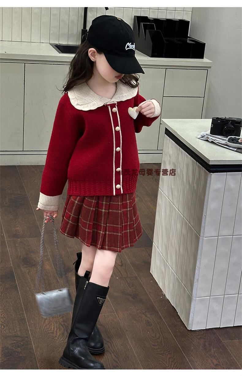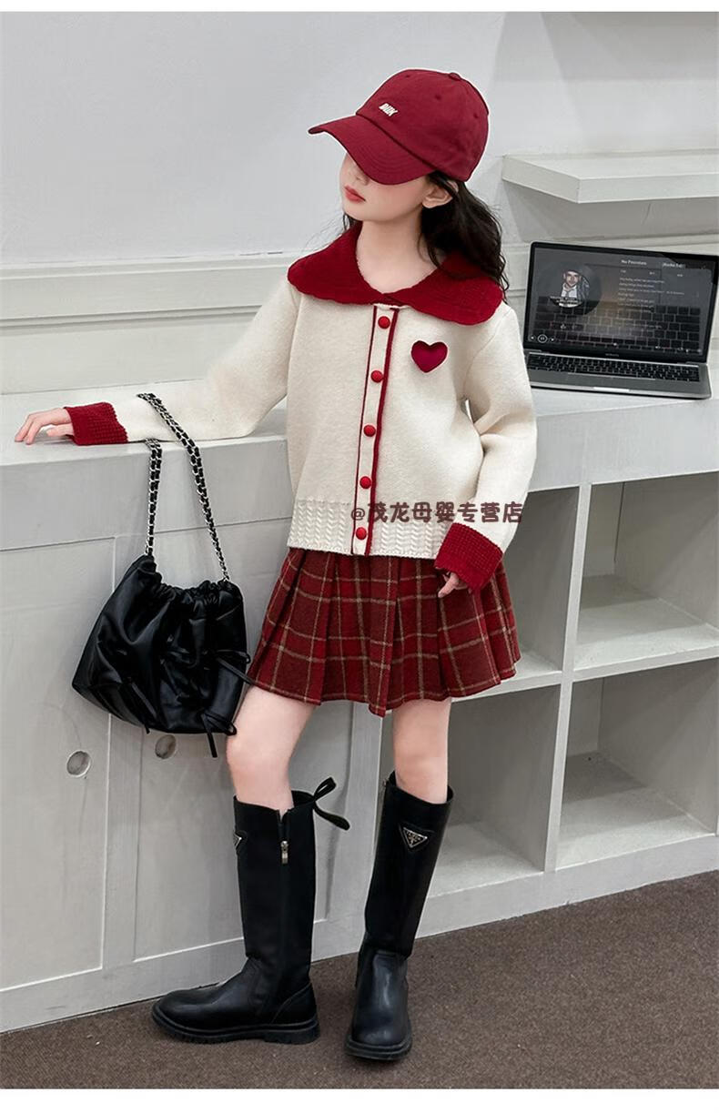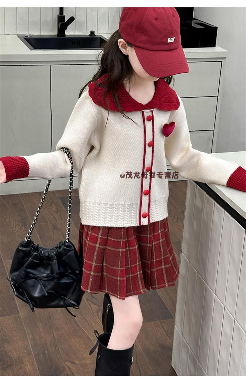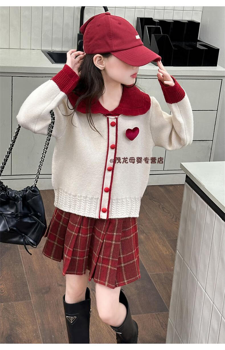 G.duck Girls Autumn and Winter Skirt New Year Suit 2026 New Children's Pleated Skirt Girls Big Children College Style New Year Clothes Suit Rice Sweater + Red Skirt 150 cm