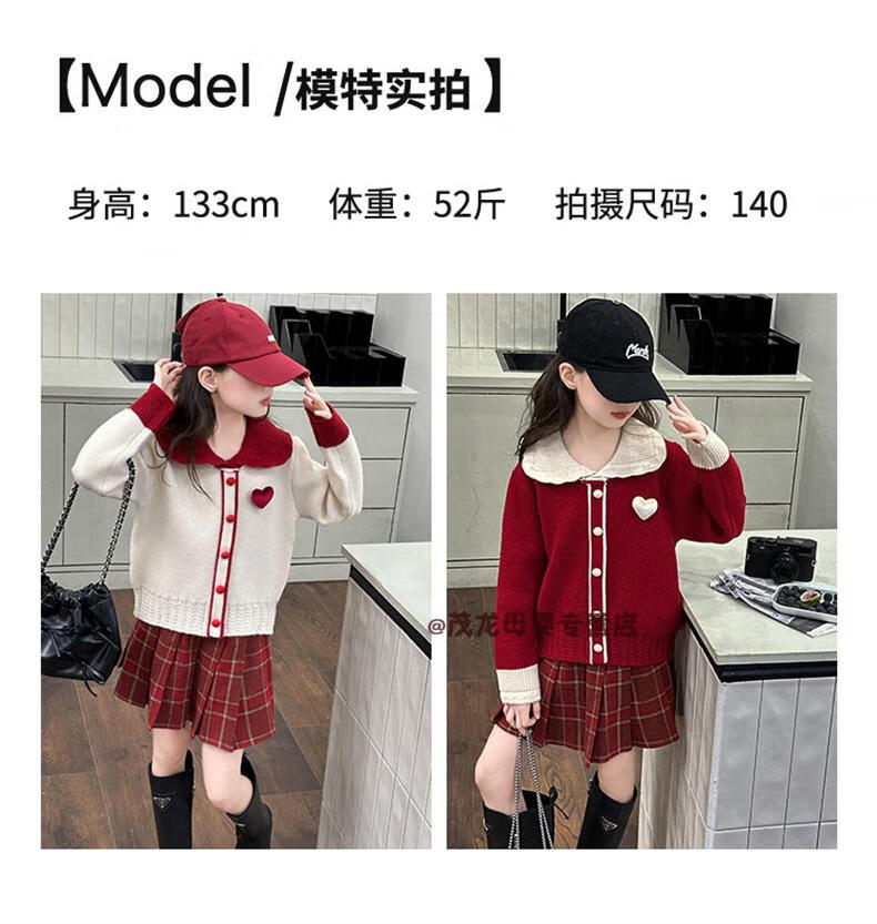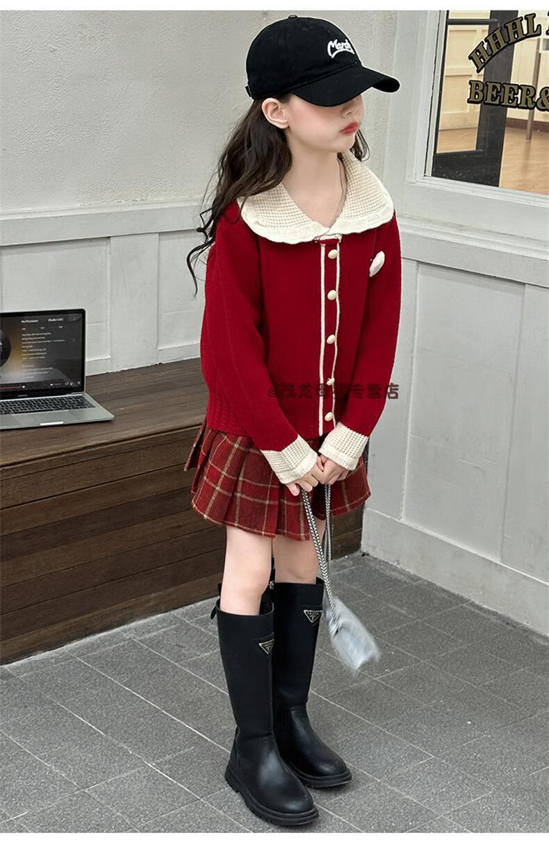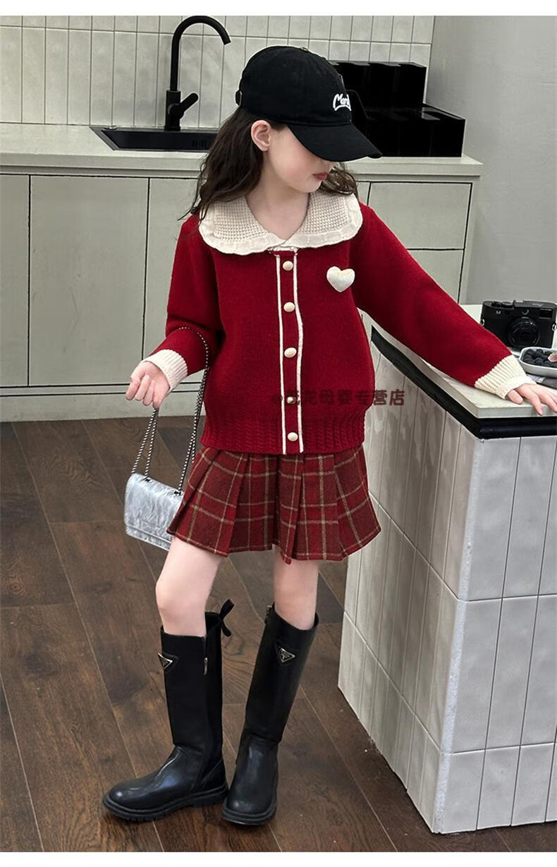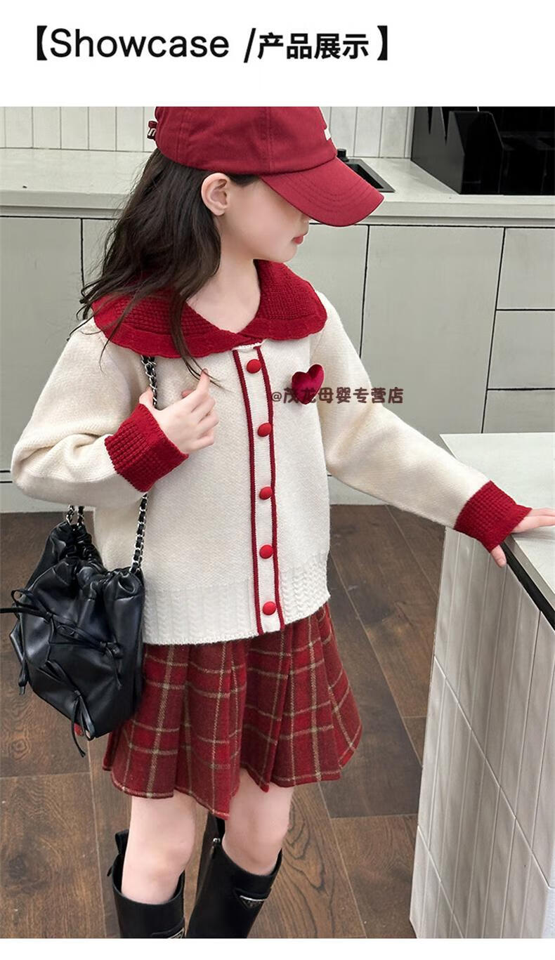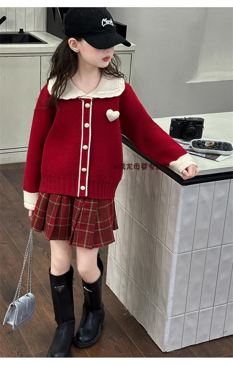G.duck Girls Autumn and Winter Skirt New Year Suit 2026 New Children's Pleated Skirt Girls Big Children College Style New Year Clothes Suit Rice Sweater + Red Skirt 150 cm