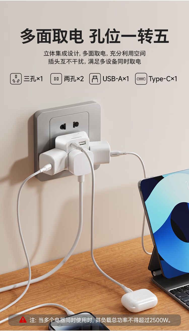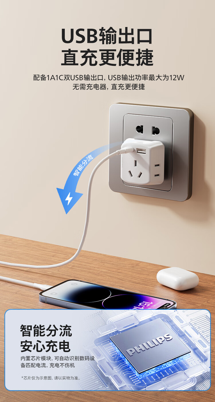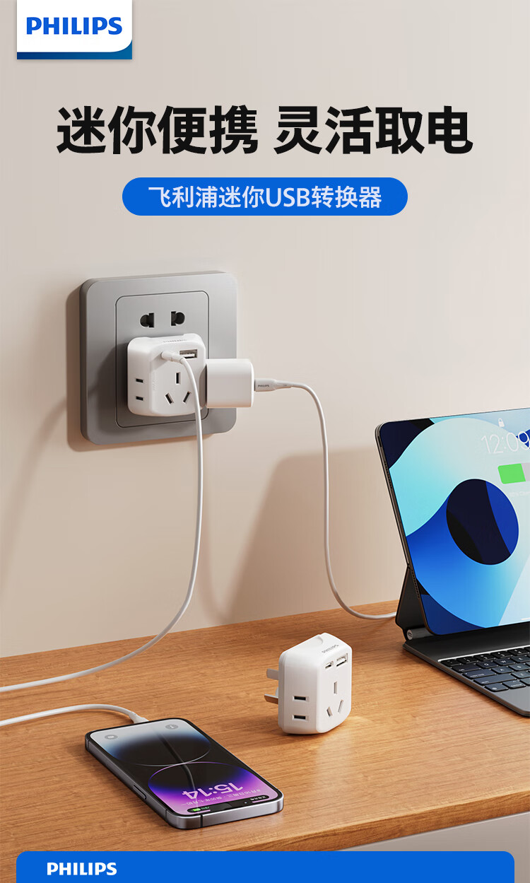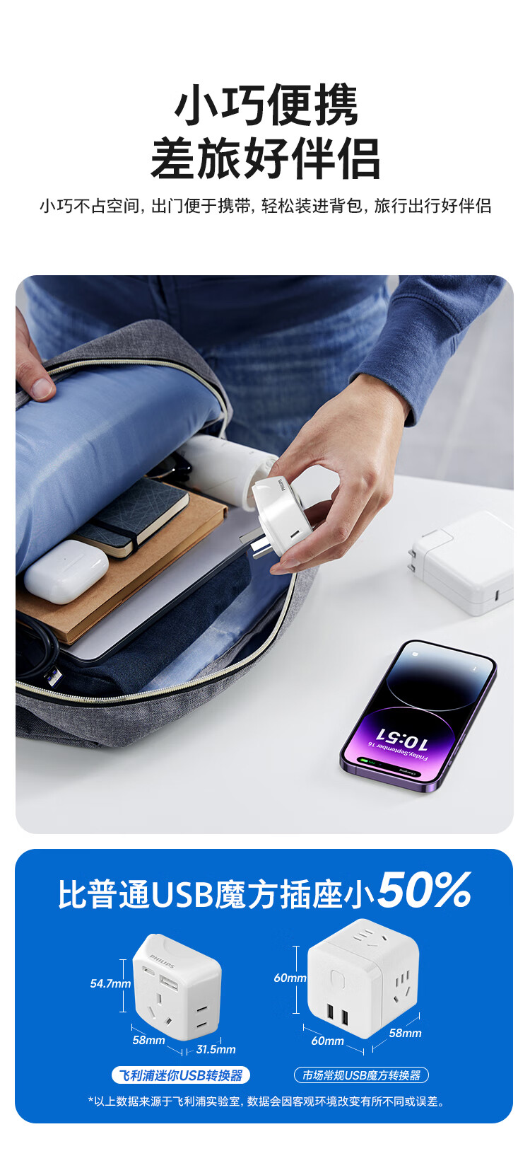 Philips (PHILIPS) Mini Rubik's Cube Socket One to Five Plug Converter Suitable for Bedroom, Kitchen and Bedroom Wireless Socket Converter/Extender Master Control 1 to 5 Mini USB Converter SPB4034