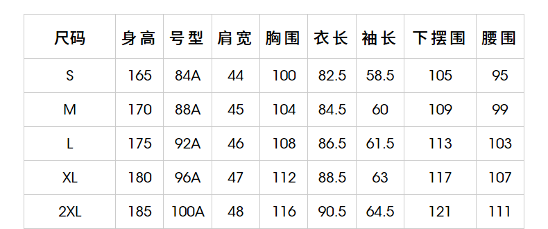 China (cm) 160-165/84-86 165-170 / 88-90 167-172 / 92-96 168-173 / 98-102 170-176 / 106-110