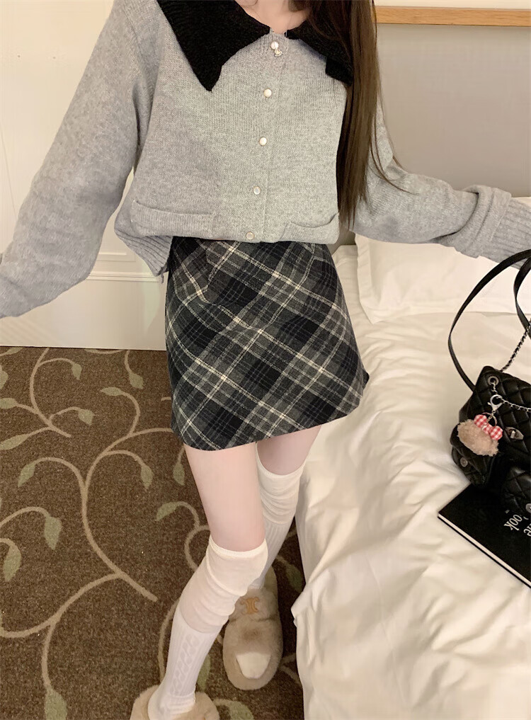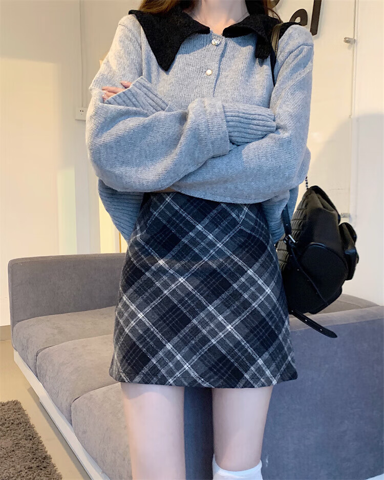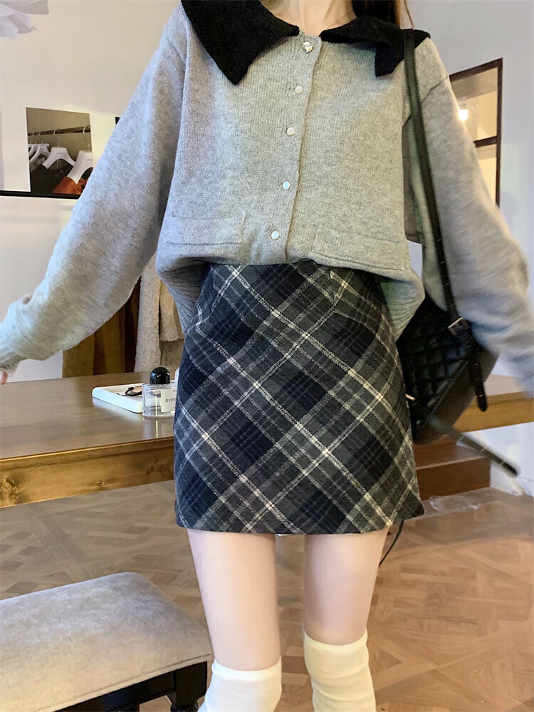 JIOESC Plaid Skirt Slightly Fat MM Short Skirt Autumn and Winter Retro Versatile Women's High Waist A-Line Plaid Hip Skirt Pear Shape Body Blue Gray Plaid Skirt M Recommended weight is about 95-110 Jin Jin is equal to 0.5 kg