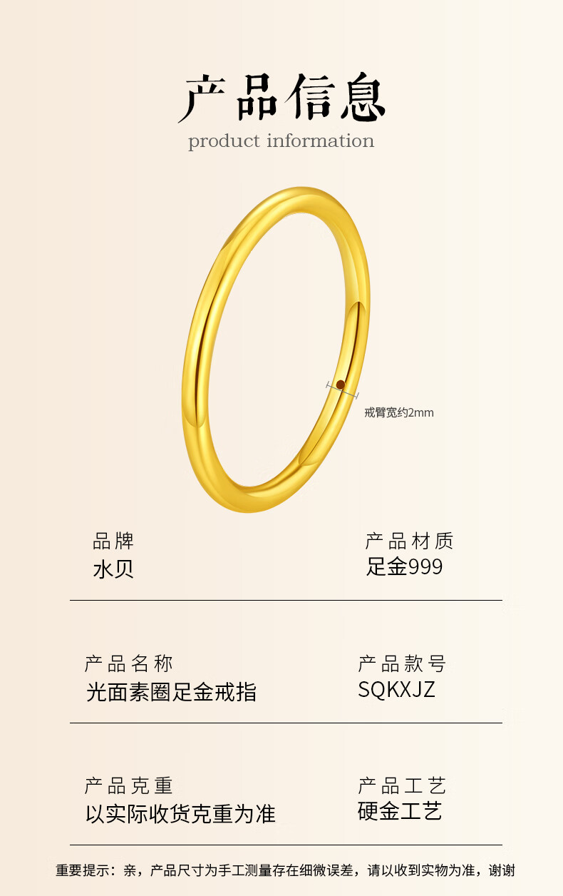Shuibei pure gold 999 glossy plain ring with closed mouth and hollow ring for women. Give it to your wife as a holiday gift for best friends. The ring mouth is 14# gold and weighs about 0.3 grams + more money will be refunded or less compensation.
