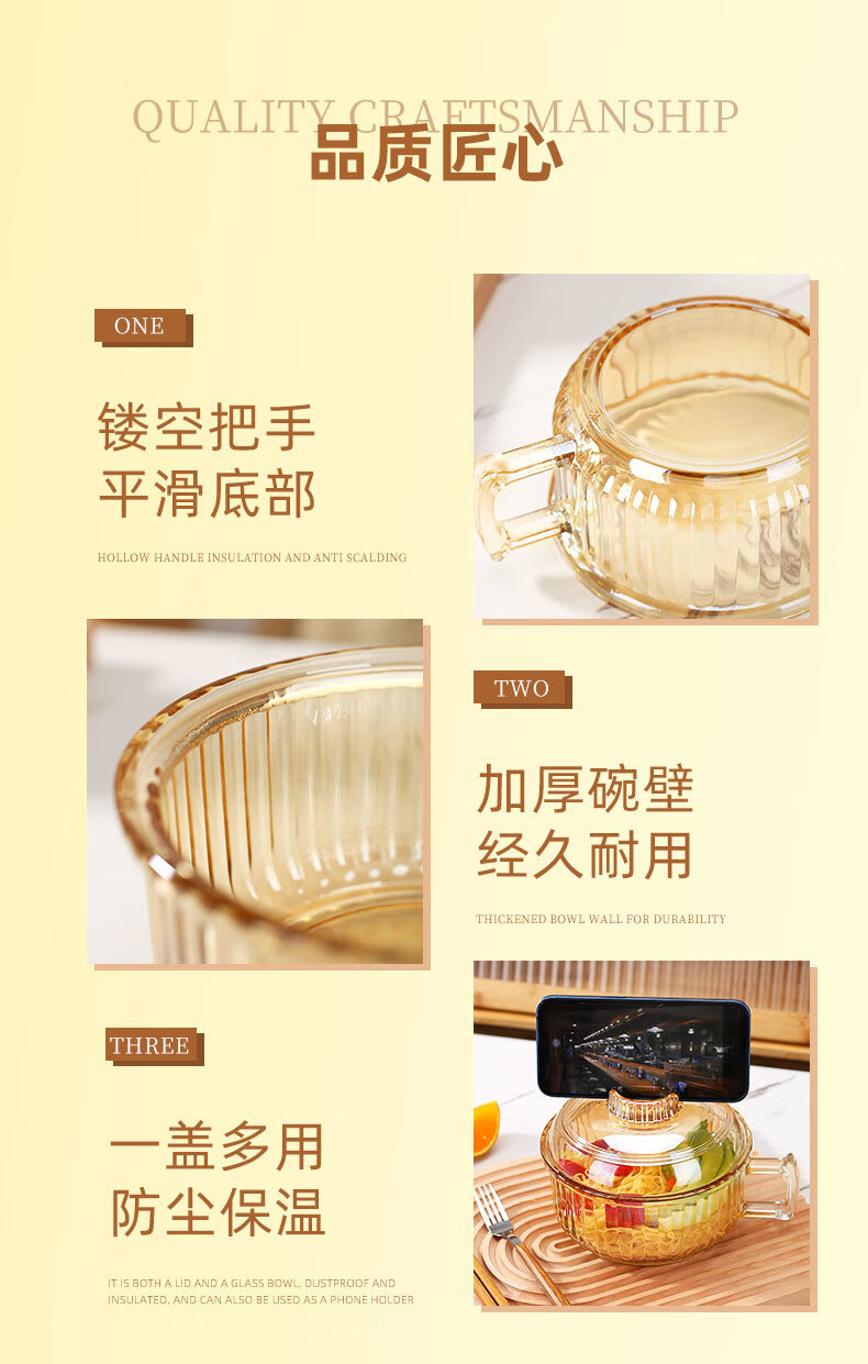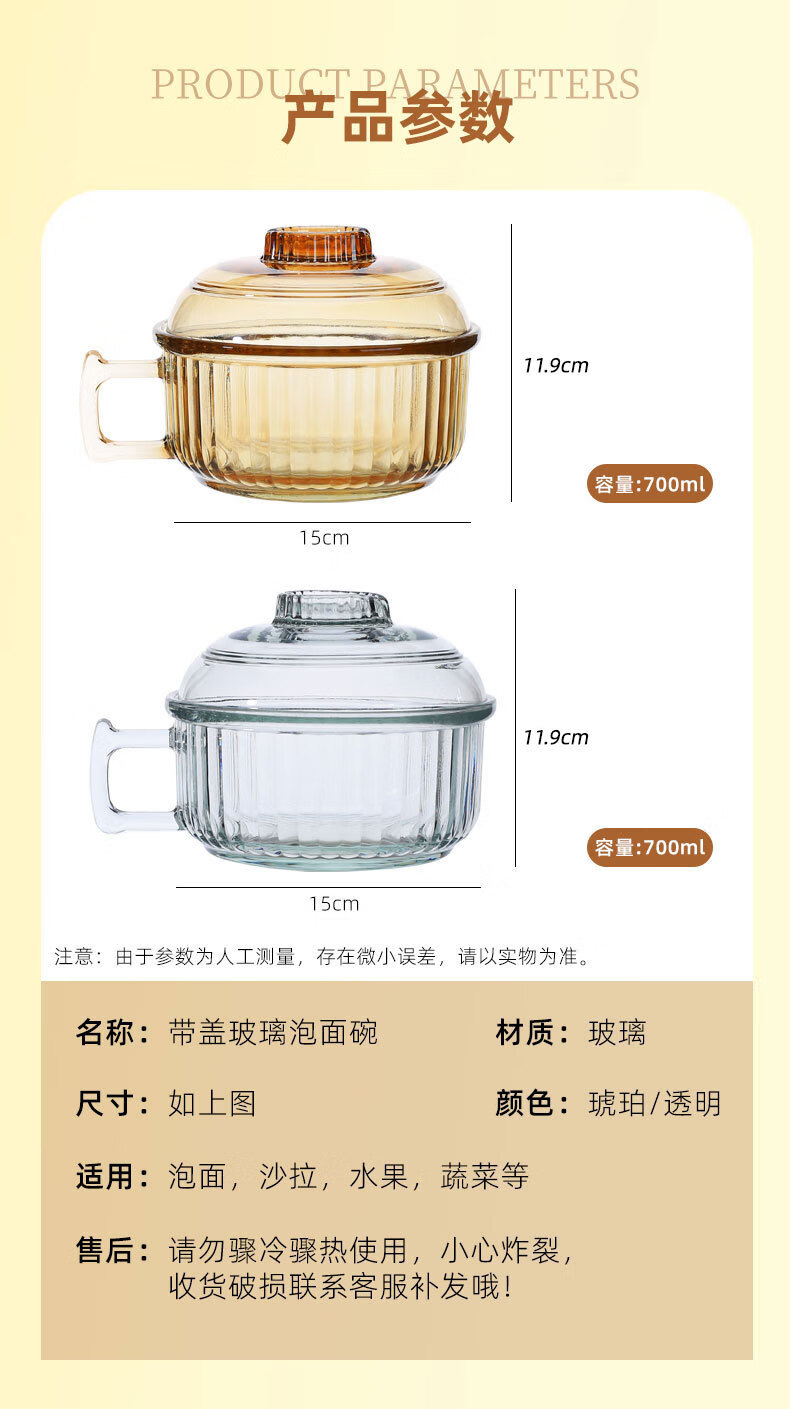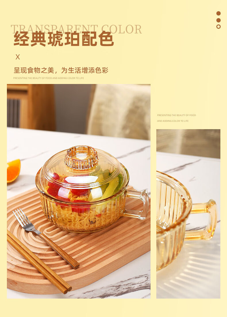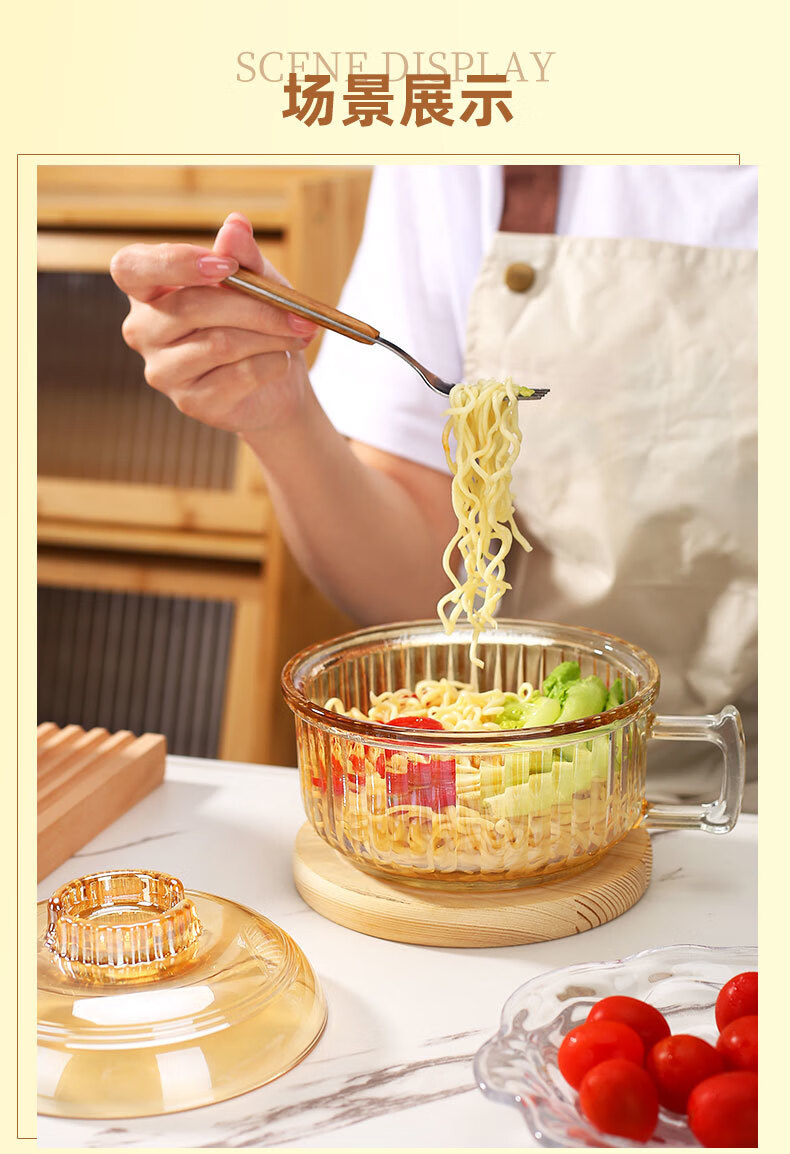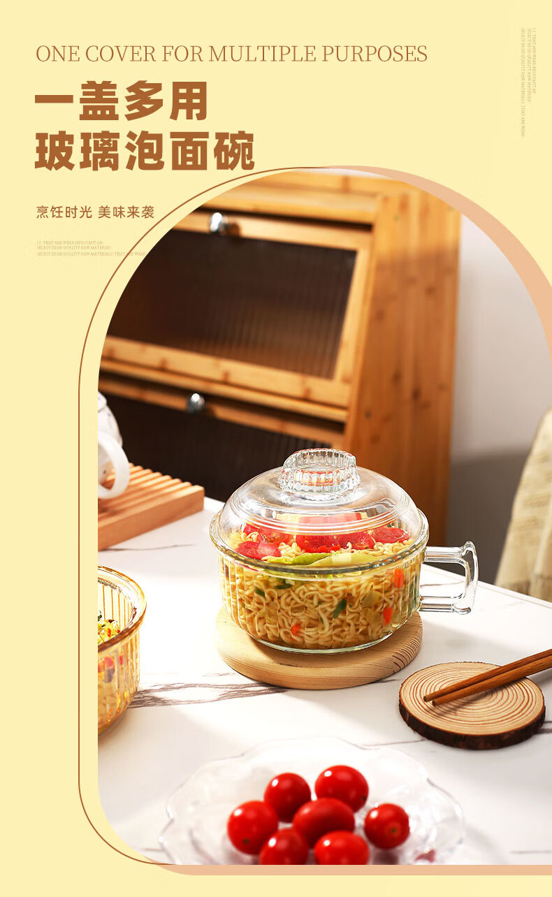 Detif instant noodle glass bowl with handle, anti-scalding, household ins high-looking, large-capacity transparent instant noodle bowl with lid, 1 pack, transparent color* instant noodle bowl, 70000cm L+ with lid (school season)