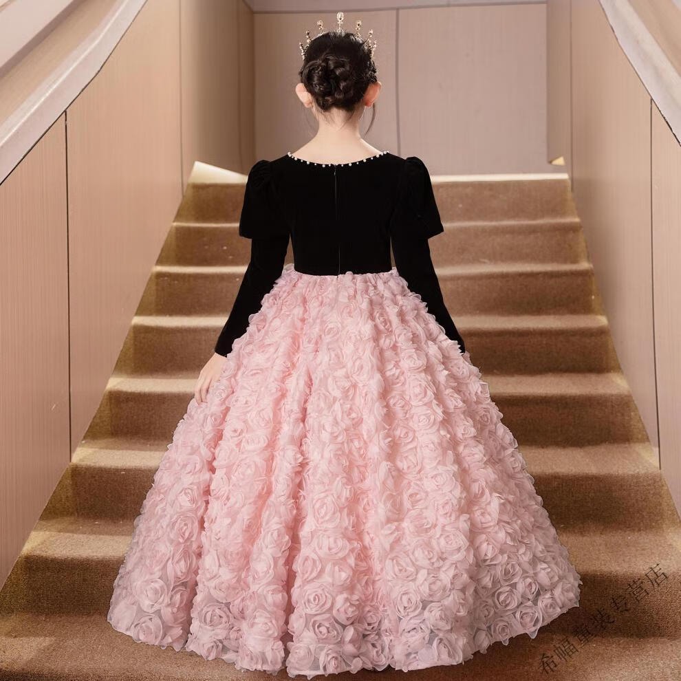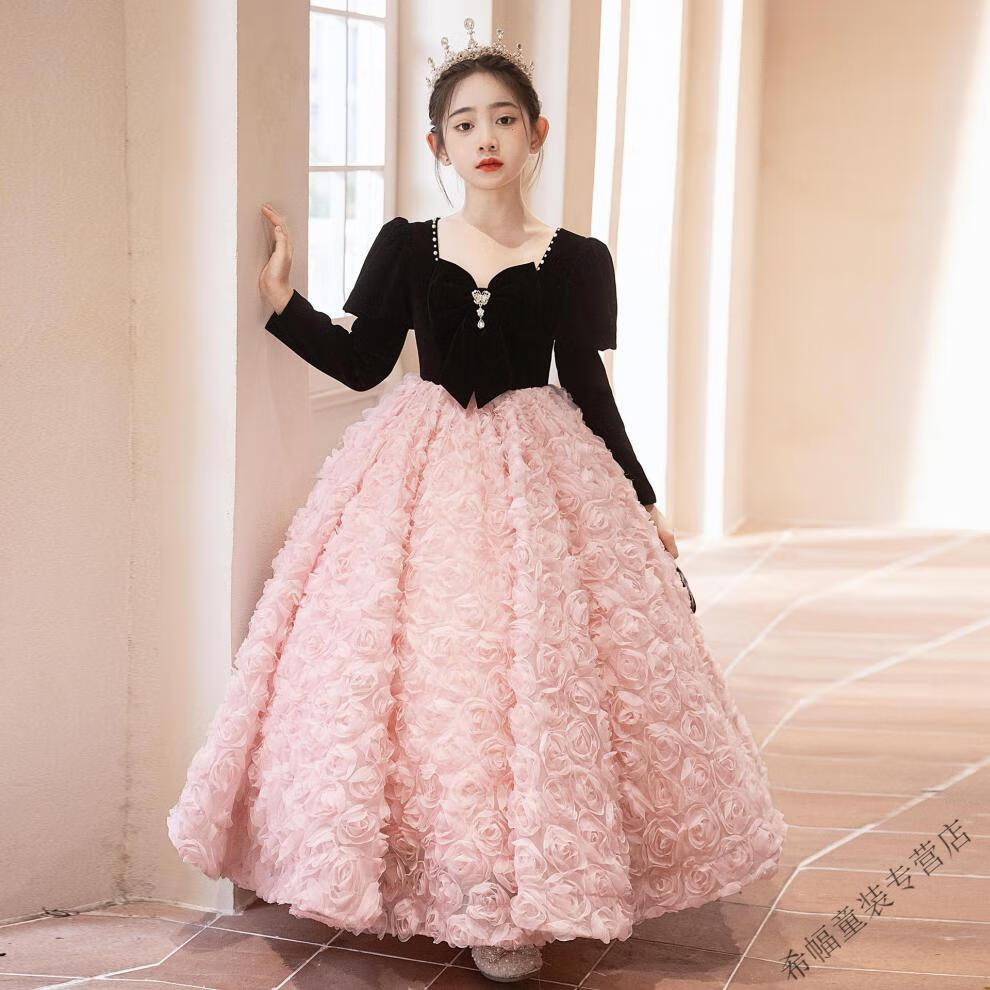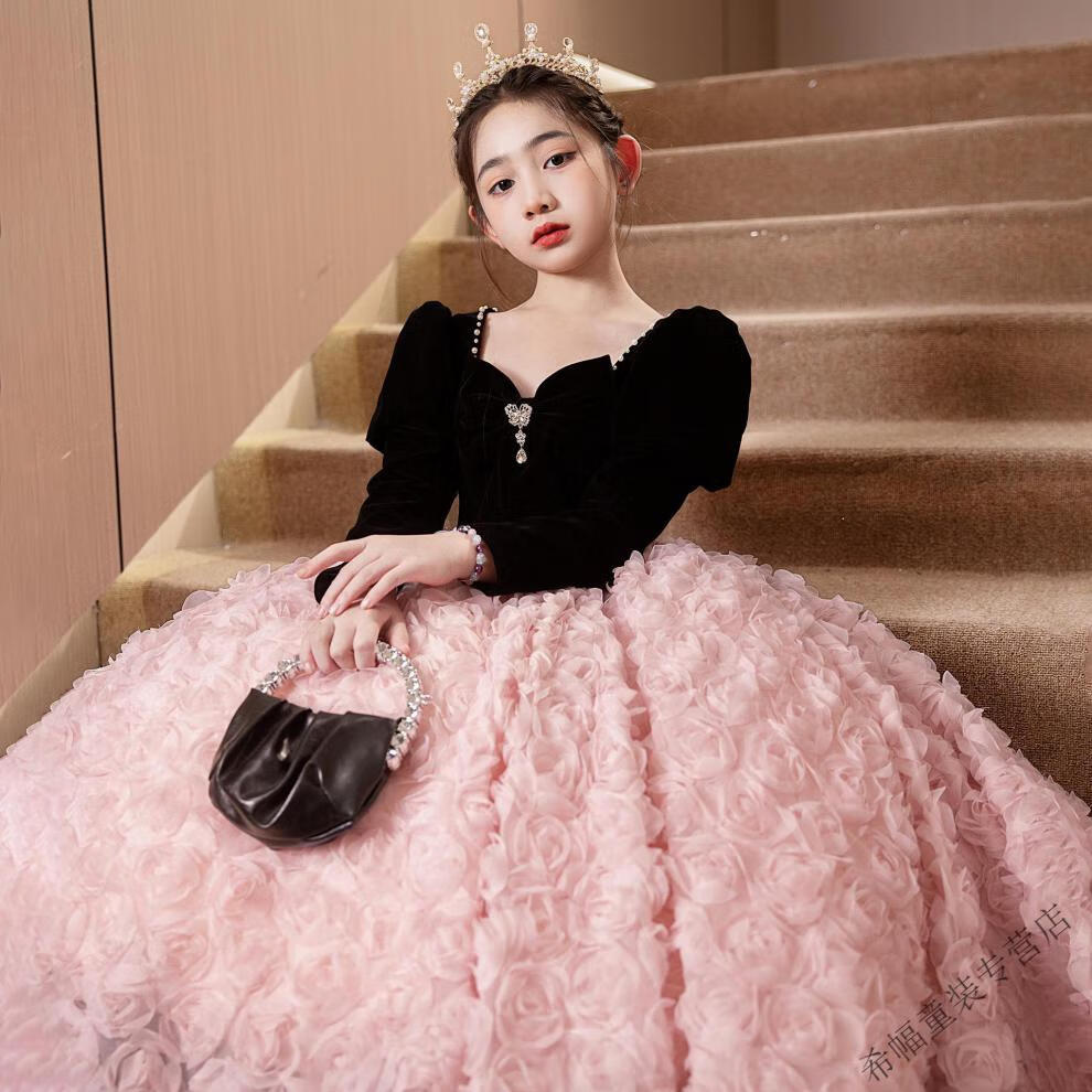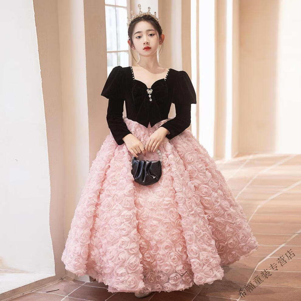 G.duck girls evening dress light luxury niche high-end host autumn and winter birthday princess dress children piano performance pink short plus velvet thickening 100 height 90-95cm age 3-4 years old