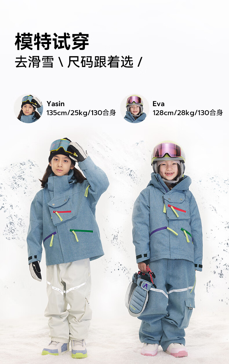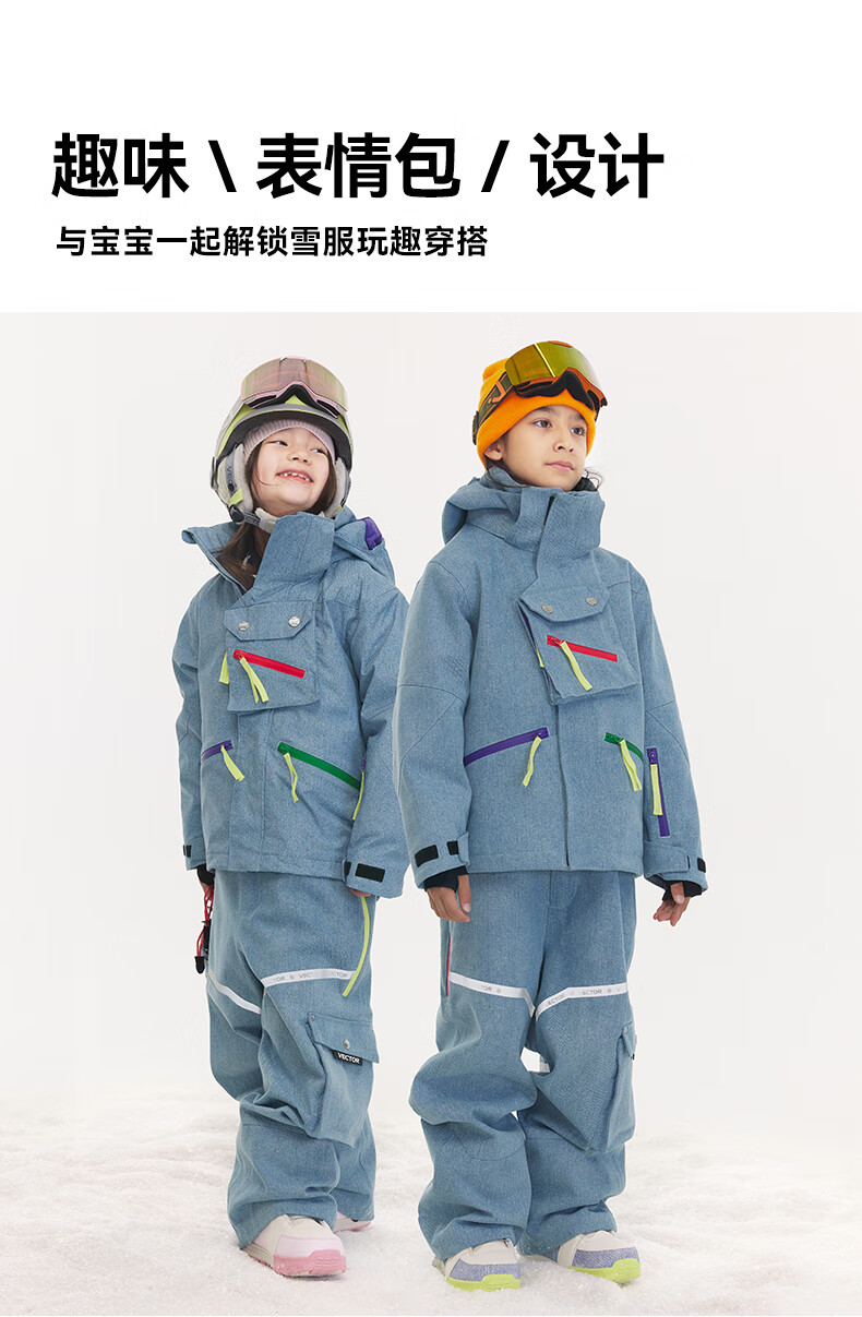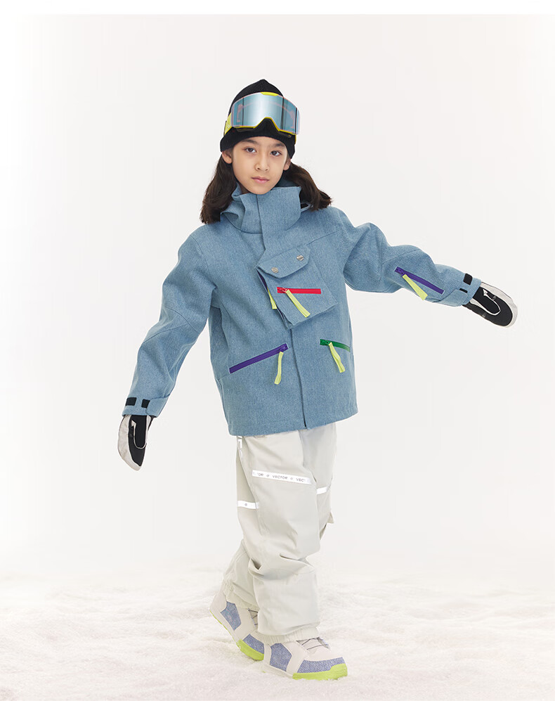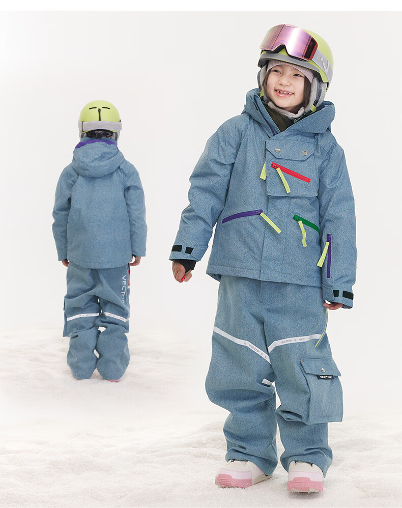 Vector children's ski suit, ski suit, boys and girls, warm, thickened, waterproof ski overalls, breathable, light blue denim + snow mountain white pants, same style for men and women 120