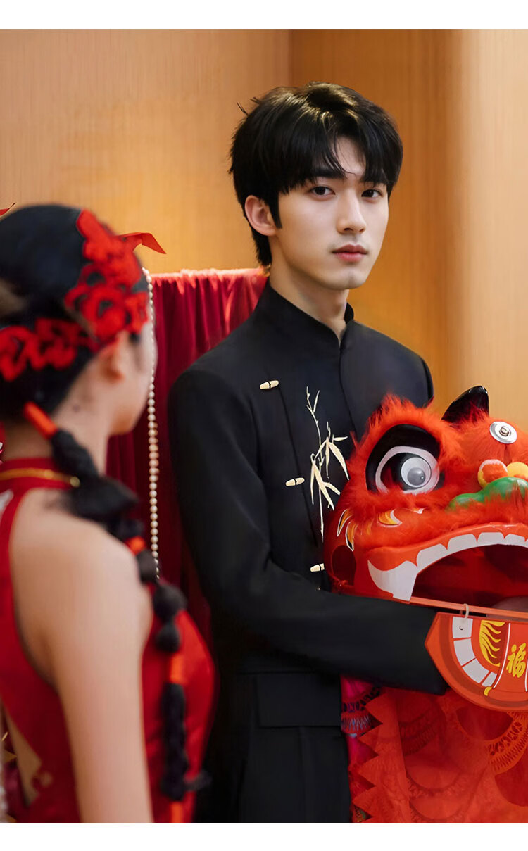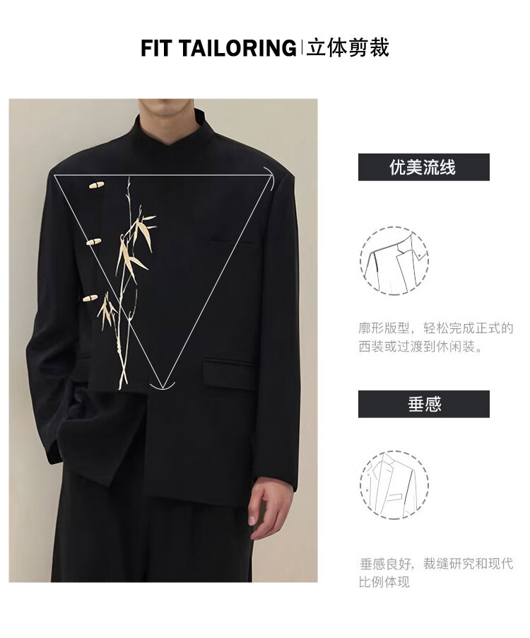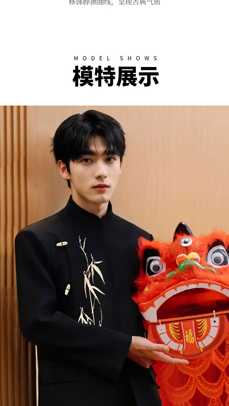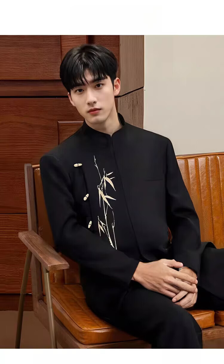 Pierre Cardin New Chinese Style Light Luxurious Bamboo Embroidered Suit Suit Men's Handsome Groom Wedding Engagement Dress Suit Knitted Black Two-piece Set Top + Pants M