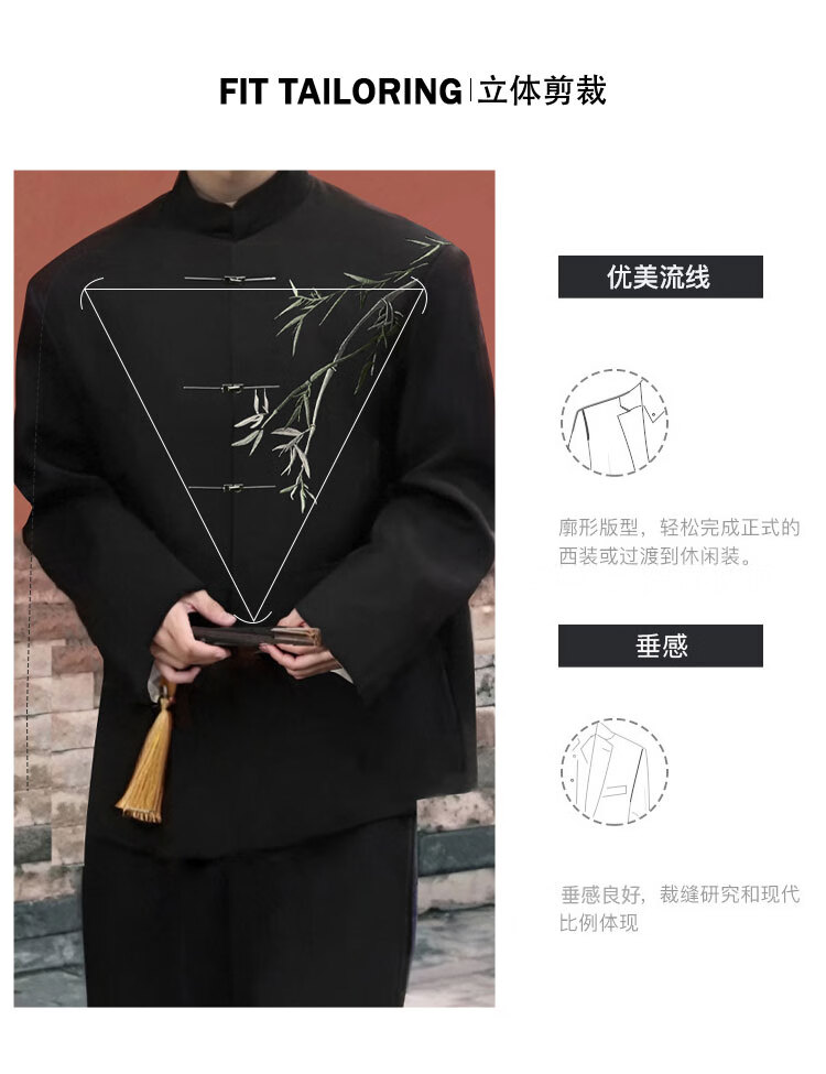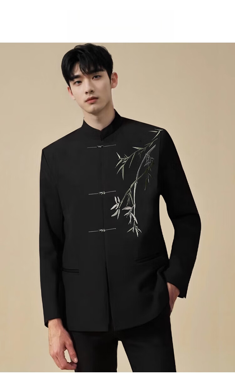 Pierre Cardin New Chinese Bamboo Embroidery Suit Men's Groom Wedding Engagement Stand Collar Banquet Dress Suit Knitted Black Two-piece Set Top + Pants L