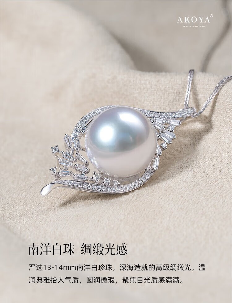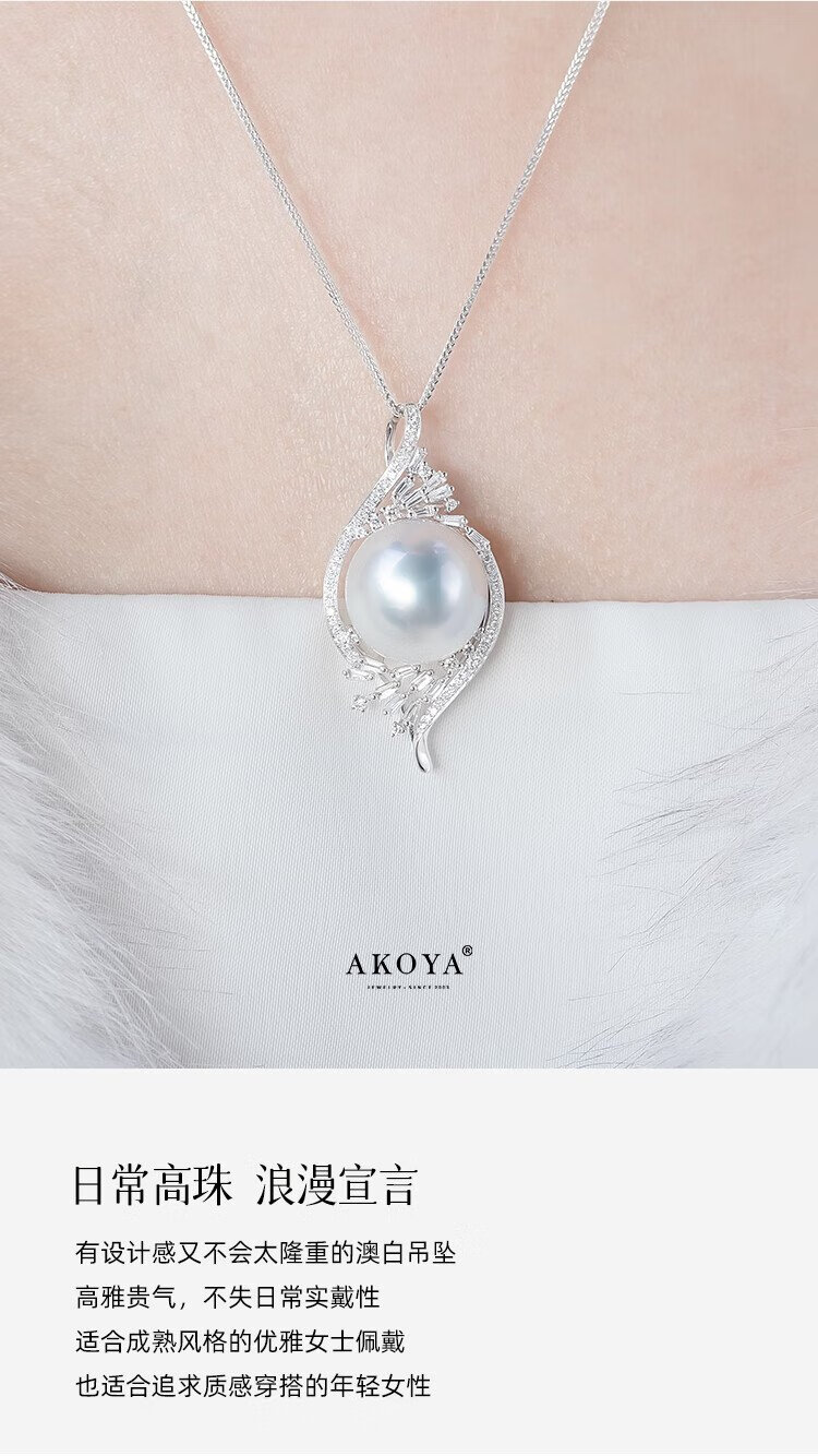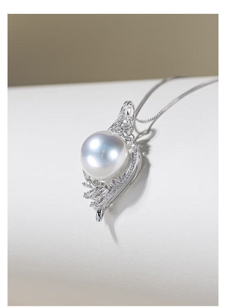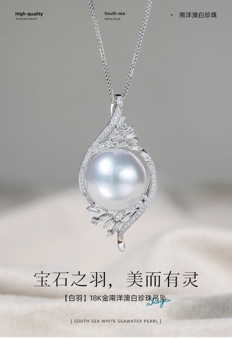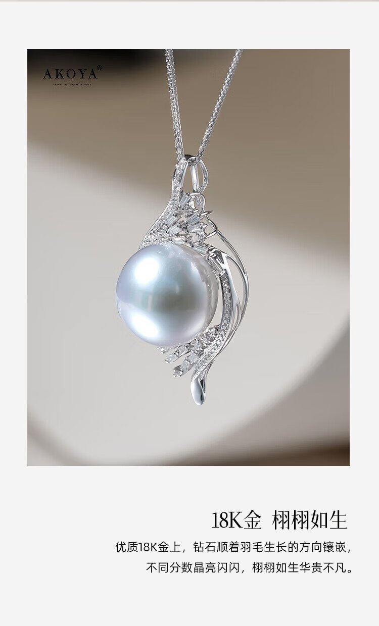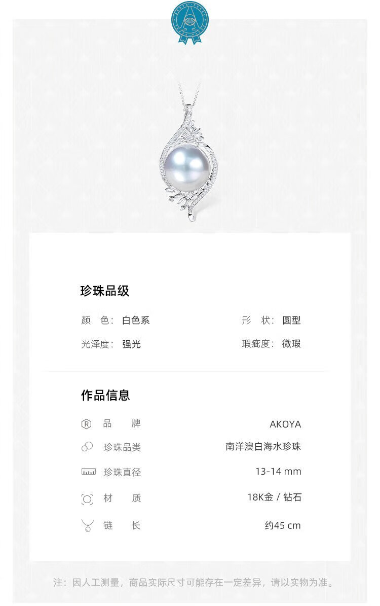 AKOYA Nanyang Australian White Seawater Pearl Pendant White Feather 18K Gold Diamond 13-14 Light Luxury and Noble Gift for Wife 2096 18K Gold White Gold 13-14mm