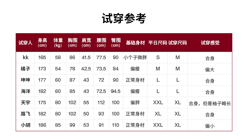 China (cm) 165 / 88-90 170 / 96-98 175 / 108-110 180 / 118-122 185 / 126-130
