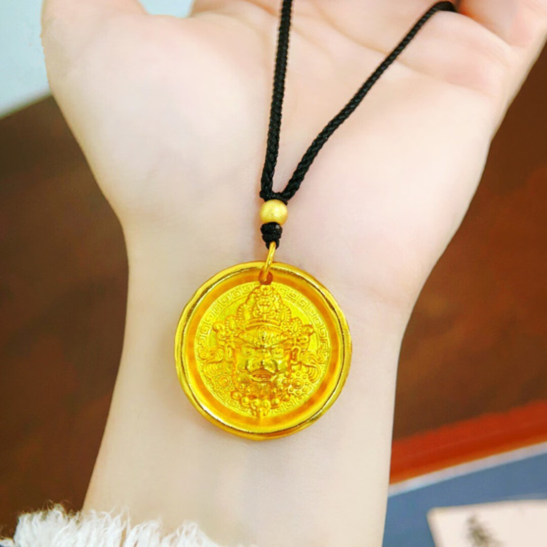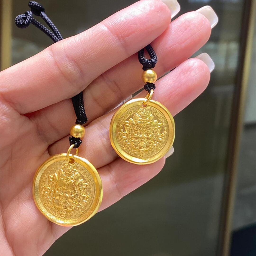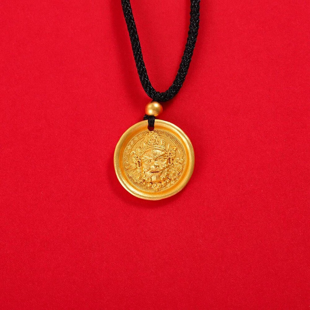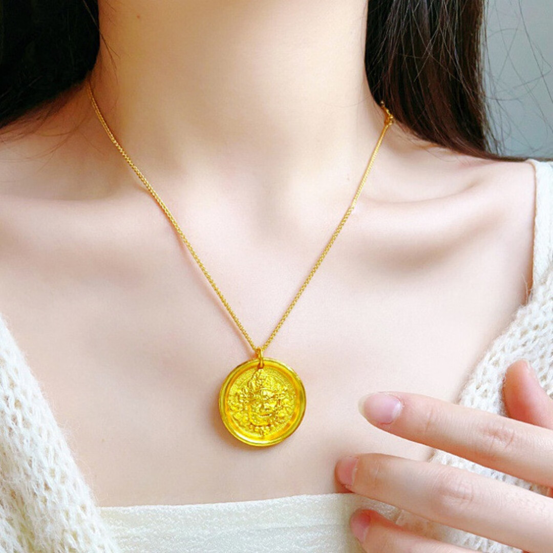 Muqian gold-coated silver-coated ancient yellow God of Wealth pendant rope for men and women, 5D gold-coated silver round brand lucky sweater chain, weighted yellow God of Wealth pendant, free black rope, gold-coated about 0.