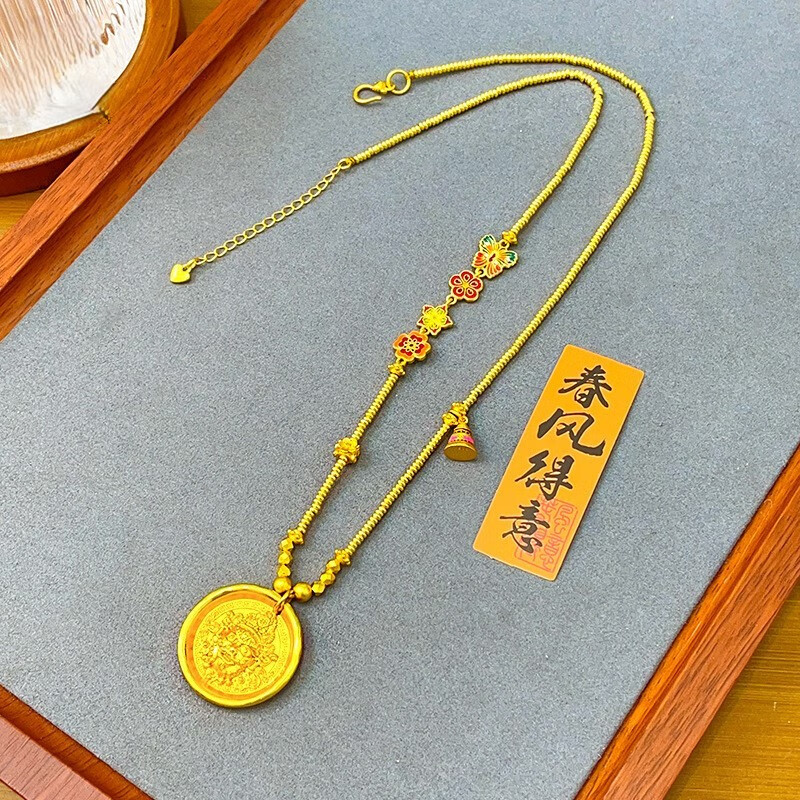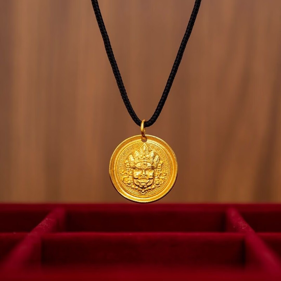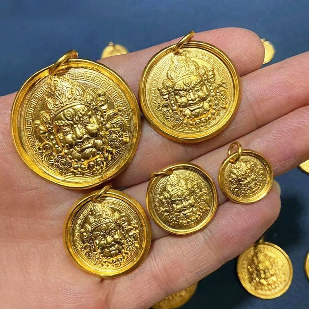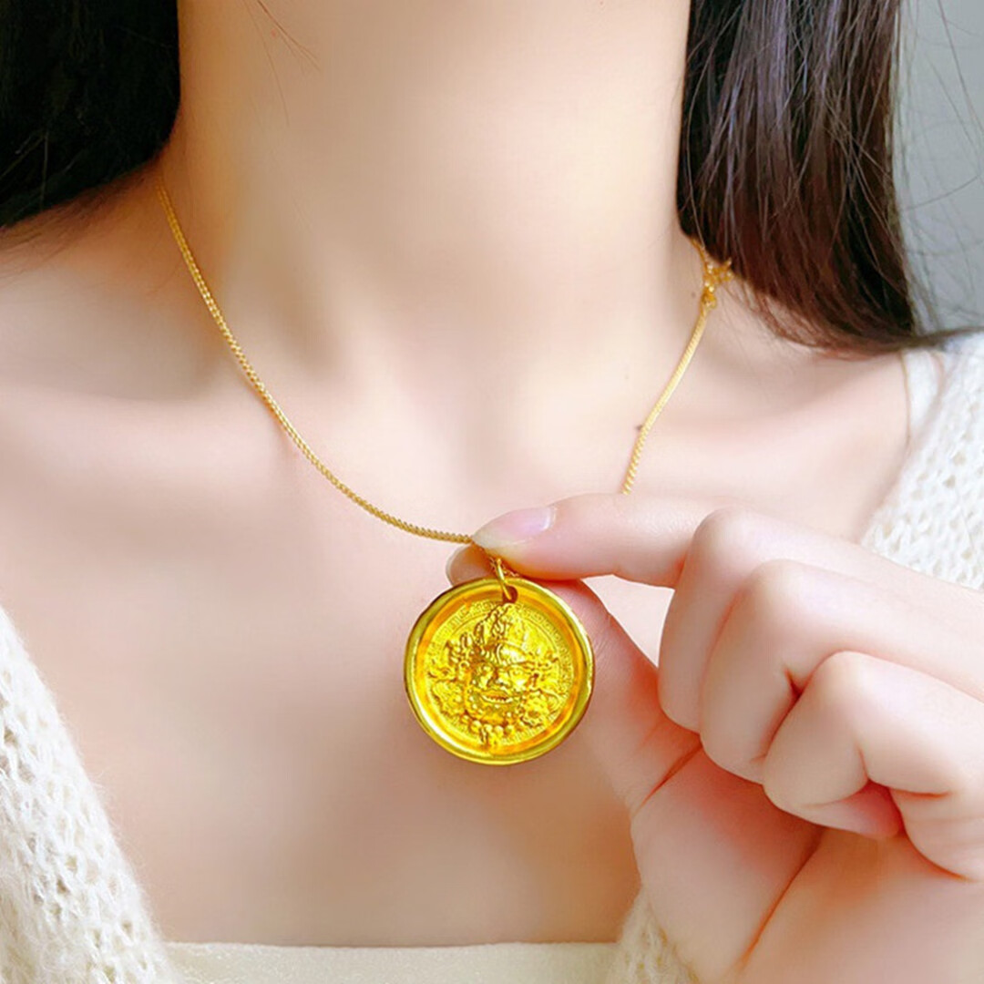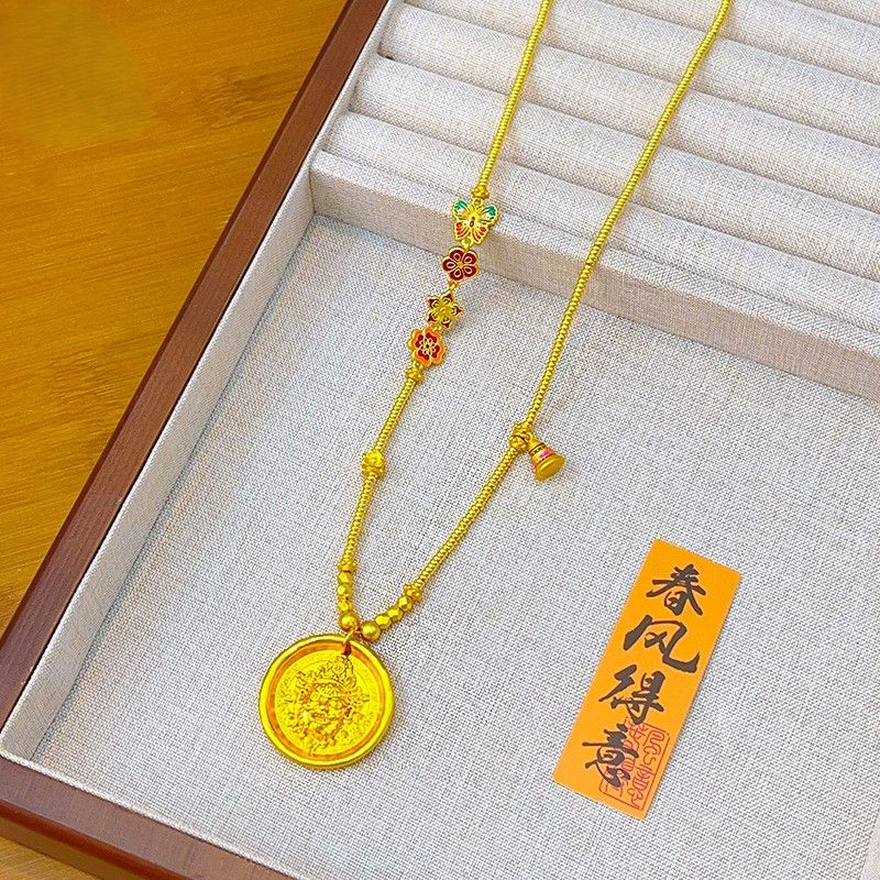 Muqian gold-coated silver-coated ancient yellow God of Wealth pendant rope for men and women, 5D gold-coated silver round brand lucky sweater chain, weighted yellow God of Wealth pendant, free black rope, gold-coated about 0.