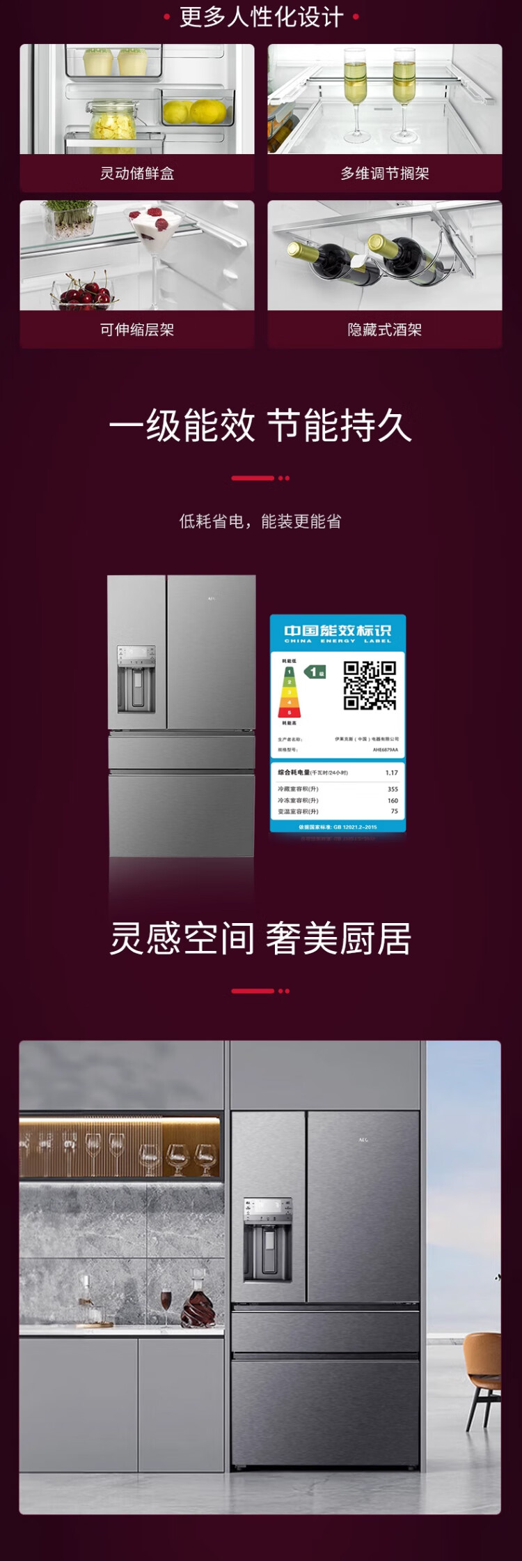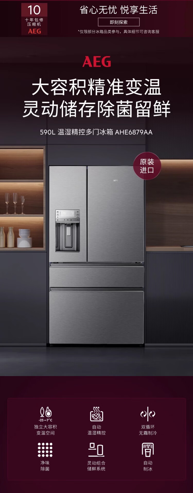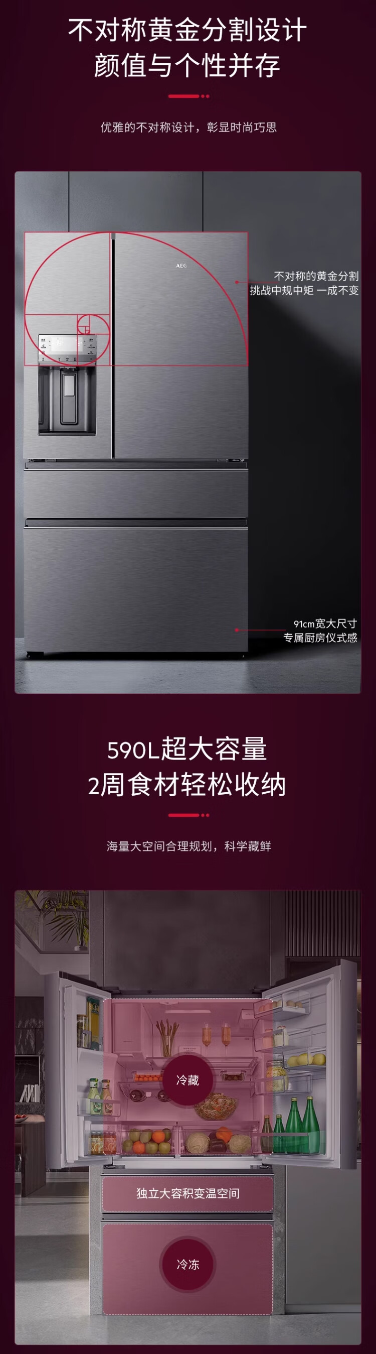 AEG complete machine original imported French double cycle refrigerator variable frequency air-cooled frost-free energy-saving 590L large capacity precise temperature control 75L variable temperature space automatic ice making three-in-one AHE6879AA