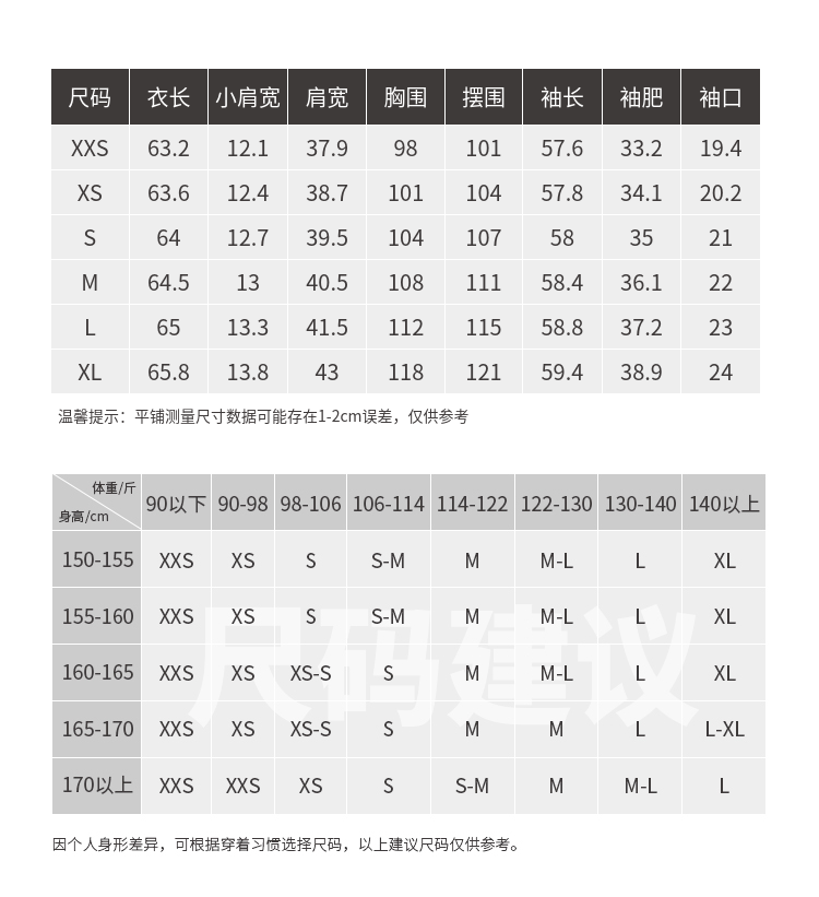 China (cm) 160-165/84-86 165-170 / 88-90 167-172 / 92-96 168-173 / 98-102 170-176 / 106-110