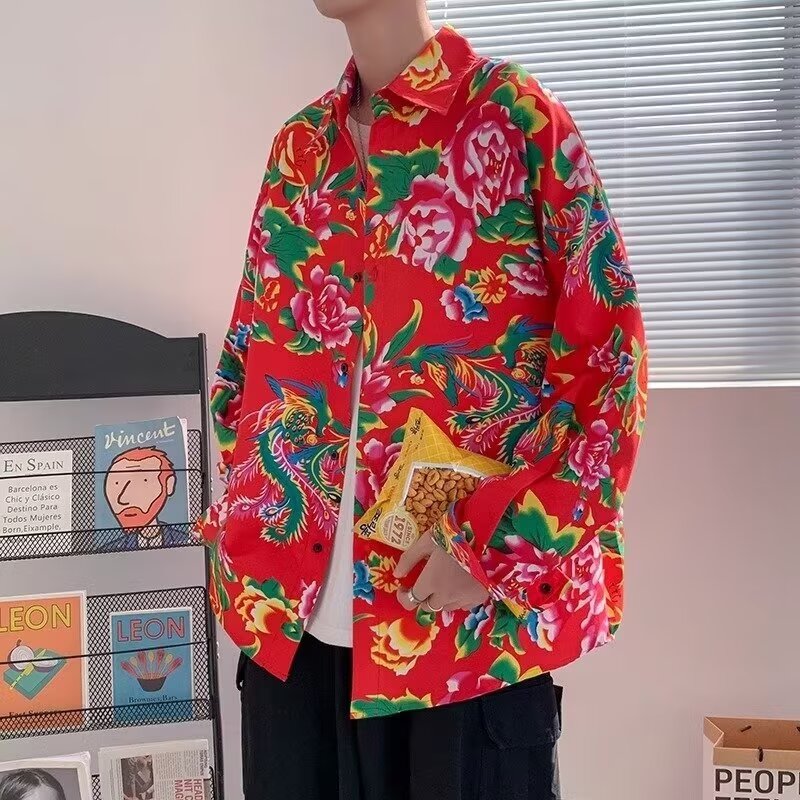 Northeast large flower shirt peony flower shirt men's 2025 spring trend Hong Kong style shirt jacket couple casual top classic 2507 red 3XL