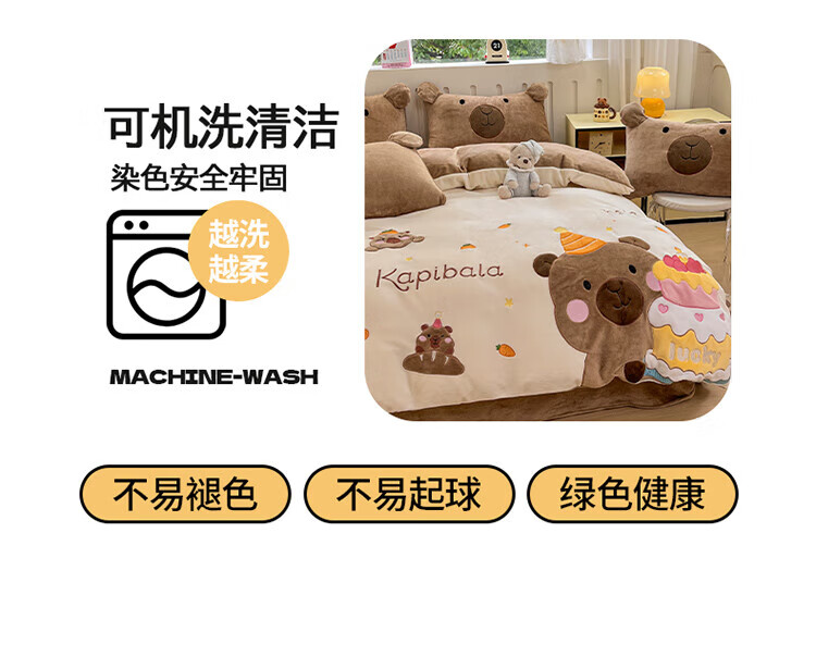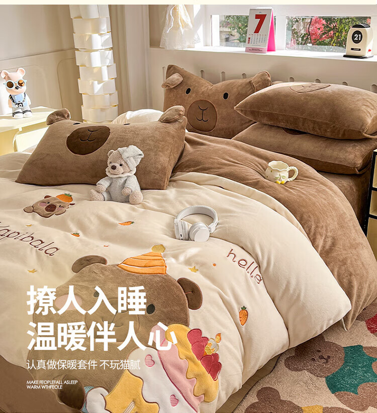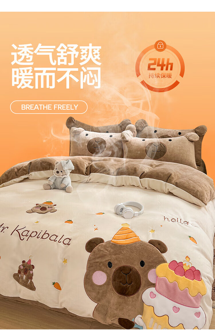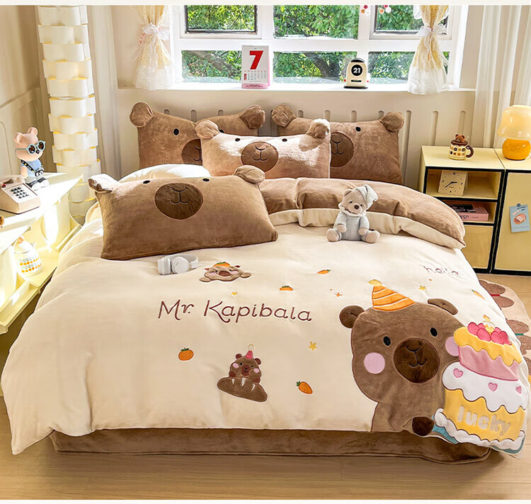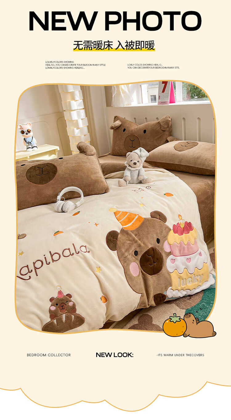 Thickened warm milk velvet four-piece children's cartoon bed sheet quilt cover coral velvet quilt cover Kapibara winter Kapibara Class A anti-static non-shedding 1.8m bed sheet four-piece set quilt cover 200x230