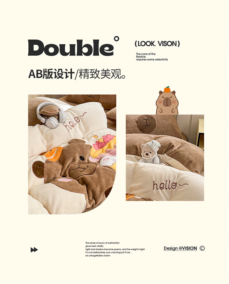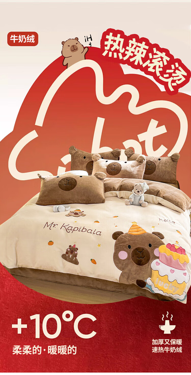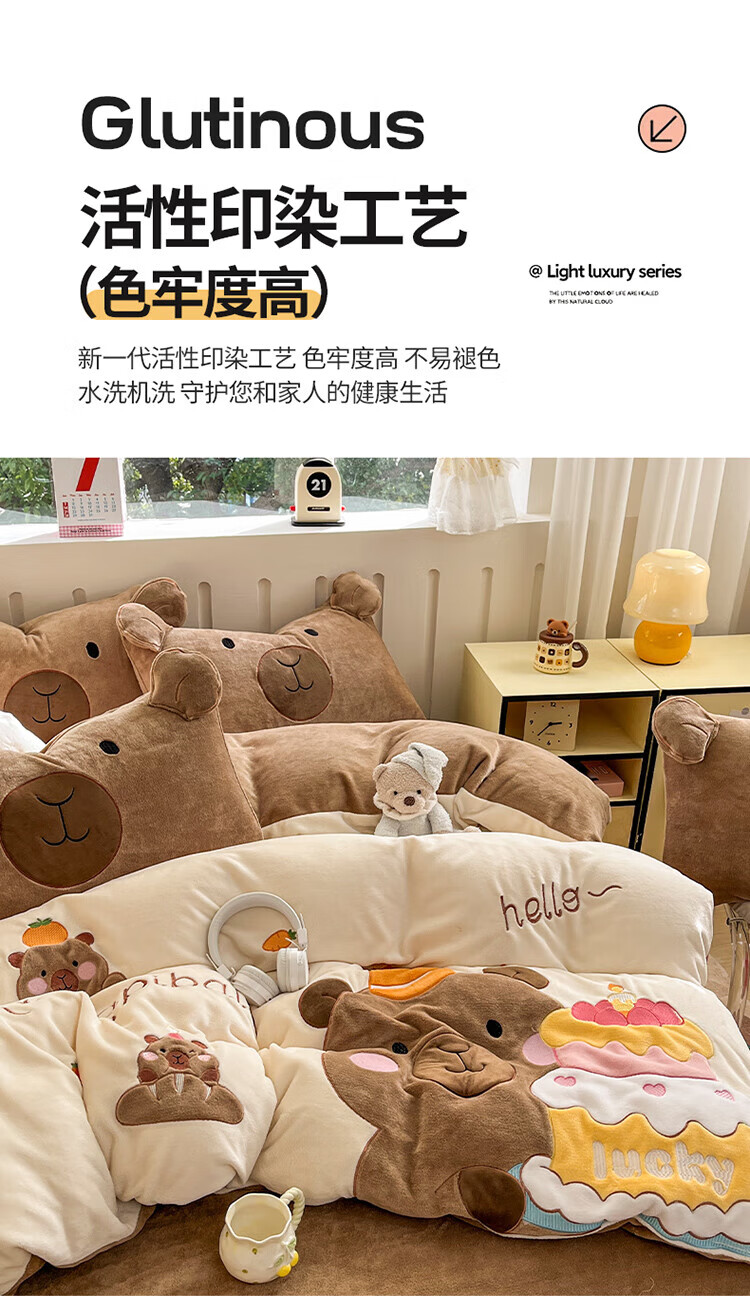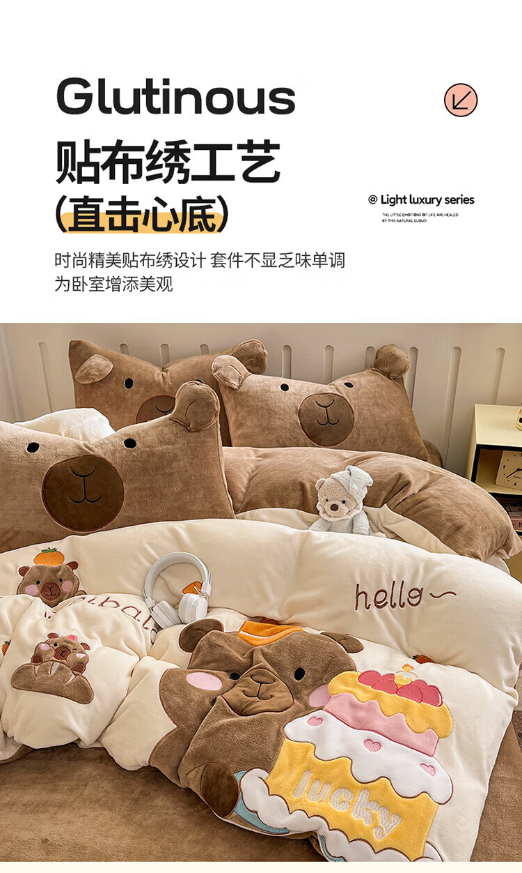 Thickened warm milk velvet four-piece children's cartoon bed sheet quilt cover coral velvet quilt cover Kapibara winter Kapibara Class A anti-static non-shedding 1.8m bed sheet four-piece set quilt cover 200x230