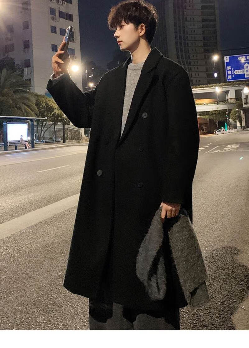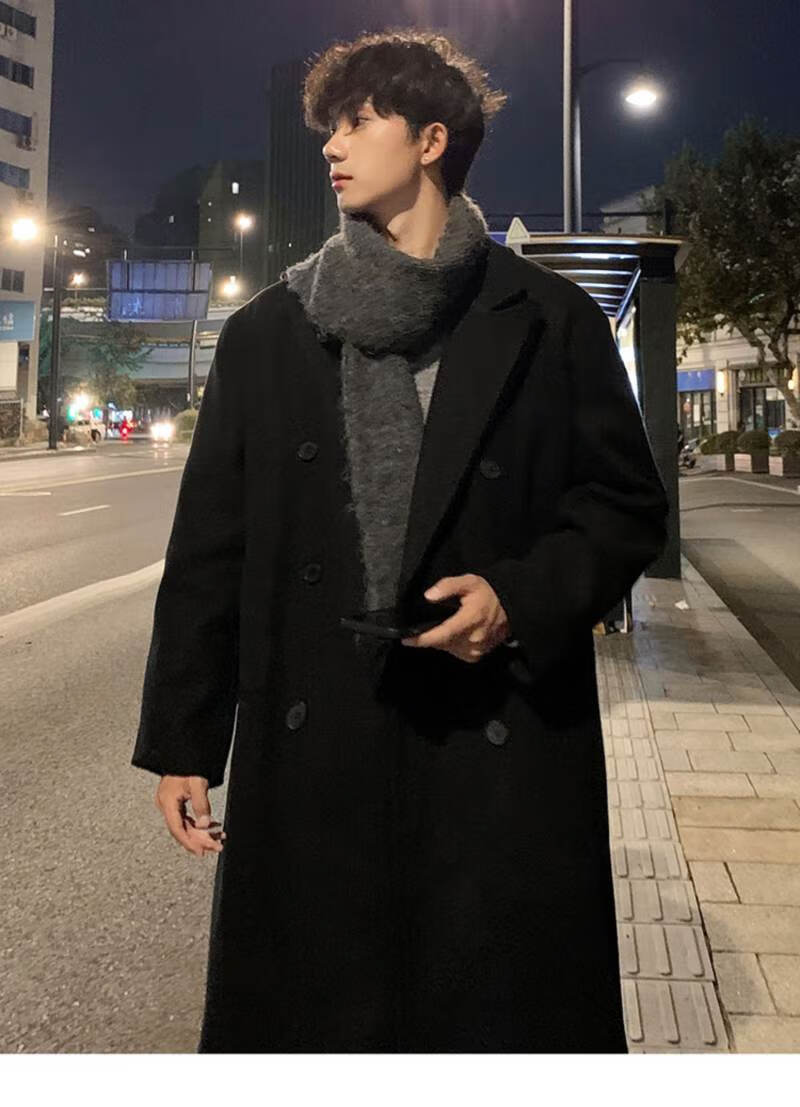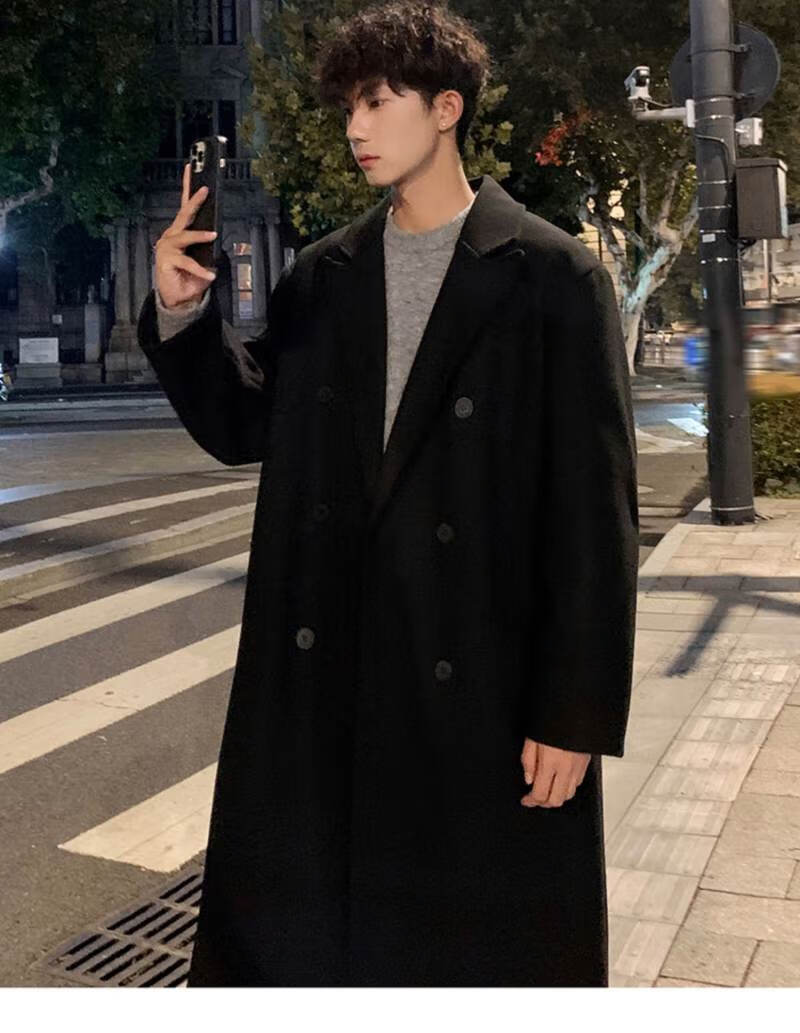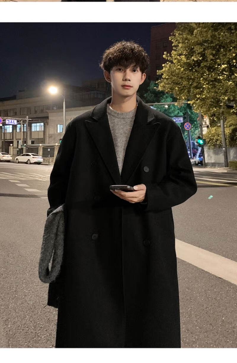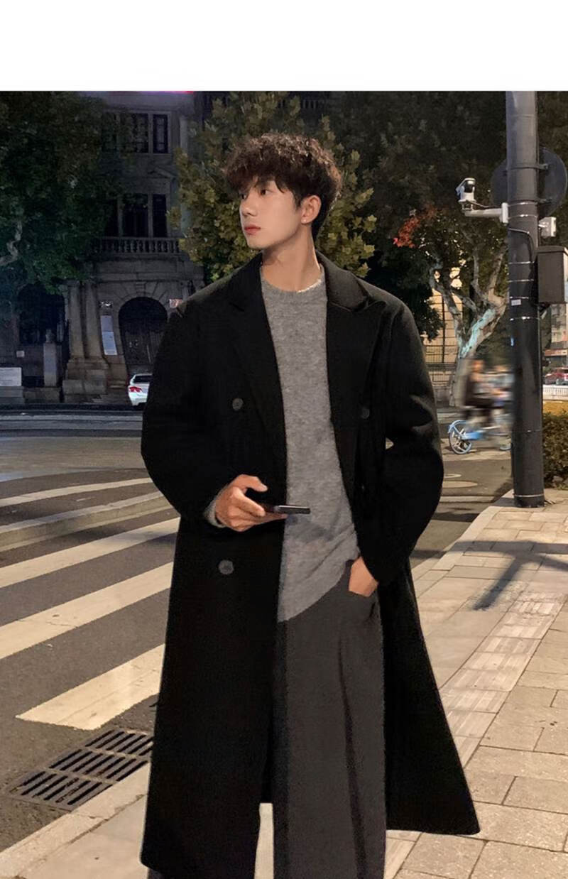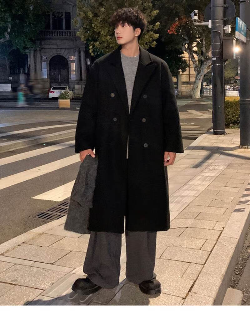 Pierre Cardin Korean style winter trendy thickened woolen coat men's British style 2024 casual extra long over-the-knee woolen windbreaker jacket black 3XL