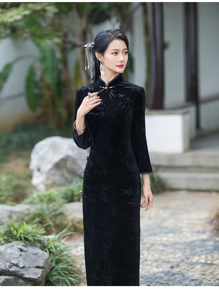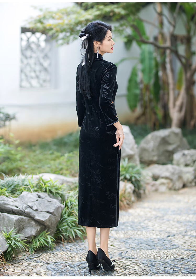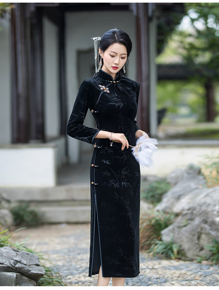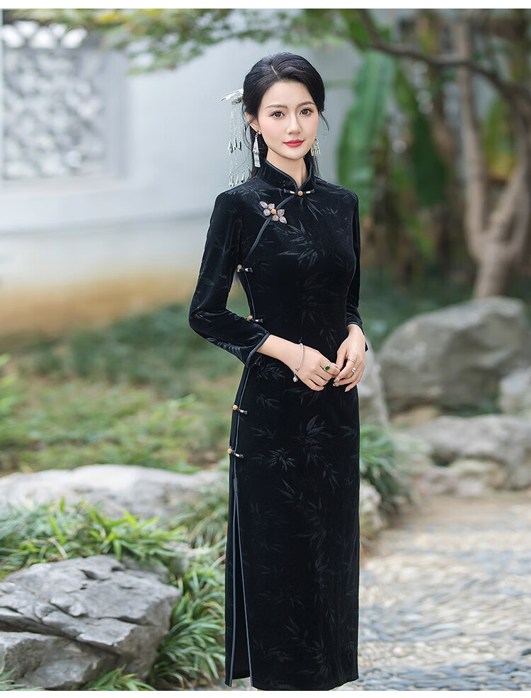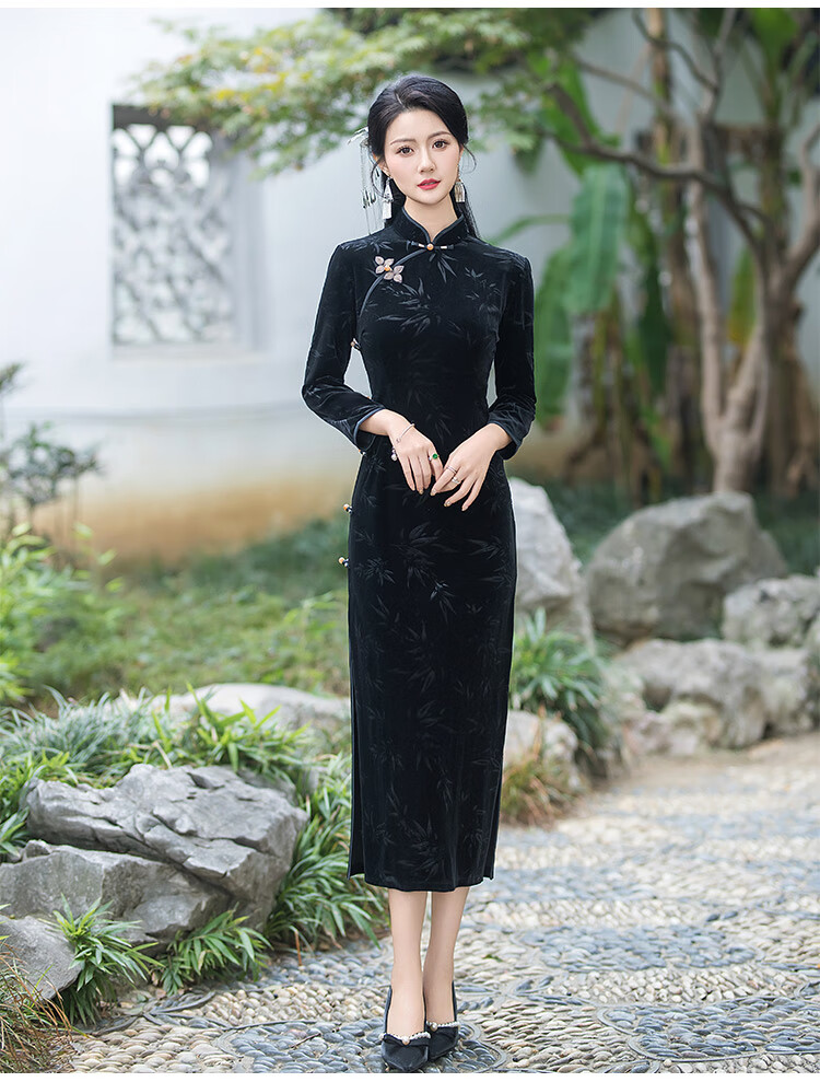 Timochi retro catwalk cheongsam Chinese style high-end 2024 new autumn and winter stretch velvet long improved women's slim long sleeves black 2XL
