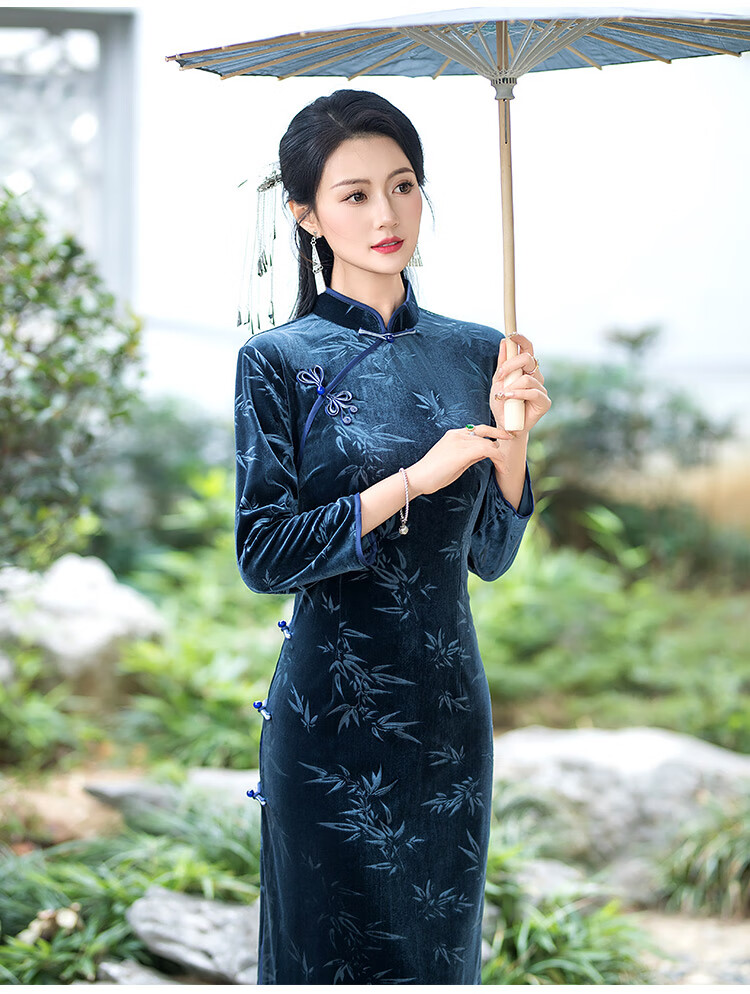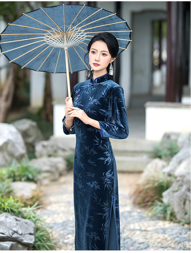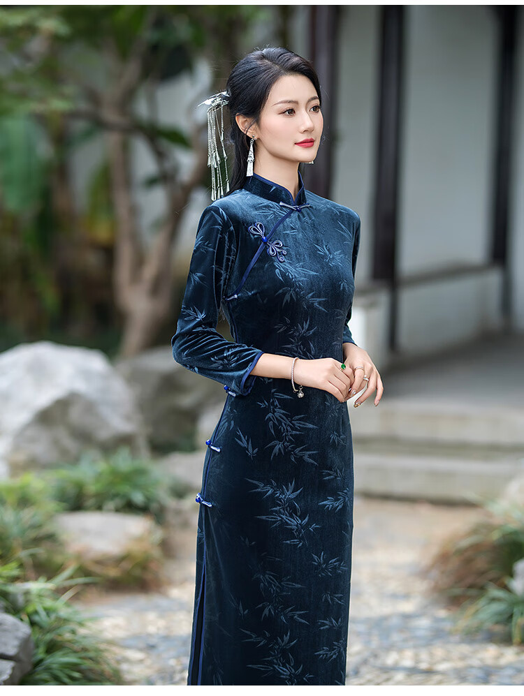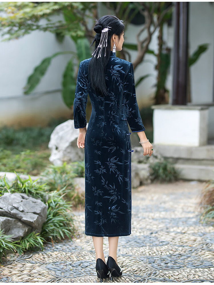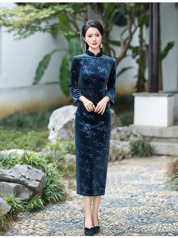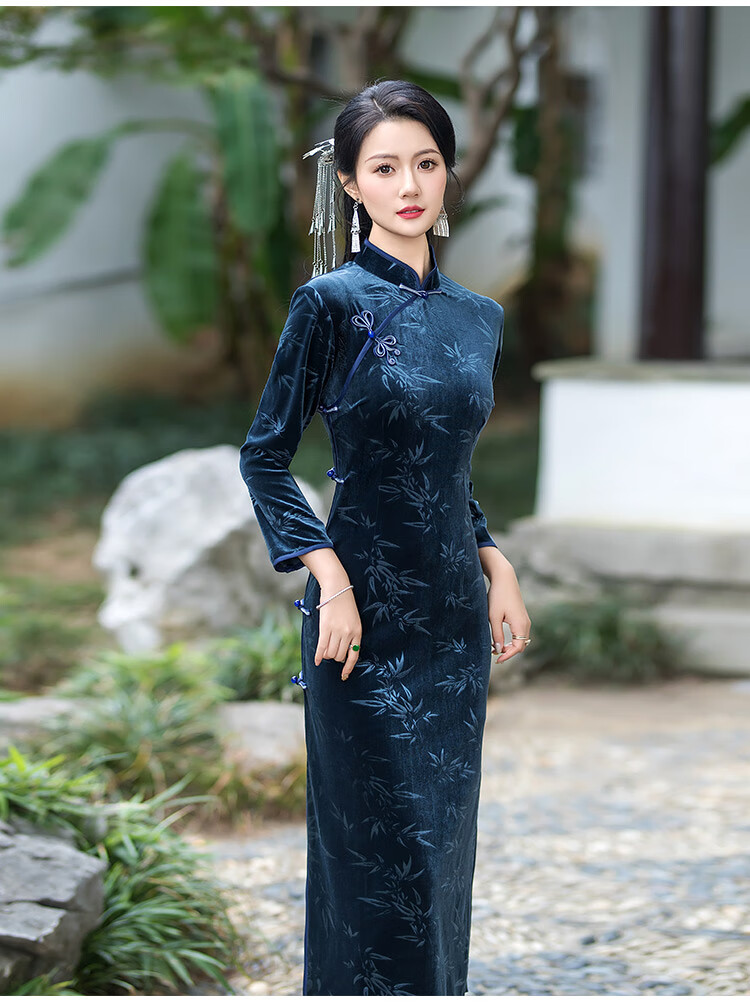 Timochi retro catwalk cheongsam Chinese style high-end 2024 new autumn and winter stretch velvet long improved women's slim long sleeves black 2XL