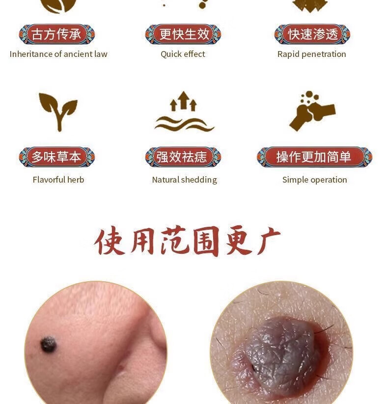 Wherever there are black spots, apply it without pain or leaving any traces. The mole removal cream is painless and can remove moles all over the body. No need to touch water with your mouth. 999 concentrated effect. Powerful removal of moles without leaving traces.