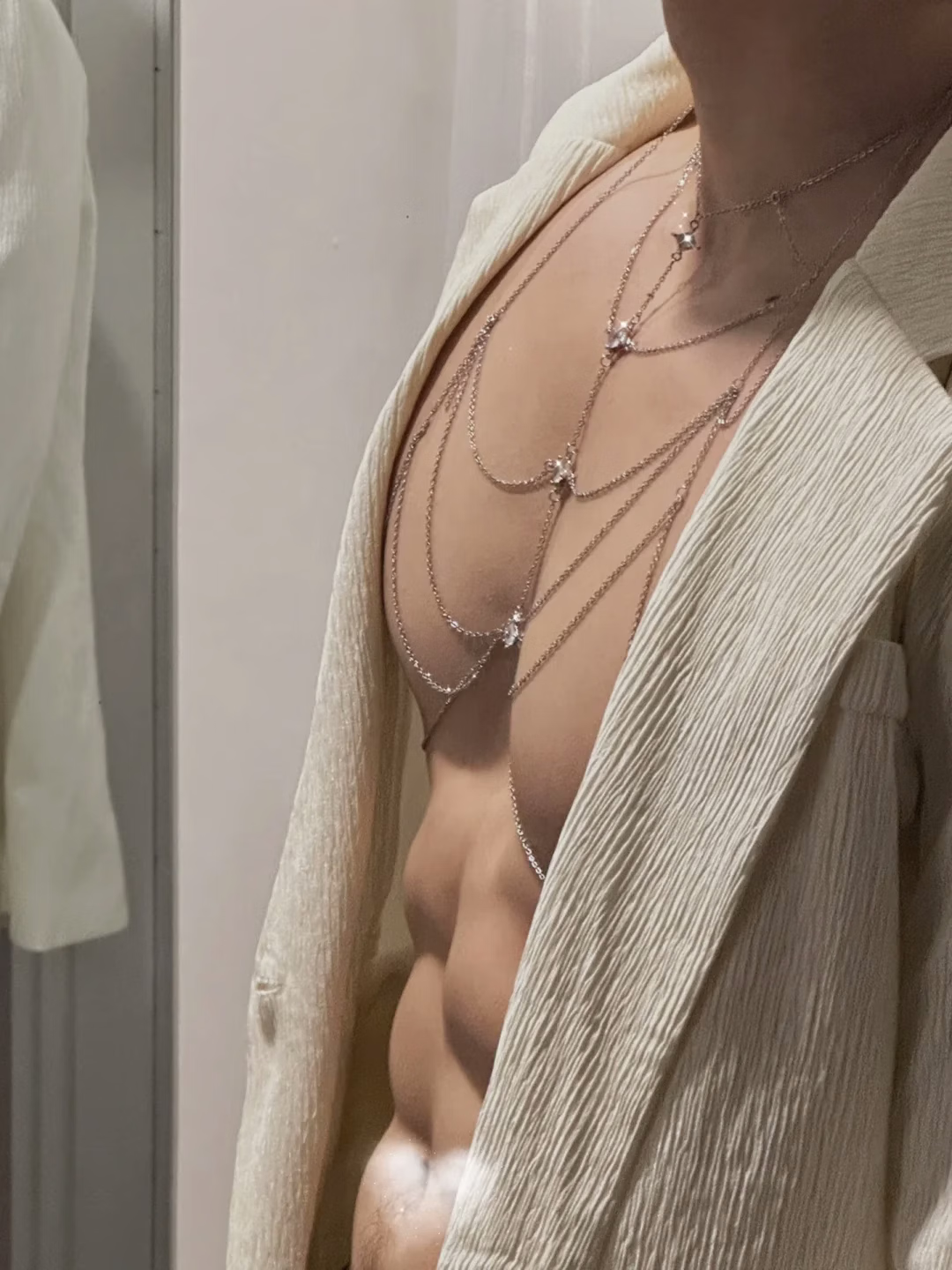 BJYL Boys' Chest Chain Pure Desire Necklace Men's and Women's Trendy Muscular Men's Accessories Pure Desire Big Breast Sexy Body Chain Men's Handsome Fashionable Men's Body Chain Silver