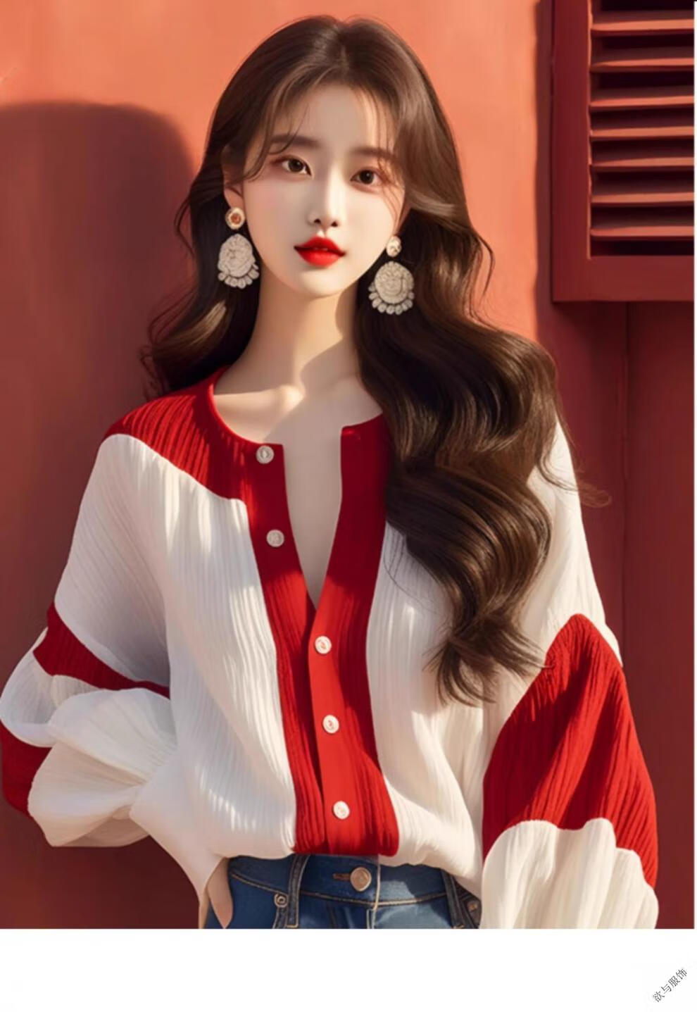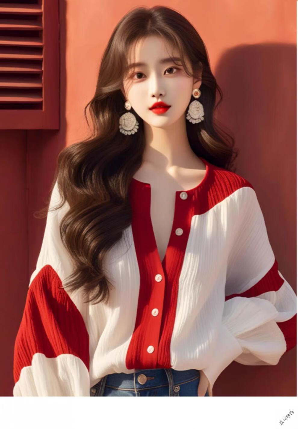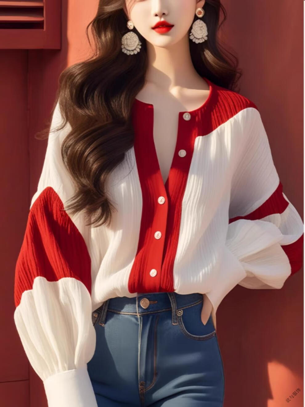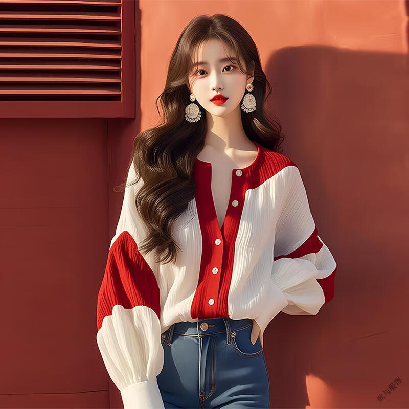 Pierre Cardin (pierre cardin) red and white contrast lantern sleeve chiffon shirt 2025 early autumn new French light luxury chic top women's color matching XL 115-130Jin Jin equals 0.5 kg