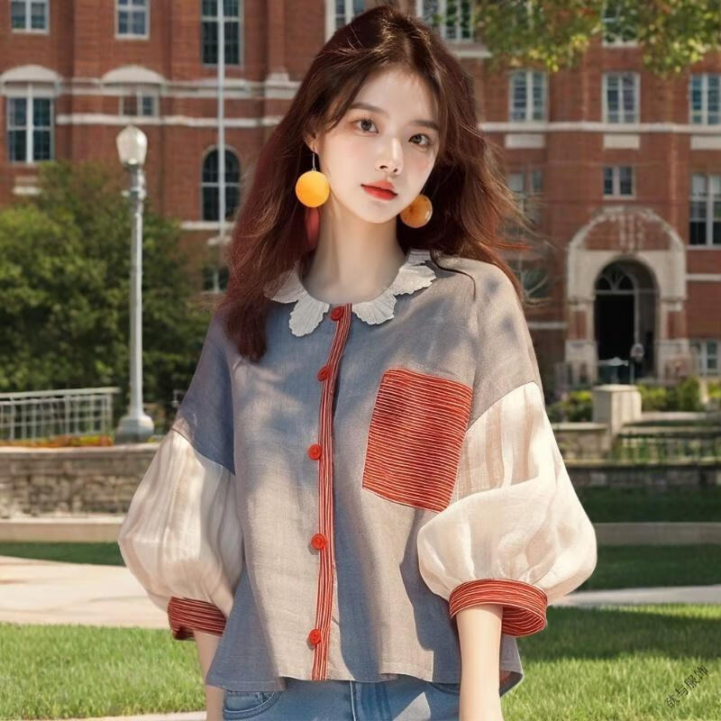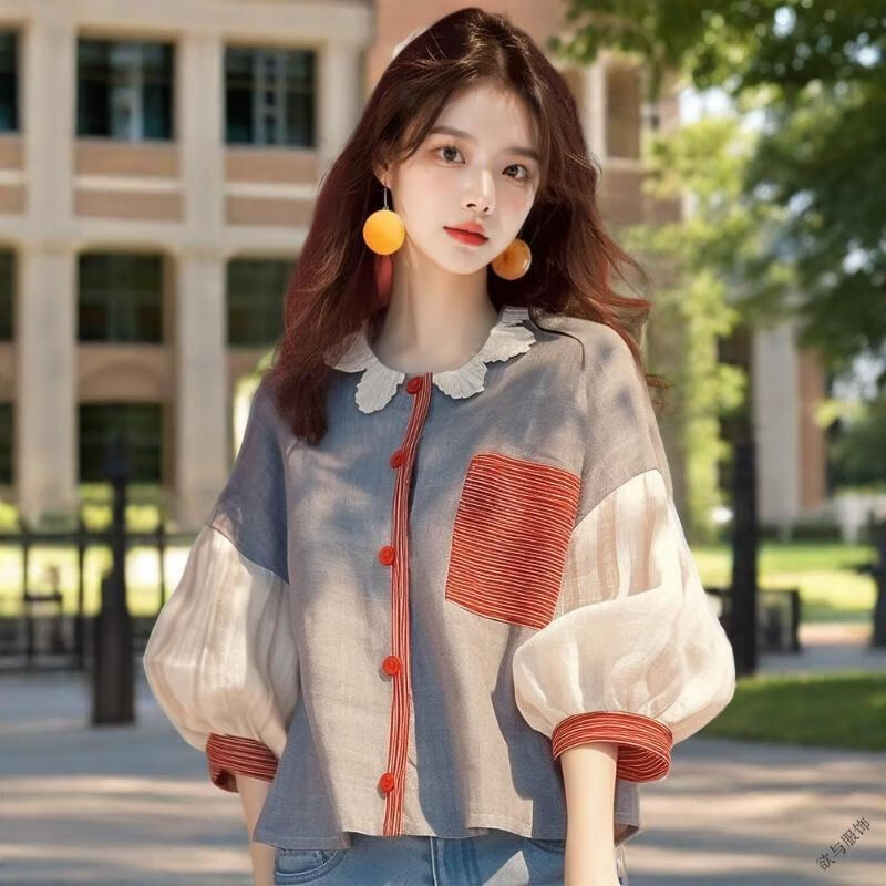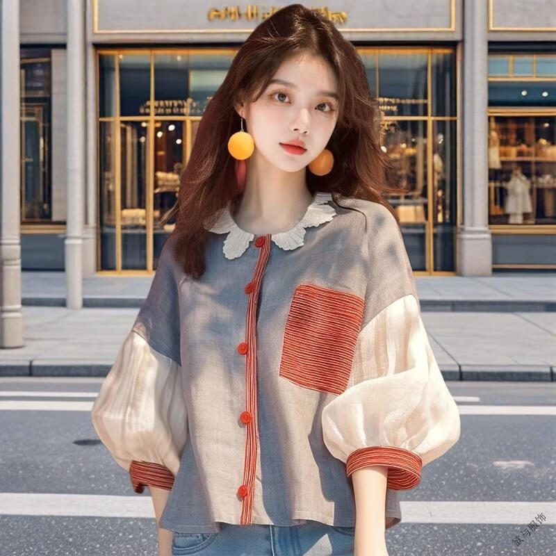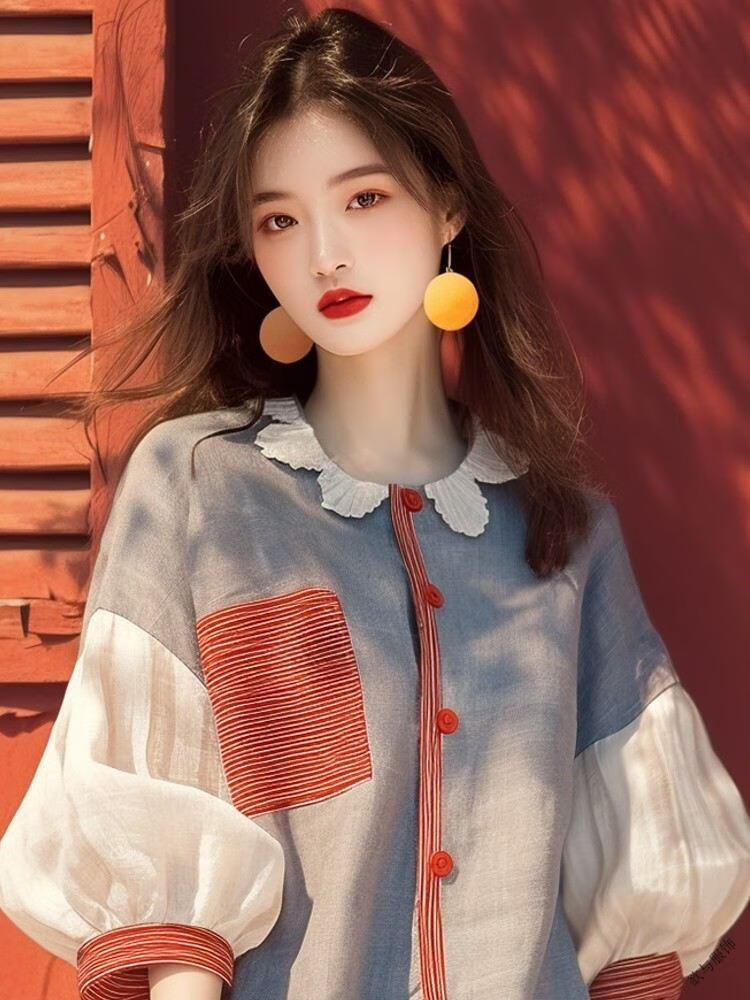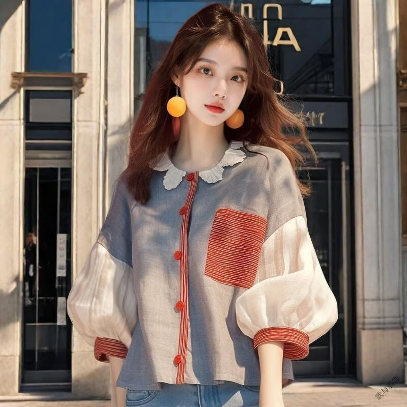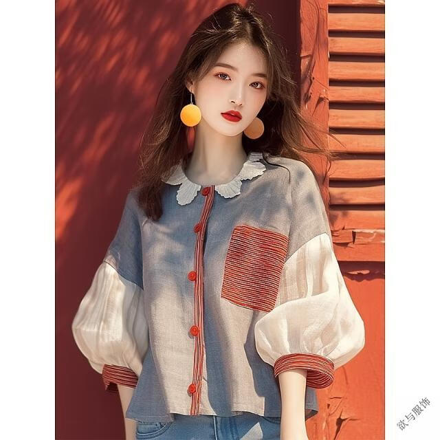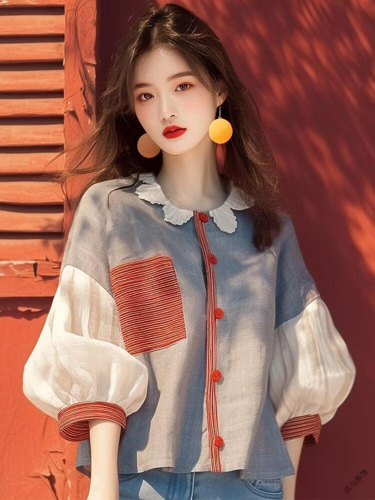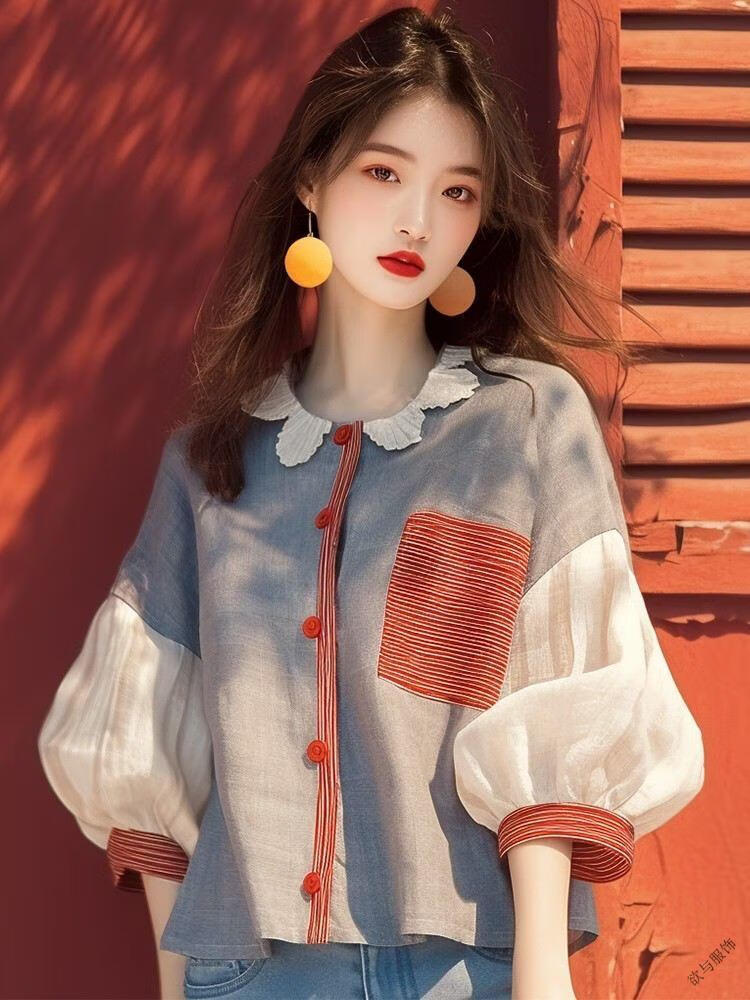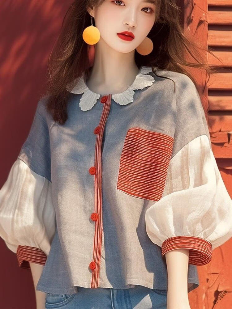 Pierre Cardin 2026 early autumn new shirt niche chic age-reducing blue lantern long-sleeved top picture color L