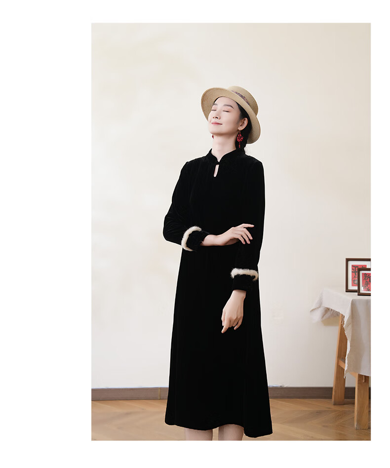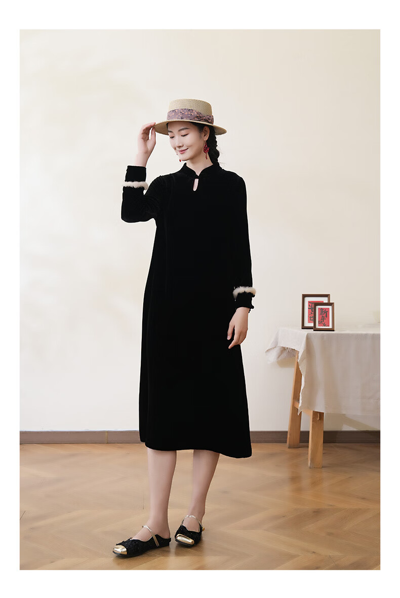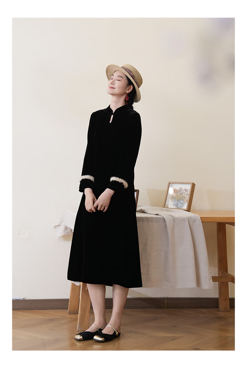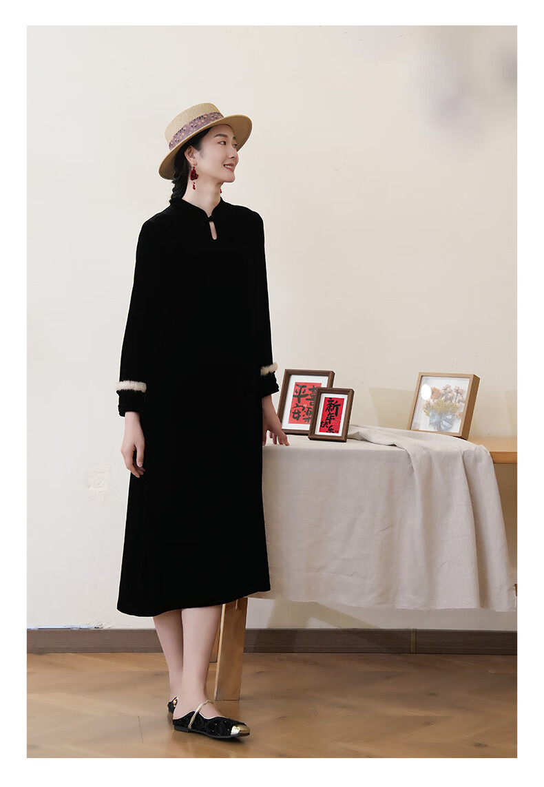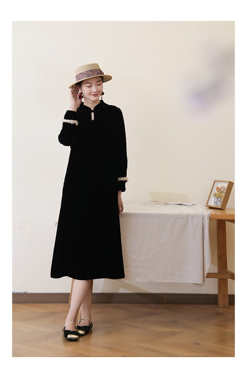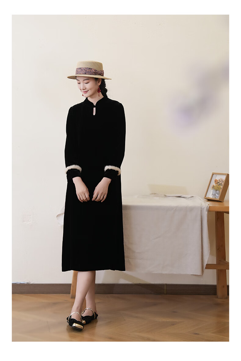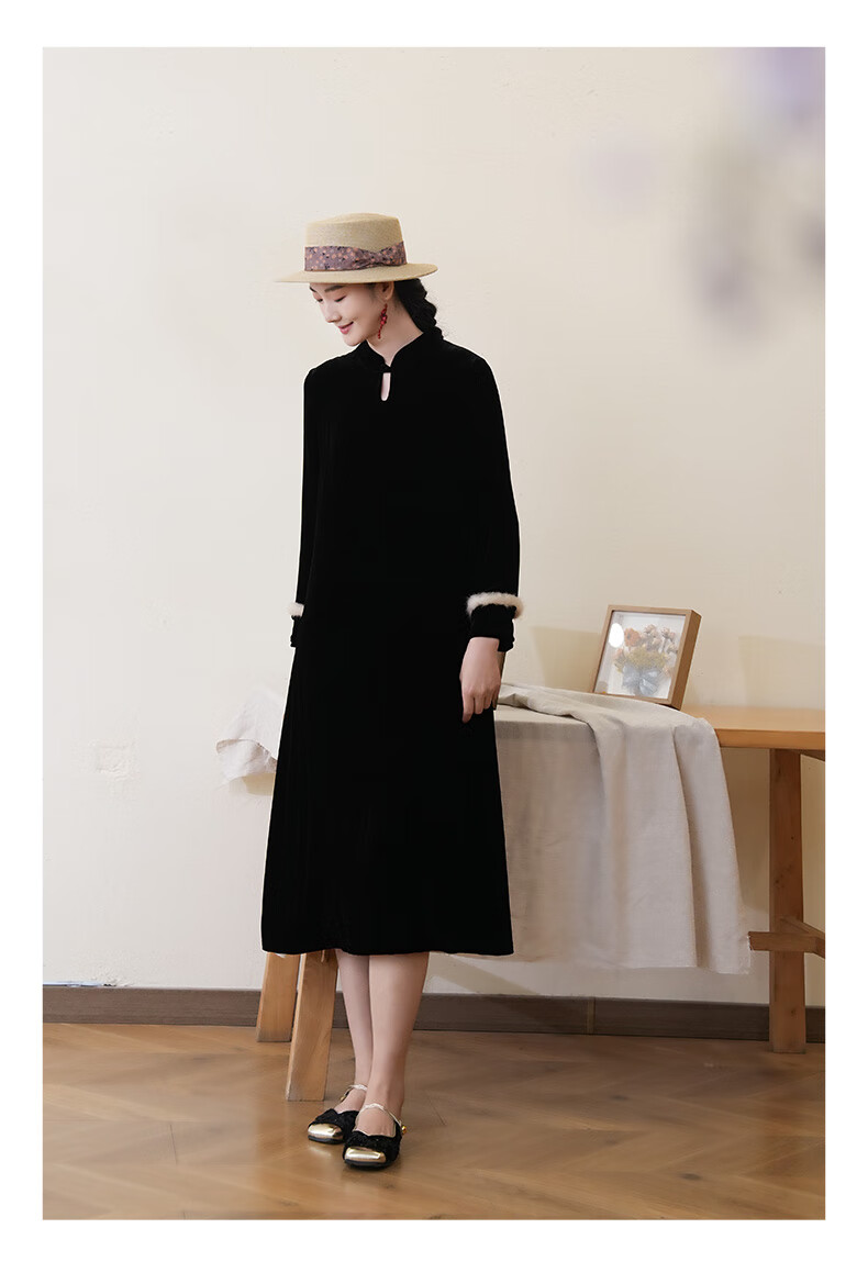 Bu Fu New Chinese Style Black Velvet Double Button Drop Collar Cheongsam 2026 New Spring Slim Long Sleeve Women's Clothing Black Velvet M