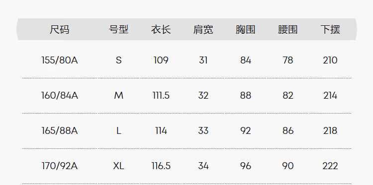 China (cm) 160-165/84-86 165-170 / 88-90 167-172 / 92-96 168-173 / 98-102 170-176 / 106-110