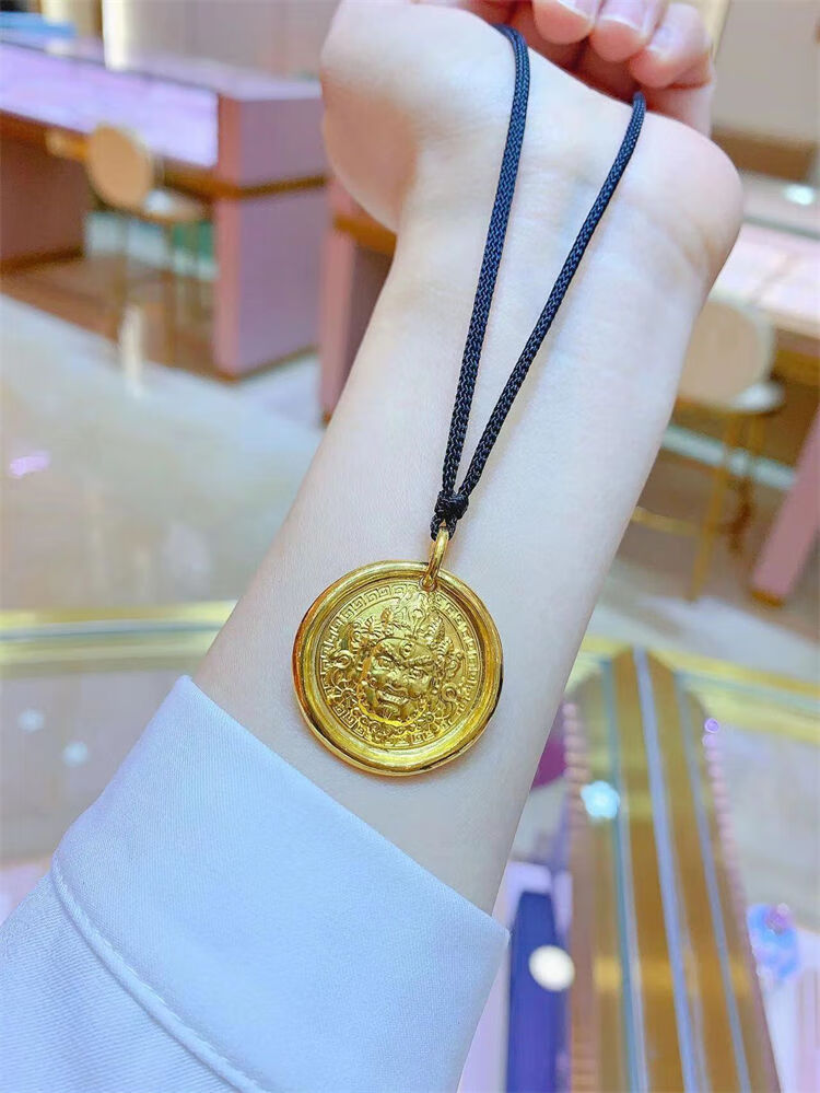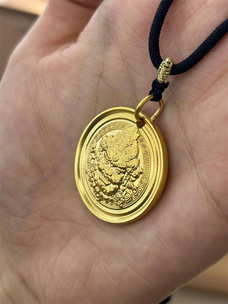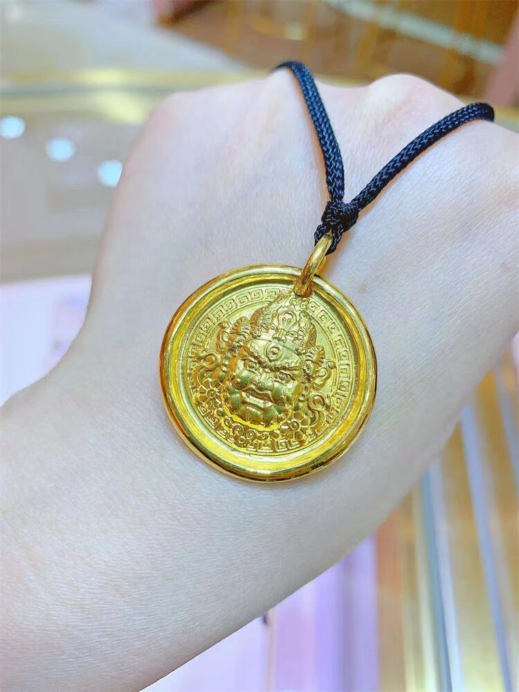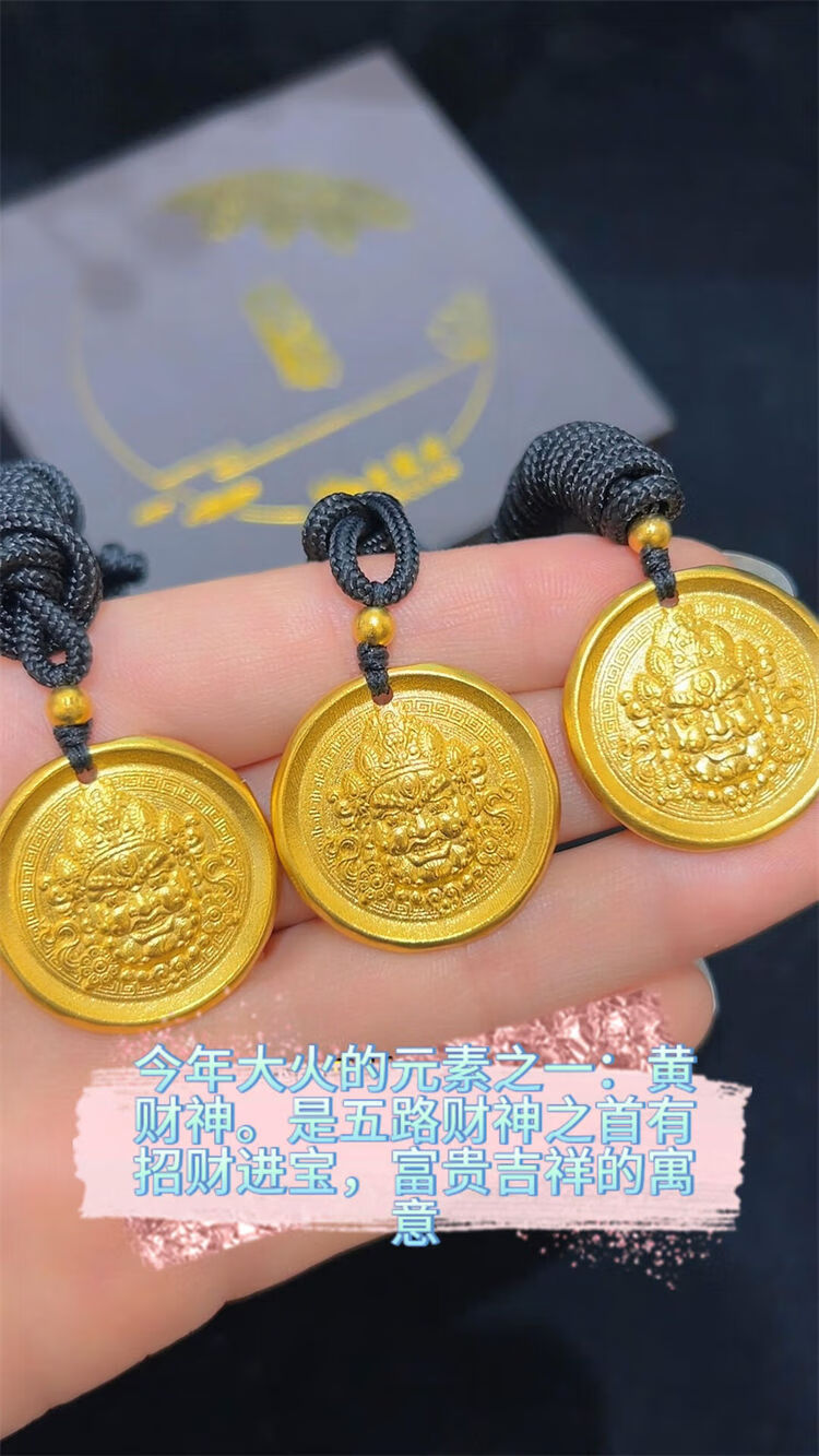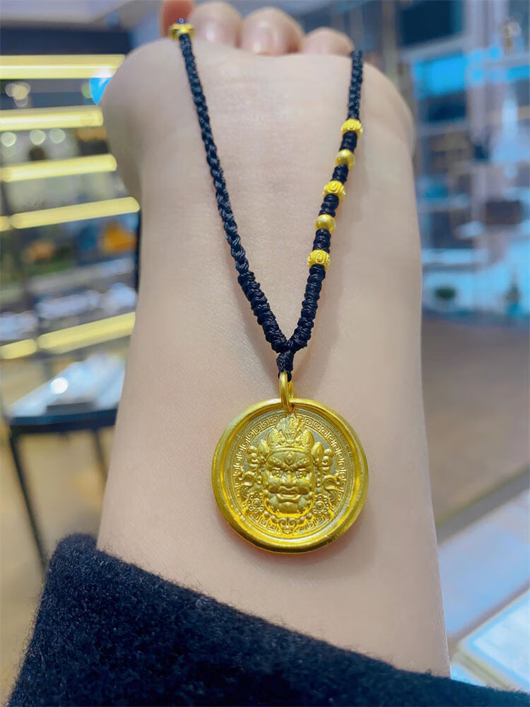 Zhongchi gold-wrapped silver-yellow God of Wealth pendant for men and women, solid eight treasures compass round plate, auspicious words handmade pendant necklace, 3CM auspicious words, yellow God of Wealth, gold-wrapped about 1.1 grams