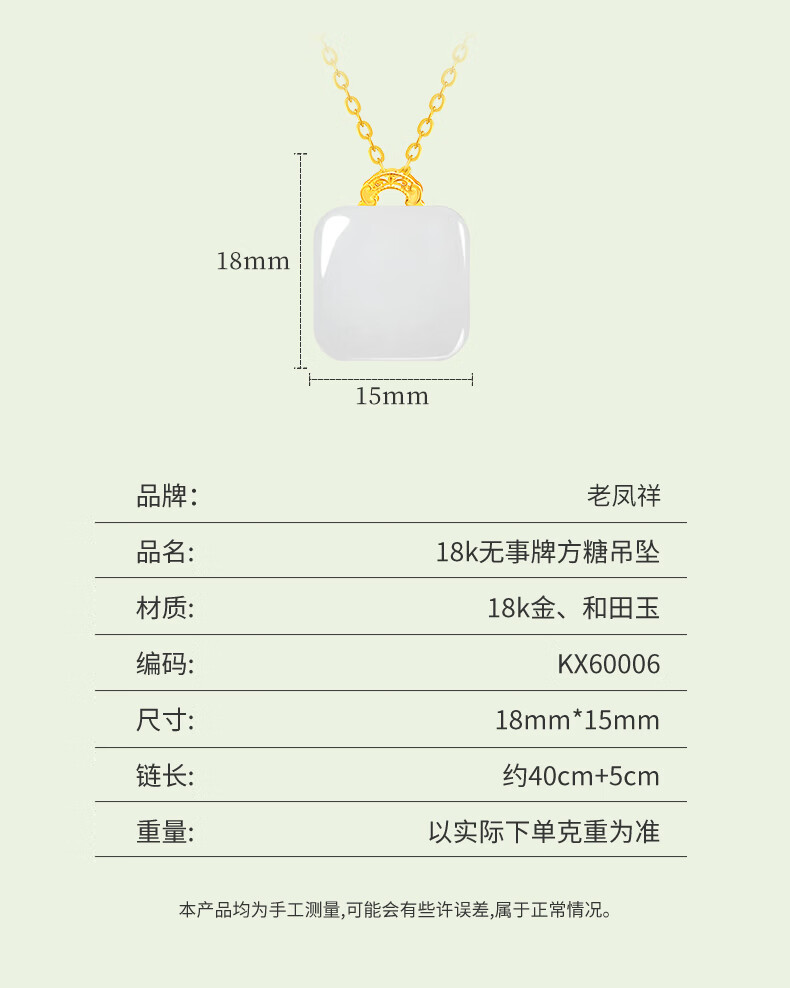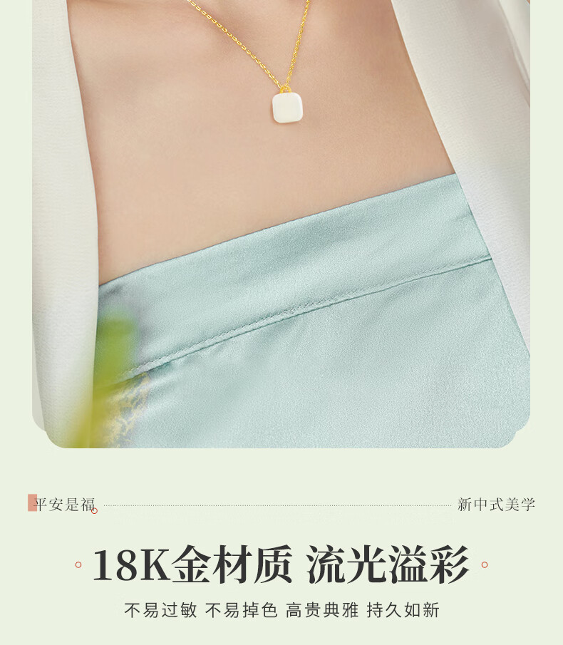 Lao Fengxiang 18k gold inlaid Hetian jade necklace for women, small sugar cube pendant, wedding anniversary gift for girlfriend, 18k Wu Shi brand sugar cube pendant + free S925 chain