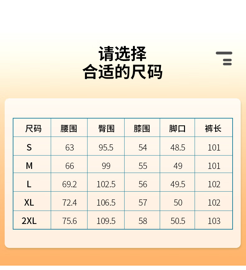 Outseam (cm) 99 cm 101.5 cm 104 cm 106.5 cm 109 cm
