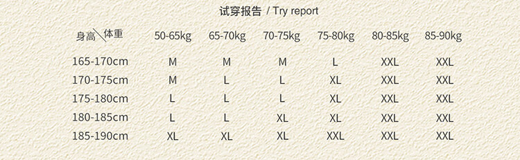 China (cm) 165 / 88-90 170 / 96-98 175 / 108-110 180 / 118-122 185 / 126-130