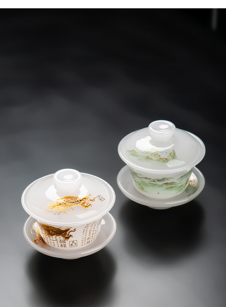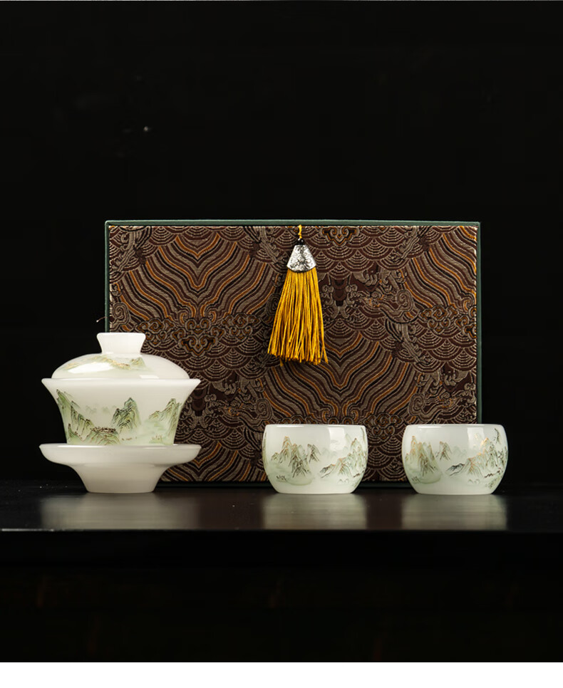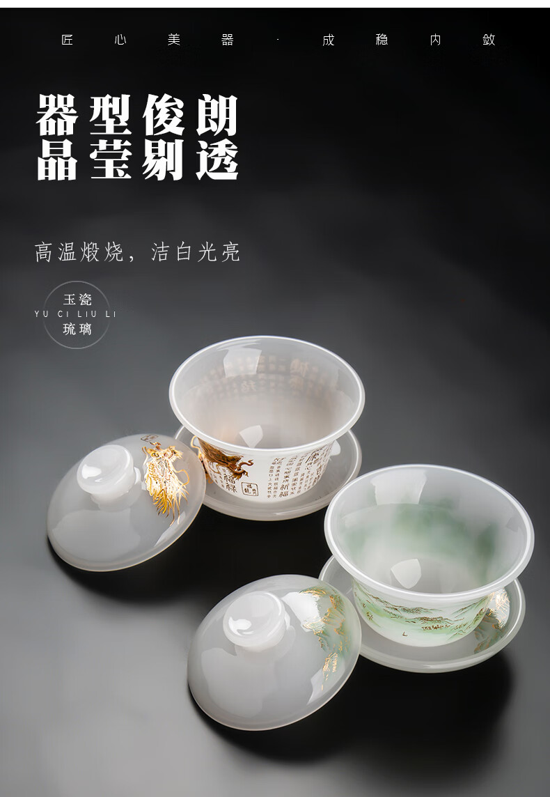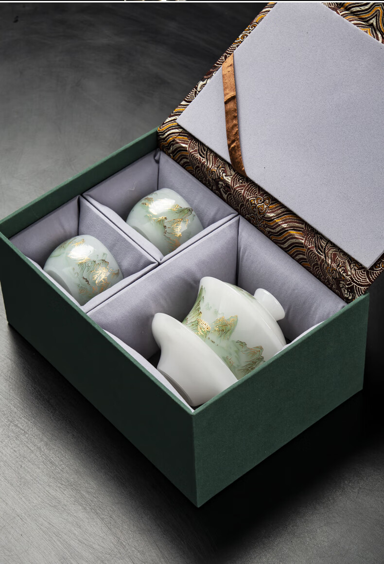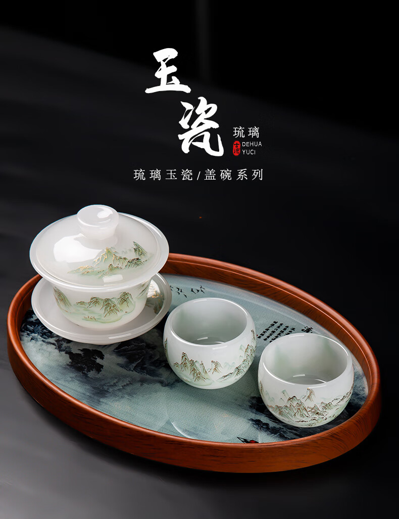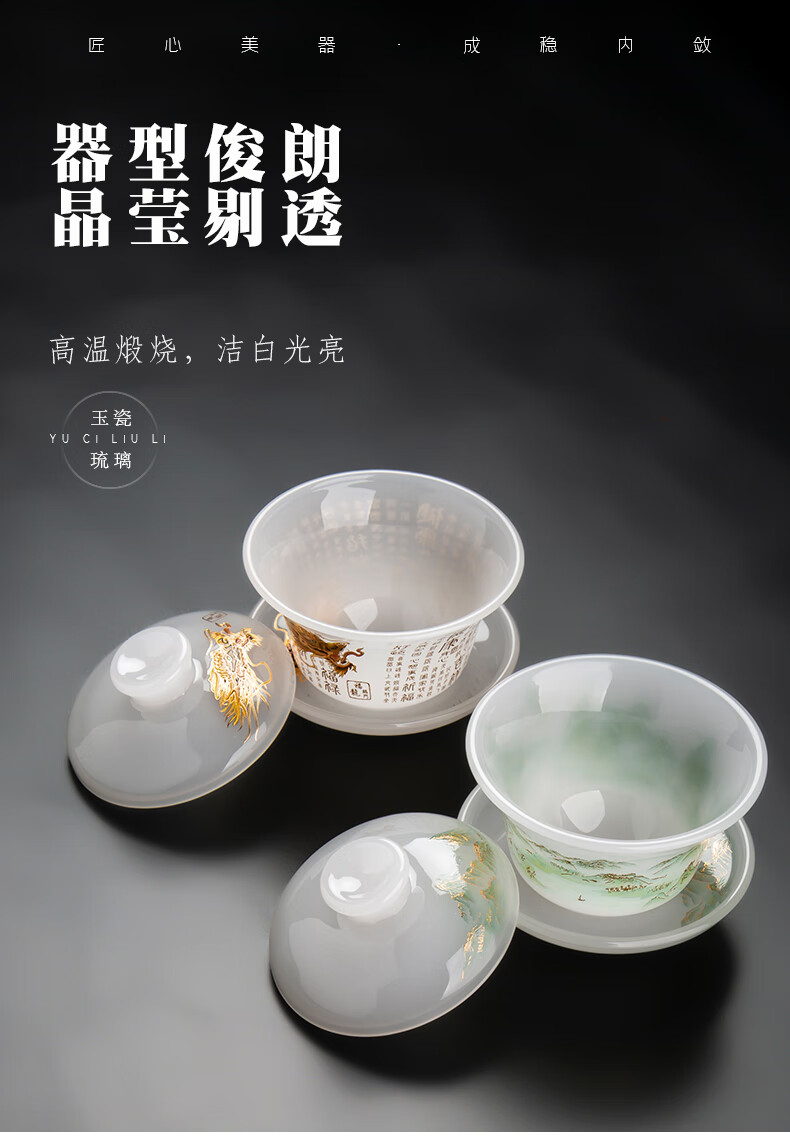 Gude Kiln Glazed Jade Porcelain Tea Set for Home Tea Making One Person Kung Fu Tea Set Covered Bowl Teacup Three-piece Set with Tea Tray Glazed Thousand Miles + Covered Bowl + 2 Zen Meditation Cups + Gift Box