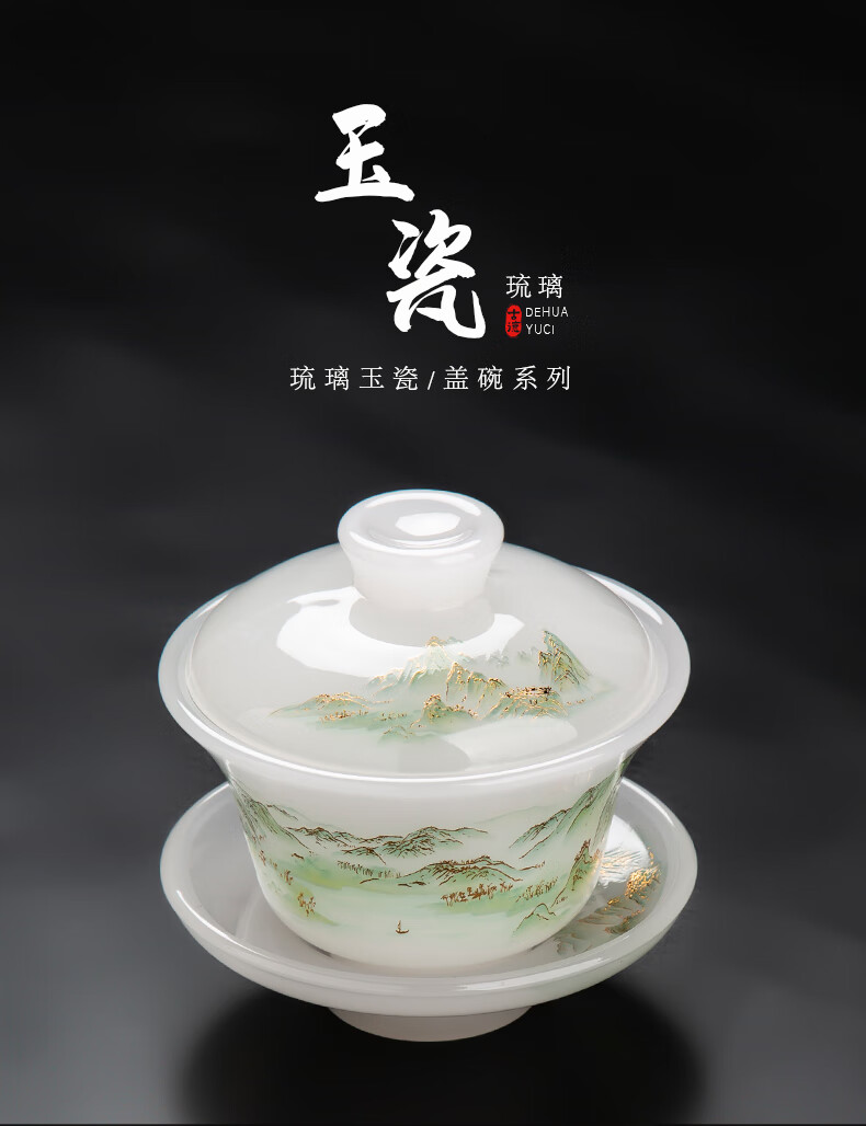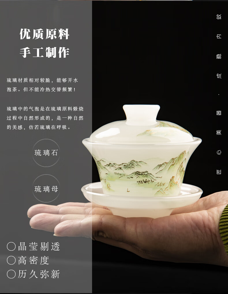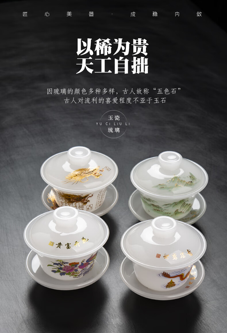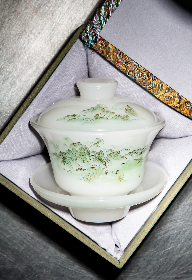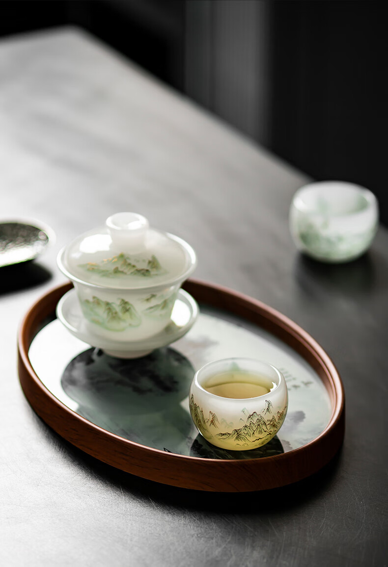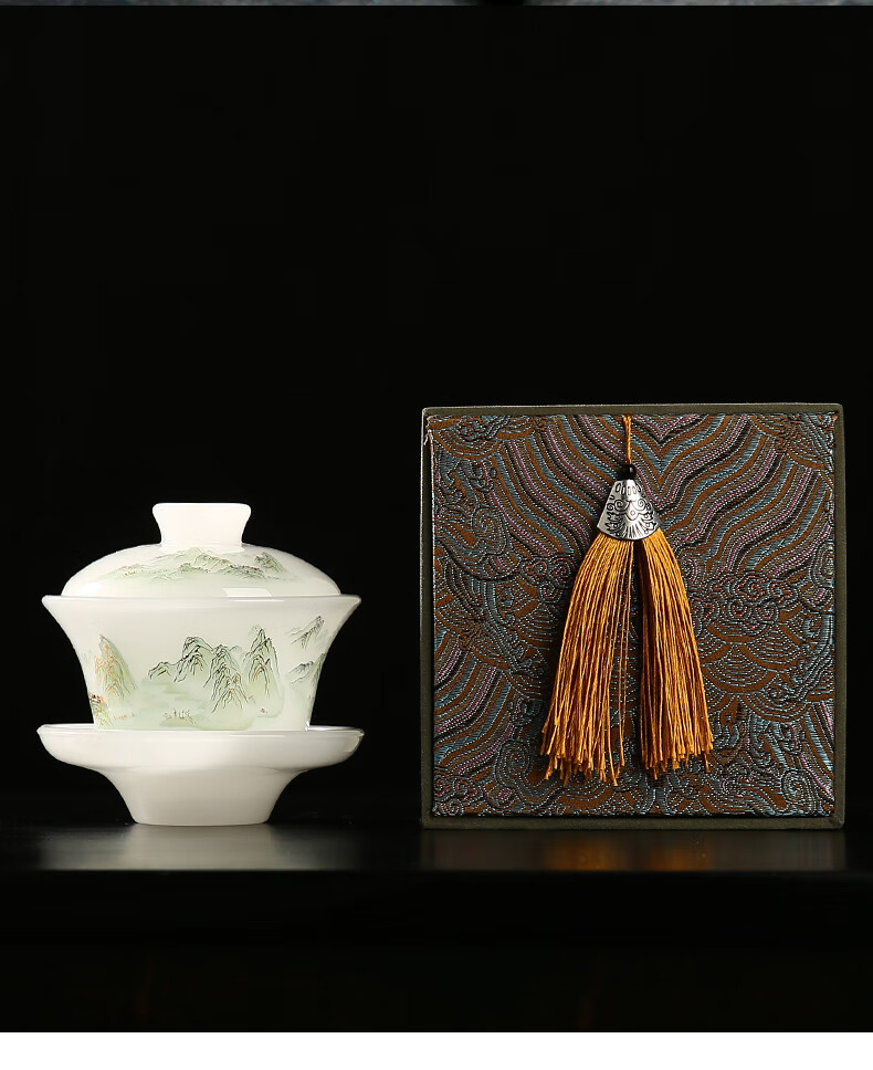 Gude Kiln Glazed Jade Porcelain Tea Set for Home Tea Making One Person Kung Fu Tea Set Covered Bowl Teacup Three-piece Set with Tea Tray Glazed Thousand Miles + Covered Bowl + 2 Zen Meditation Cups + Gift Box