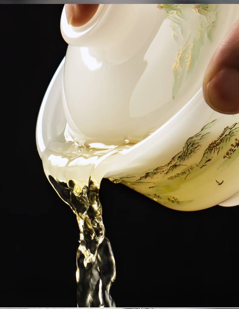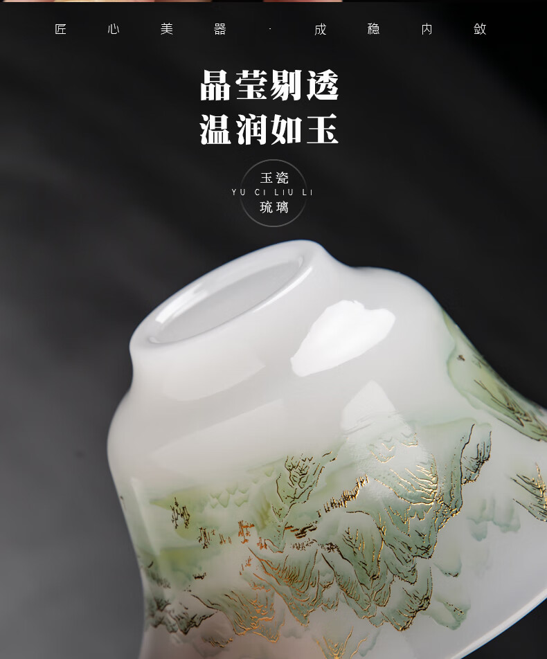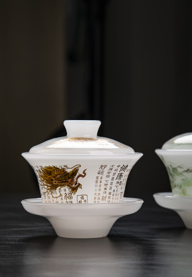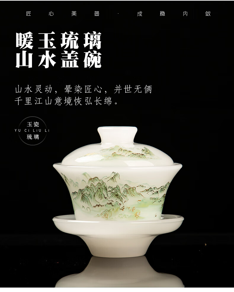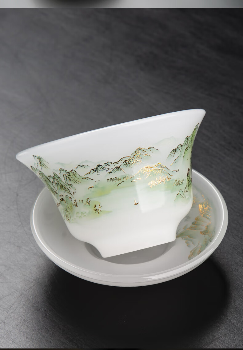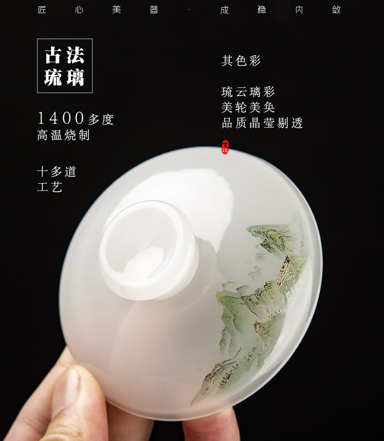 Gude Kiln Glazed Jade Porcelain Tea Set for Home Tea Making One Person Kung Fu Tea Set Covered Bowl Teacup Three-piece Set with Tea Tray Glazed Thousand Miles + Covered Bowl + 2 Zen Meditation Cups + Gift Box