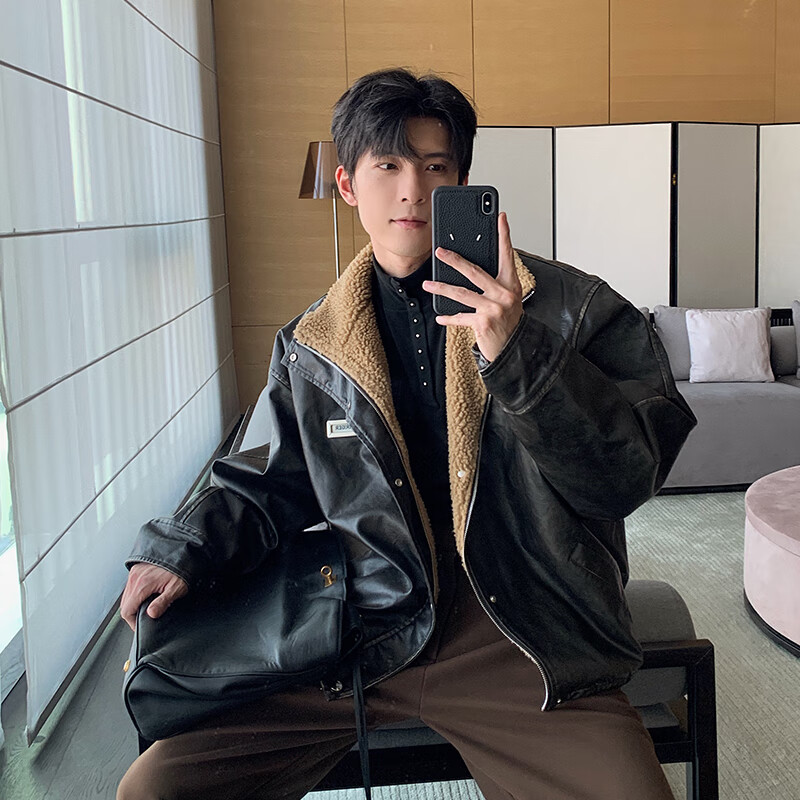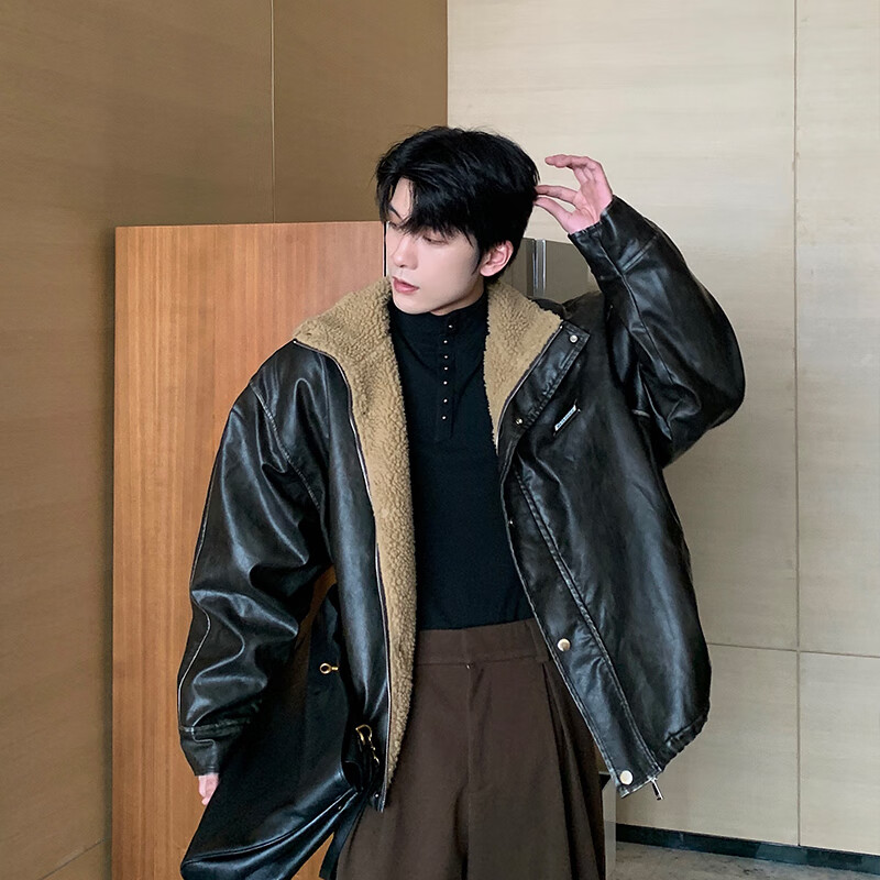 Maorong Xuanxuan hlds fashion show leather jacket men's winter velvet thickened fur body jacket men's black XL