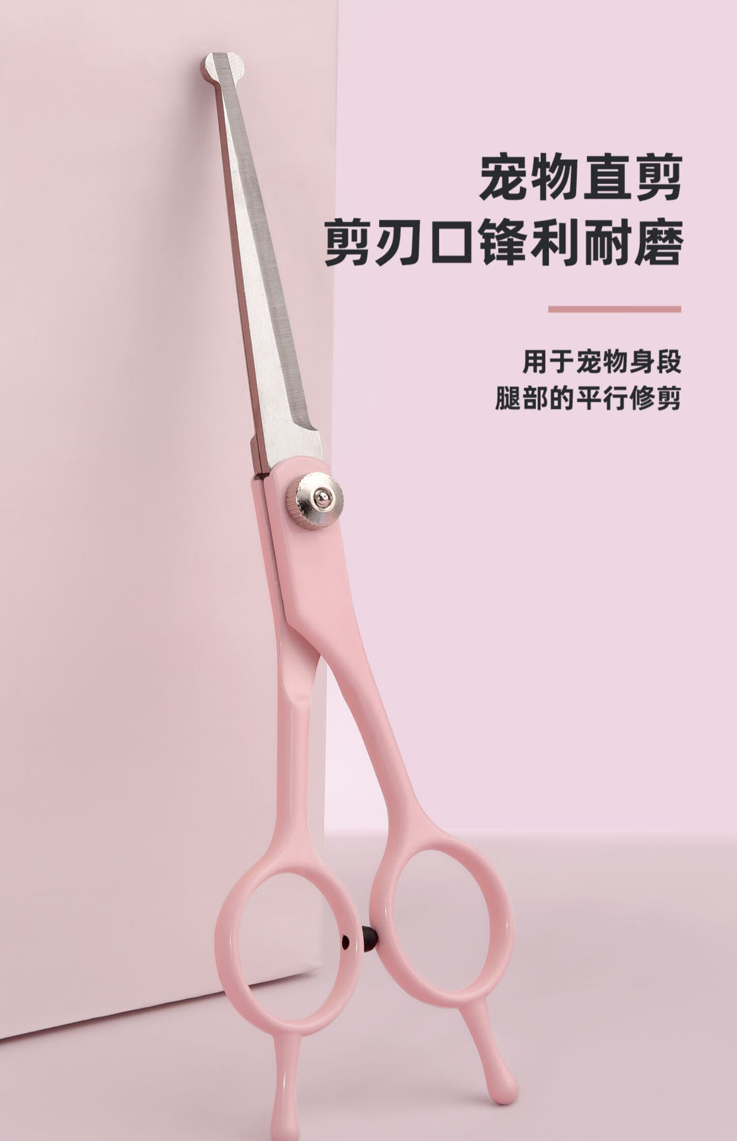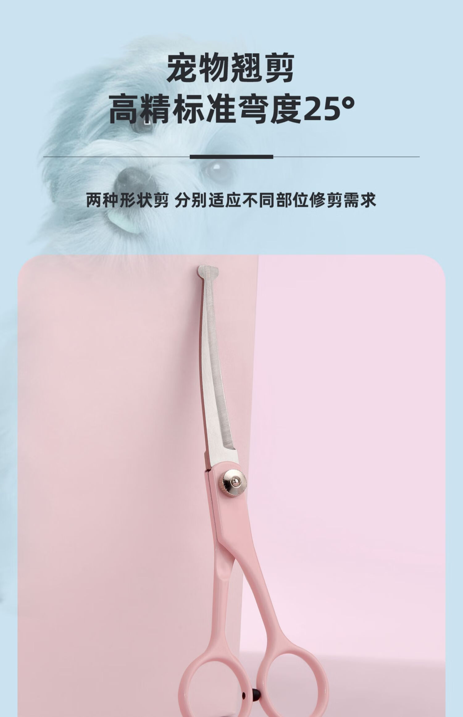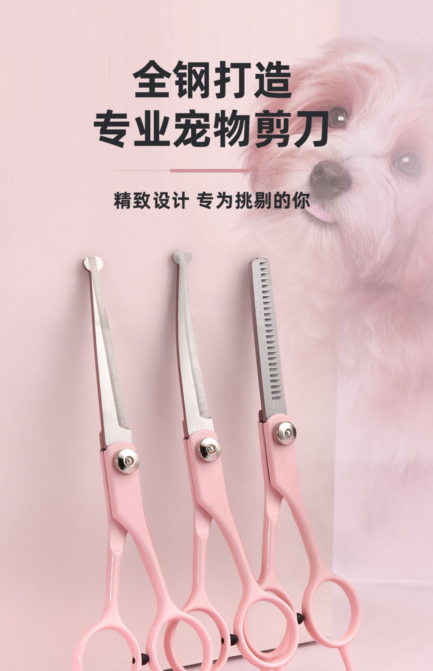 YWZR round-head pet grooming scissors for cats and dogs, special scissors for straight scissors, curved scissors, shaving and trimming scissors tool set, flat scissors + curved scissors + dental scissors + steel comb + leather bag, pink