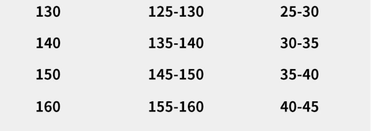 China (cm) 160-165/84-86 165-170 / 88-90 167-172 / 92-96 168-173 / 98-102 170-176 / 106-110