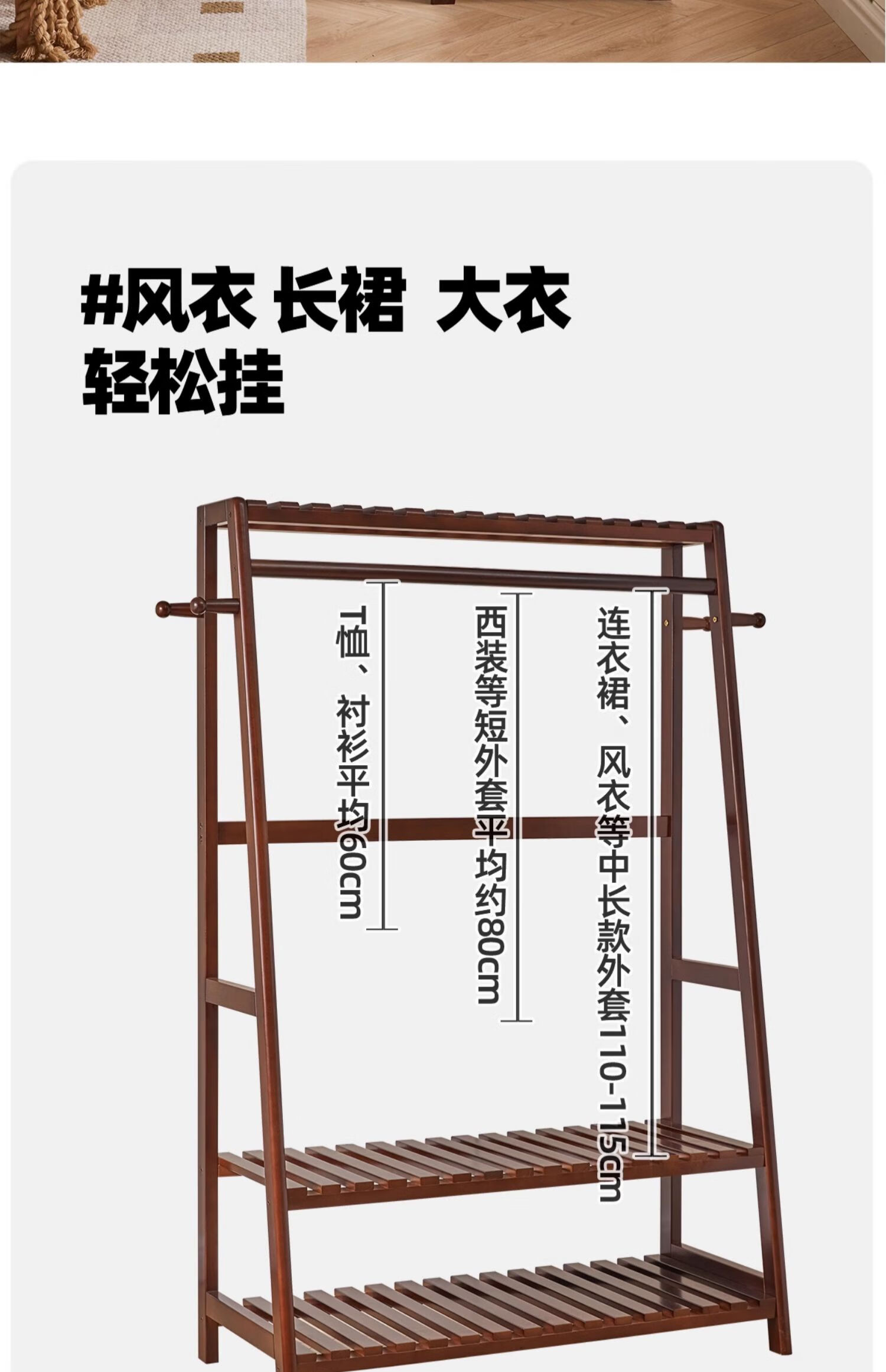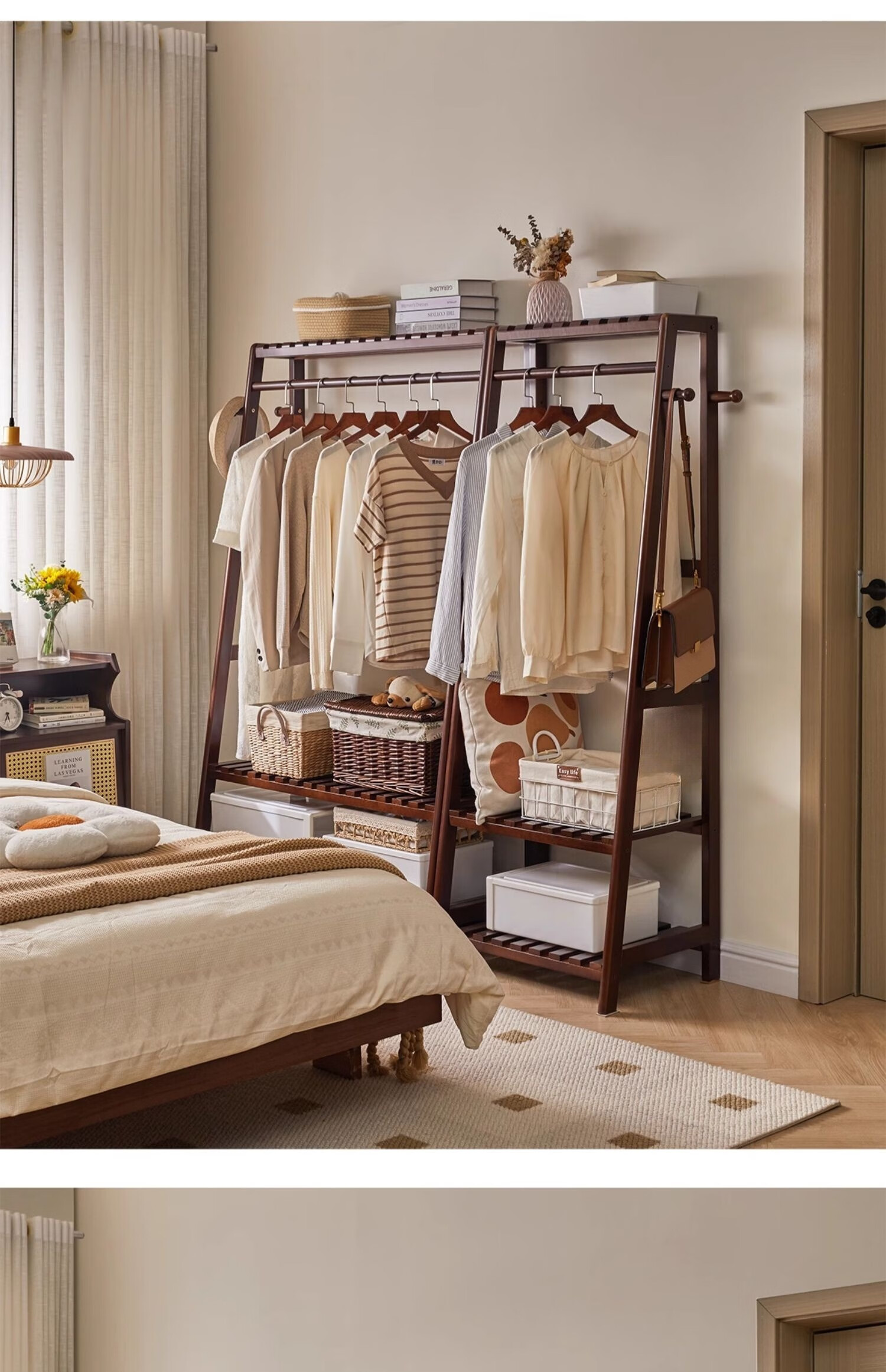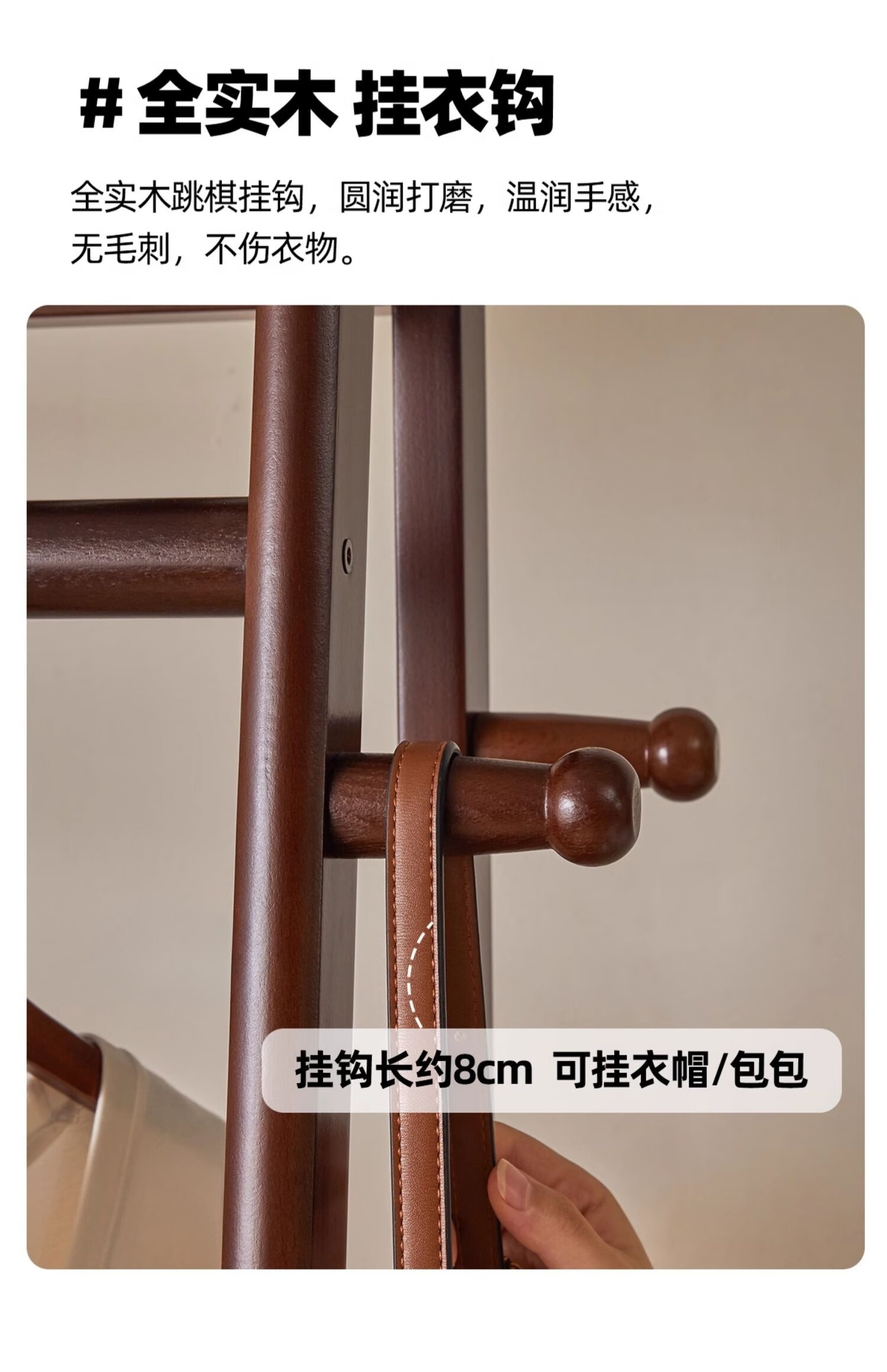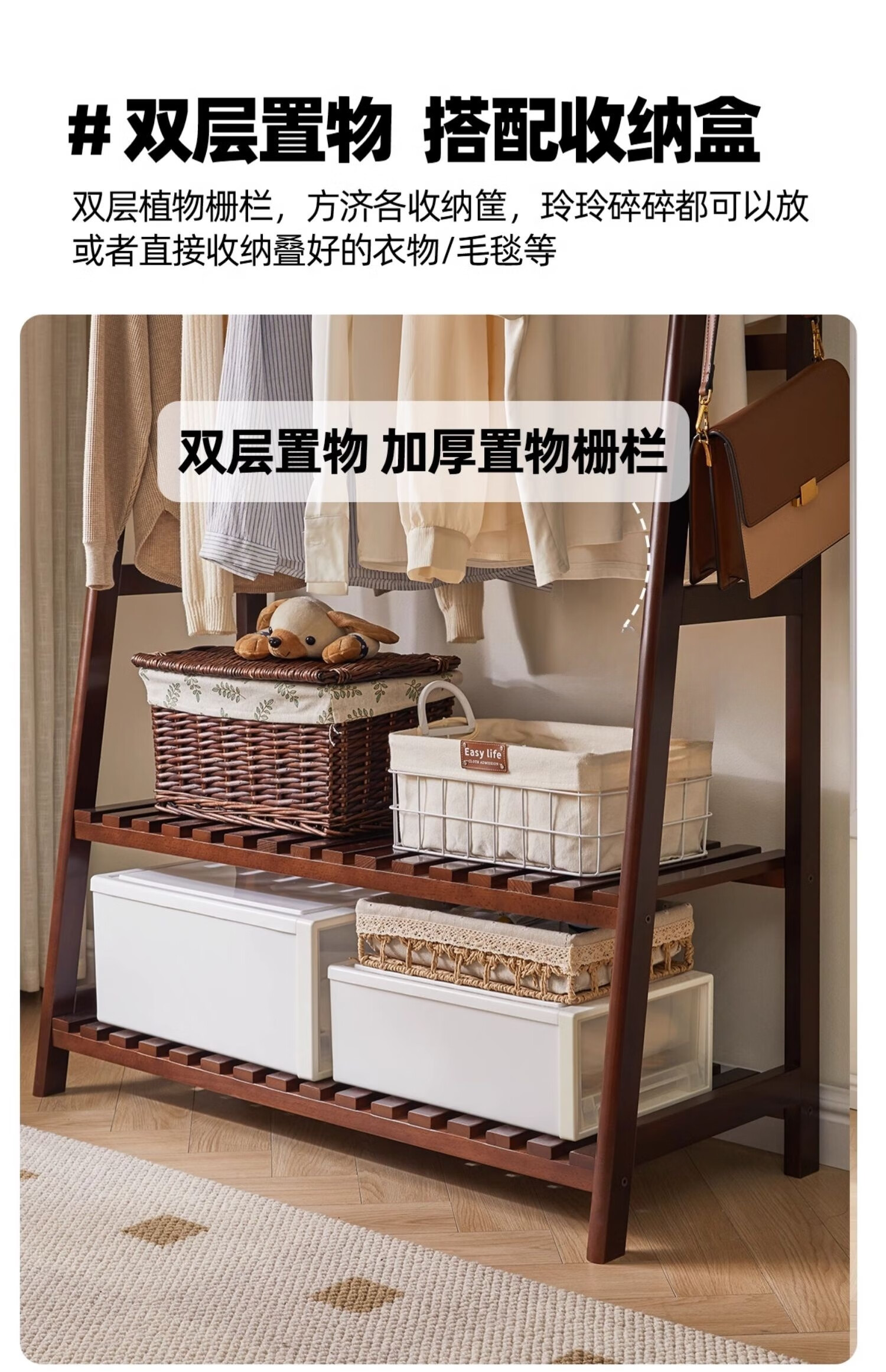 Qingju all solid wood coat rack bedroom clothes rack room storage rack high-end multi-functional new floor-standing clothes rack Heightened double-layer walnut color 118cm German imported SUP grade beech wood + door-to-door delivery