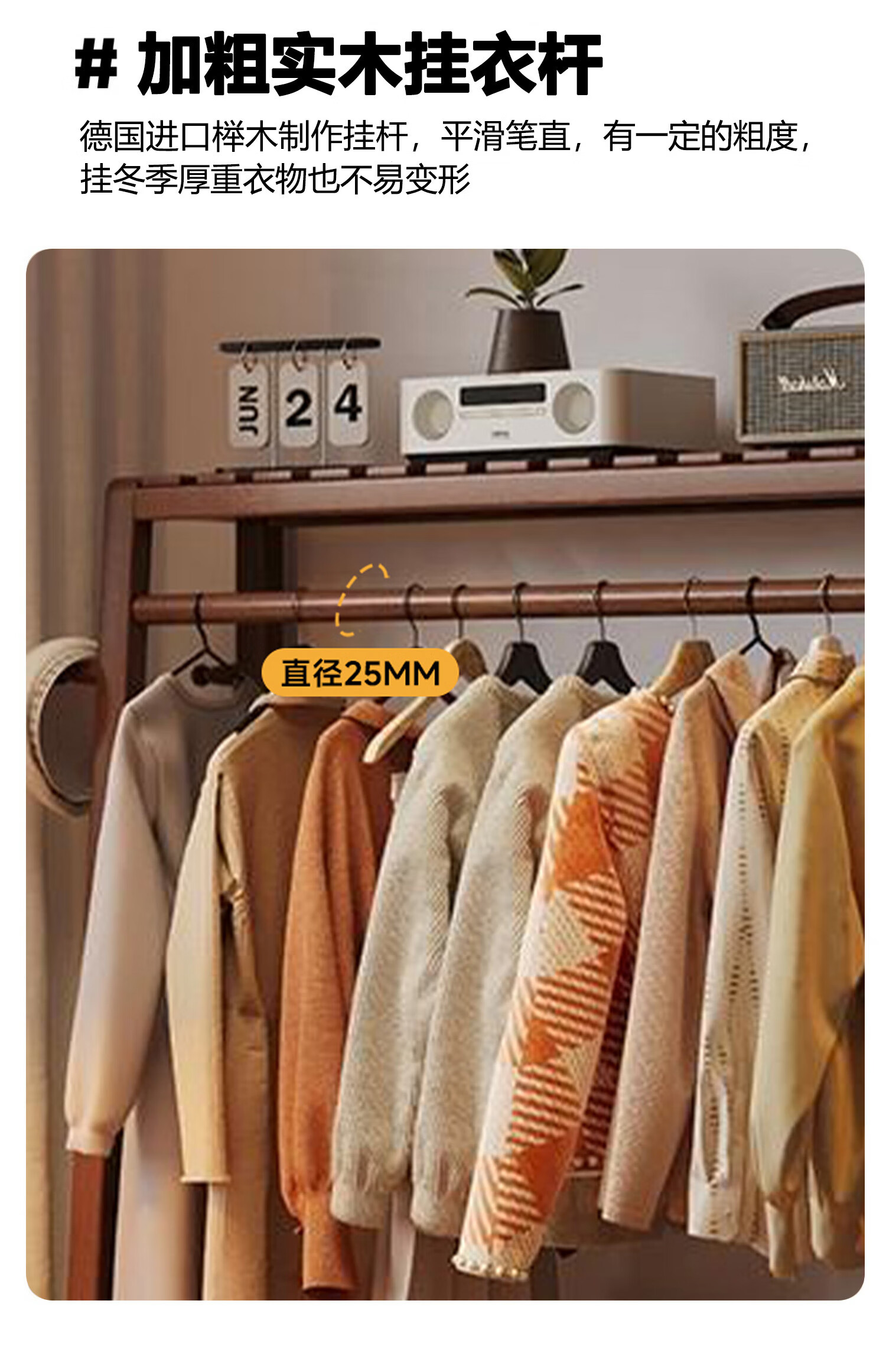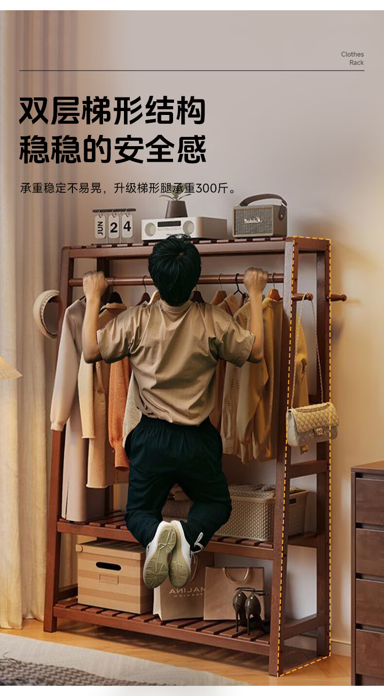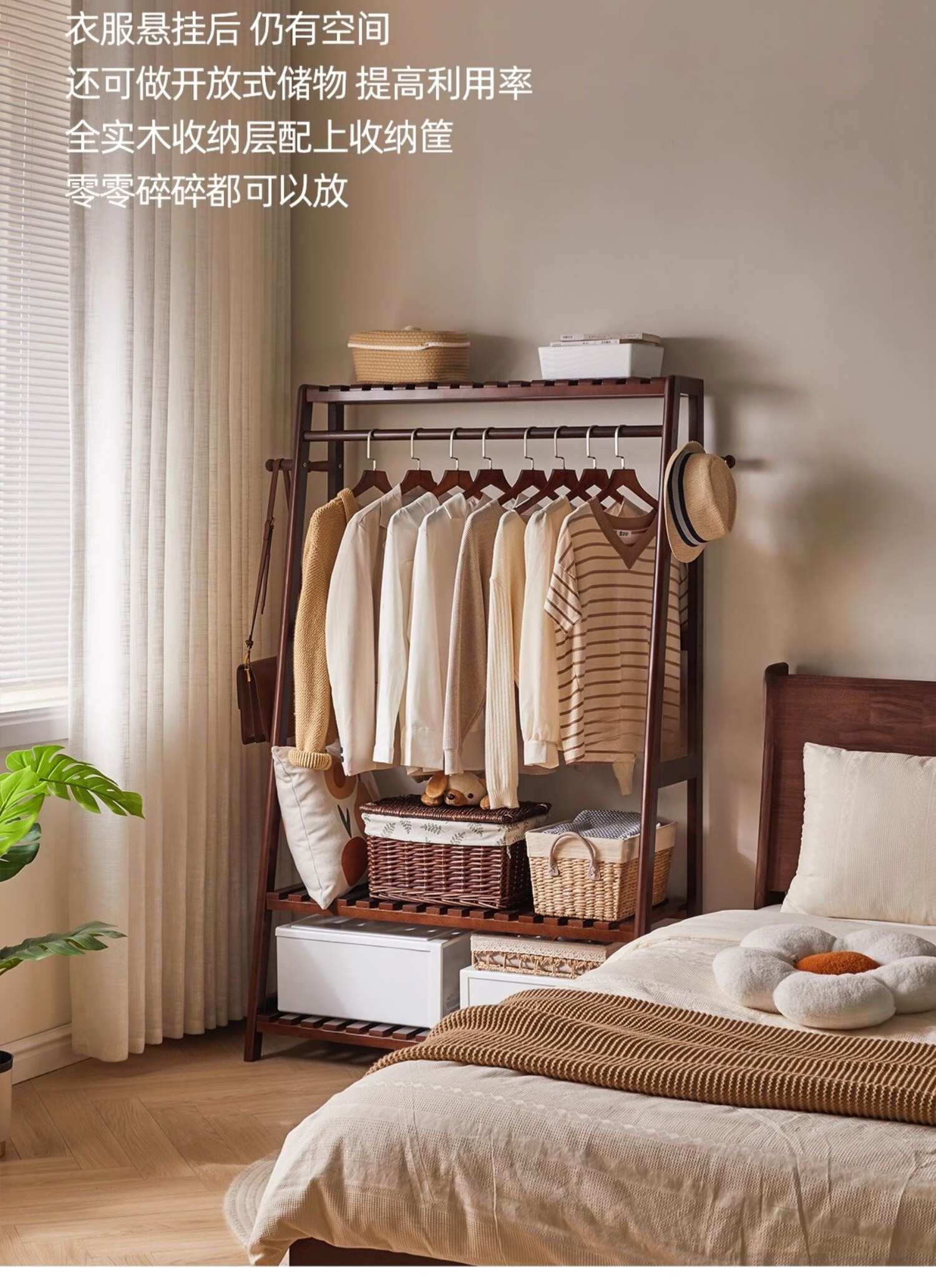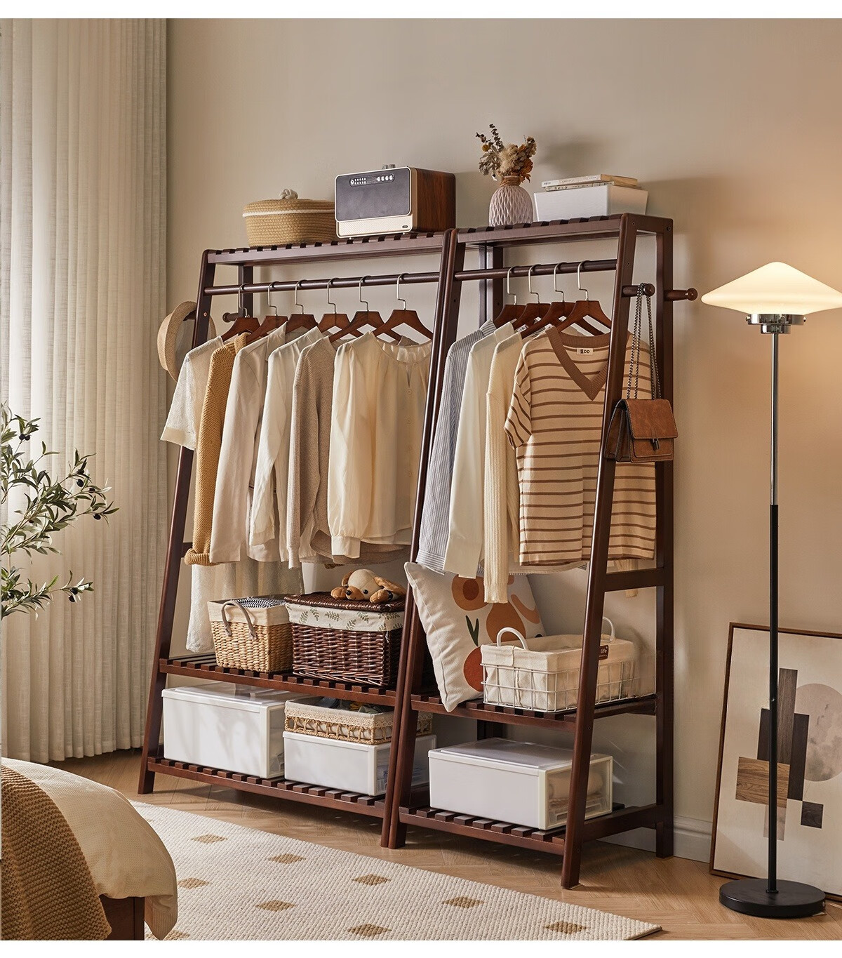 Qingju all solid wood coat rack bedroom clothes rack room storage rack high-end multi-functional new floor-standing clothes rack Heightened double-layer walnut color 118cm German imported SUP grade beech wood + door-to-door delivery