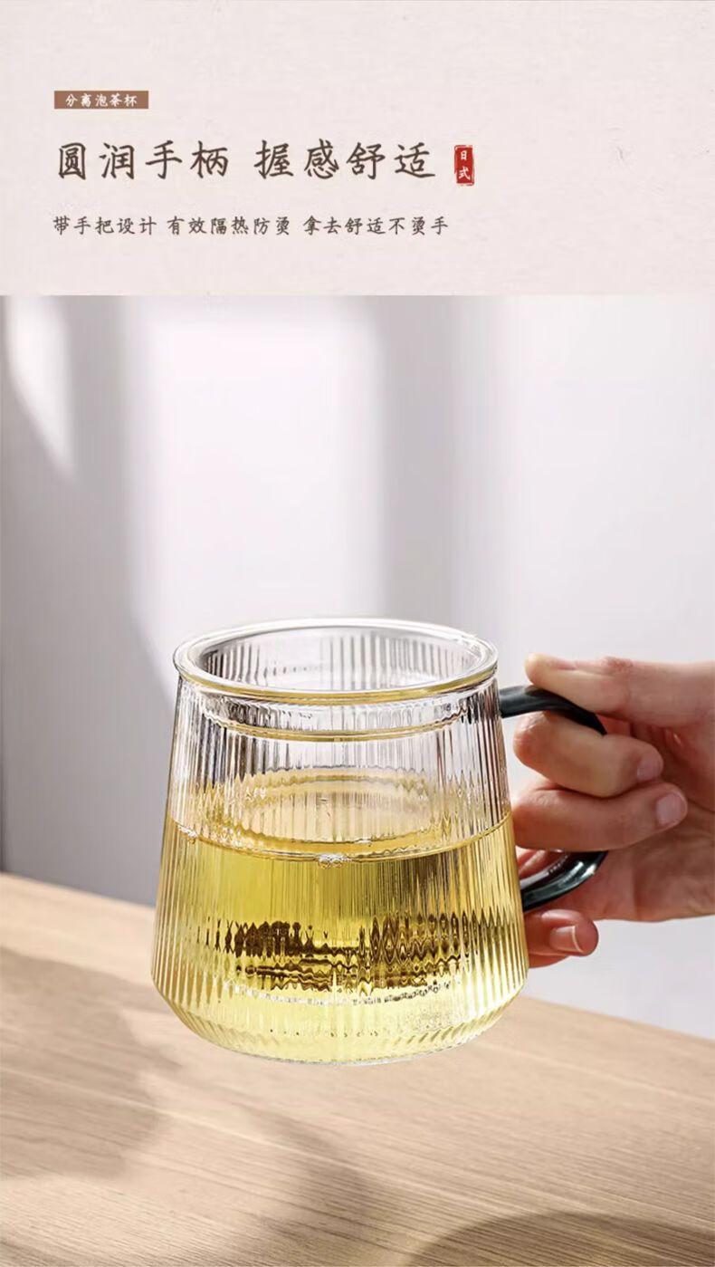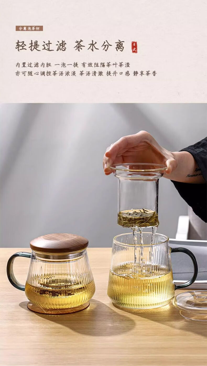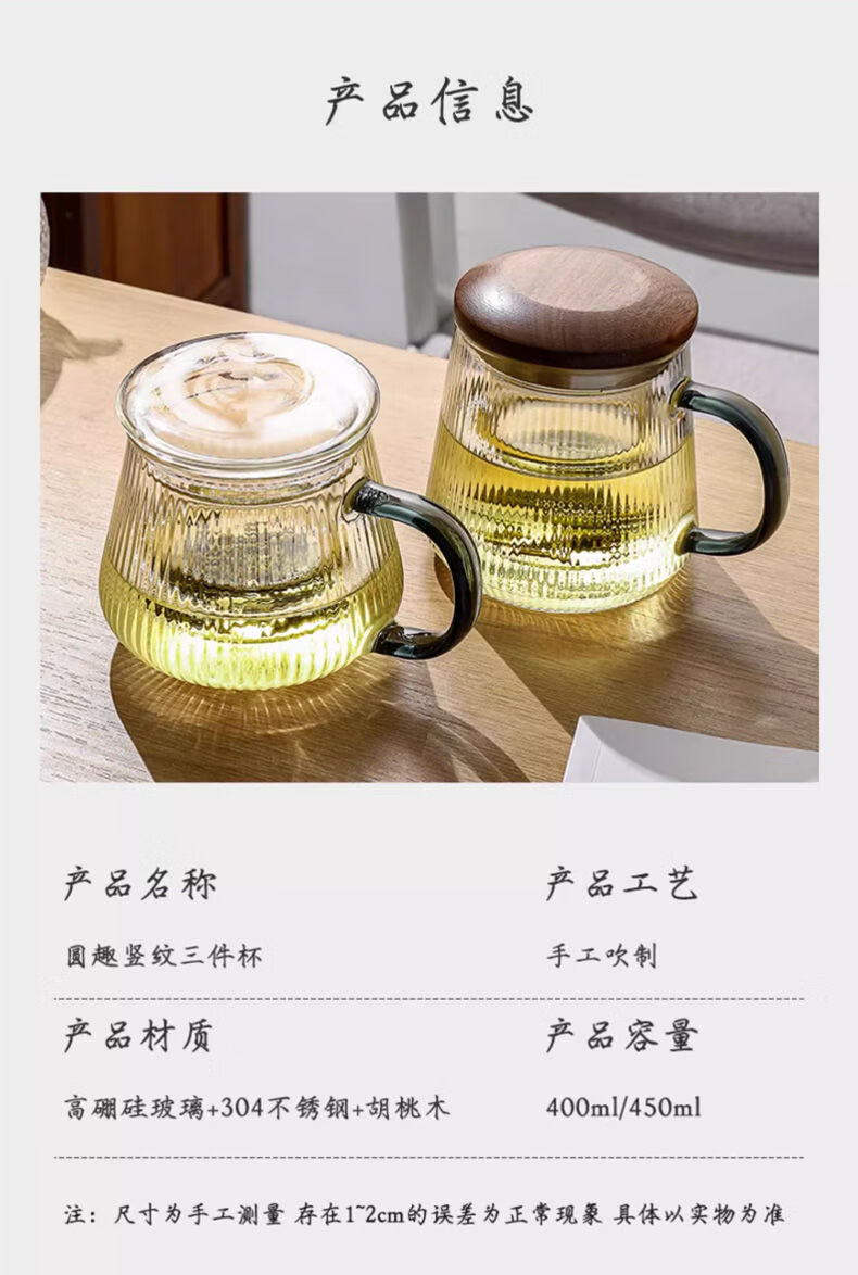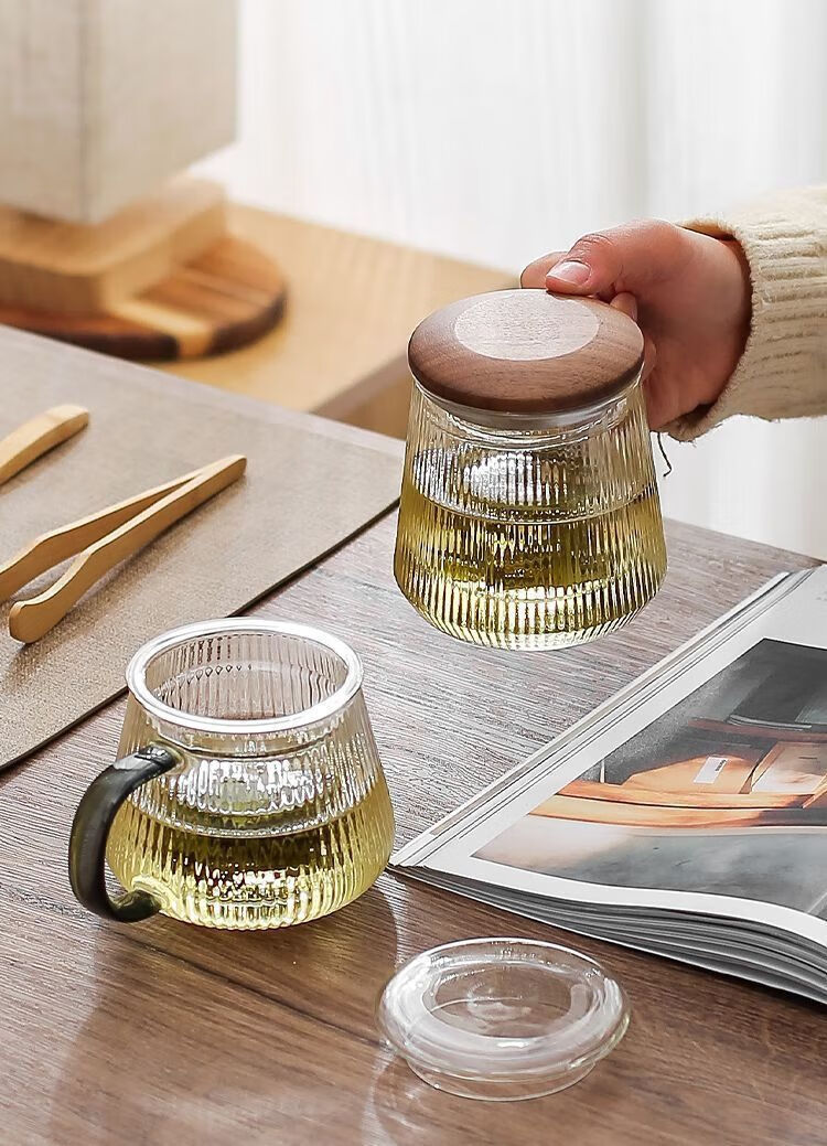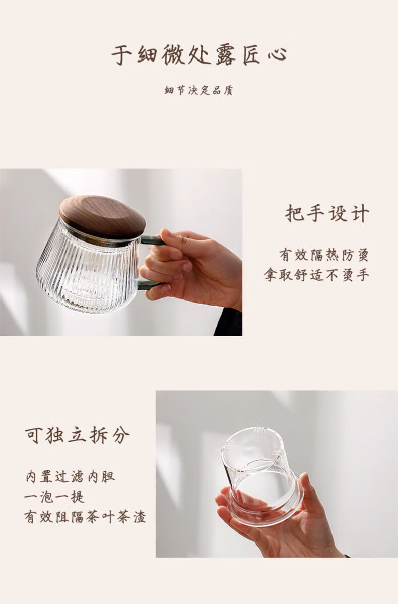 Round and interesting vertical pattern tea cup water cup tea water separation heat-resistant glass men's tea cup women's high-end personal use walnut lid vertical pattern cup 450ml