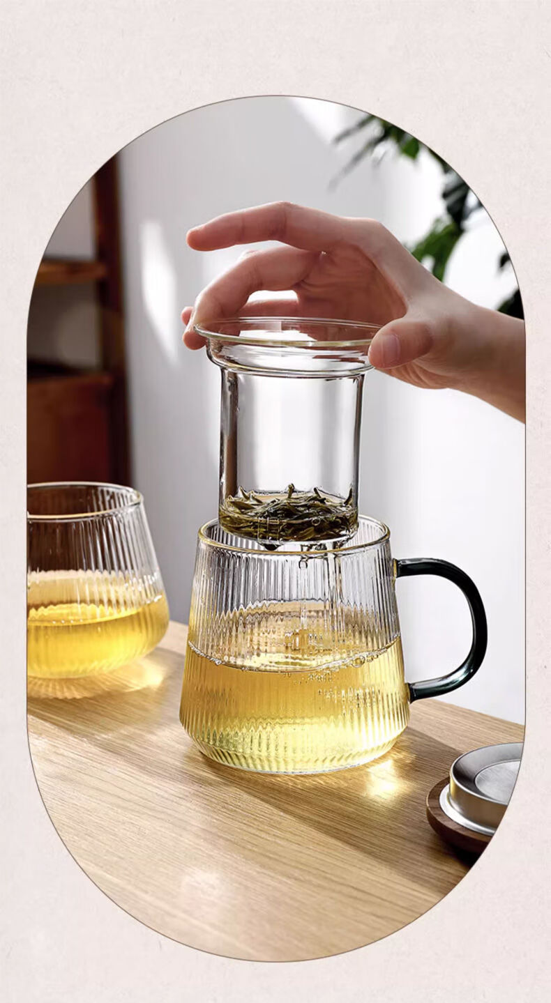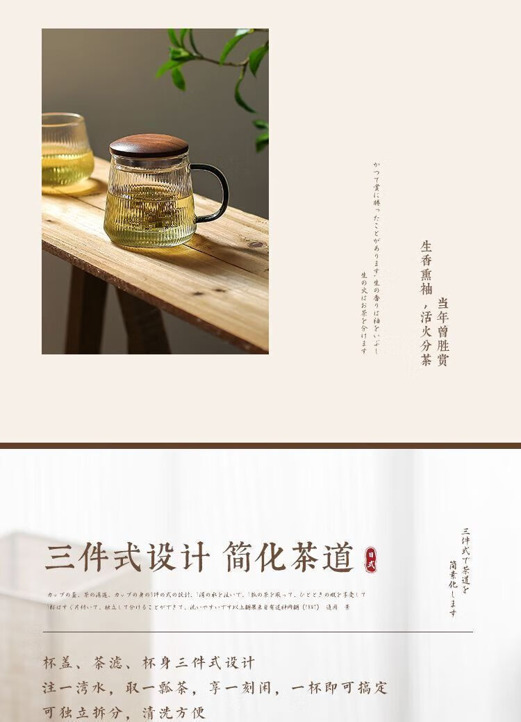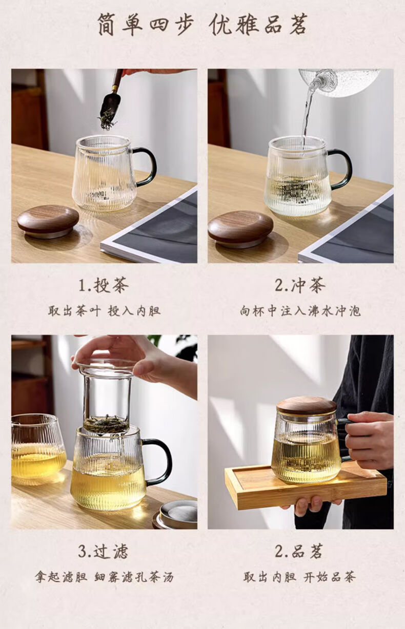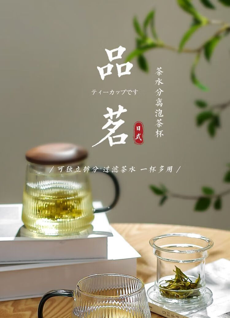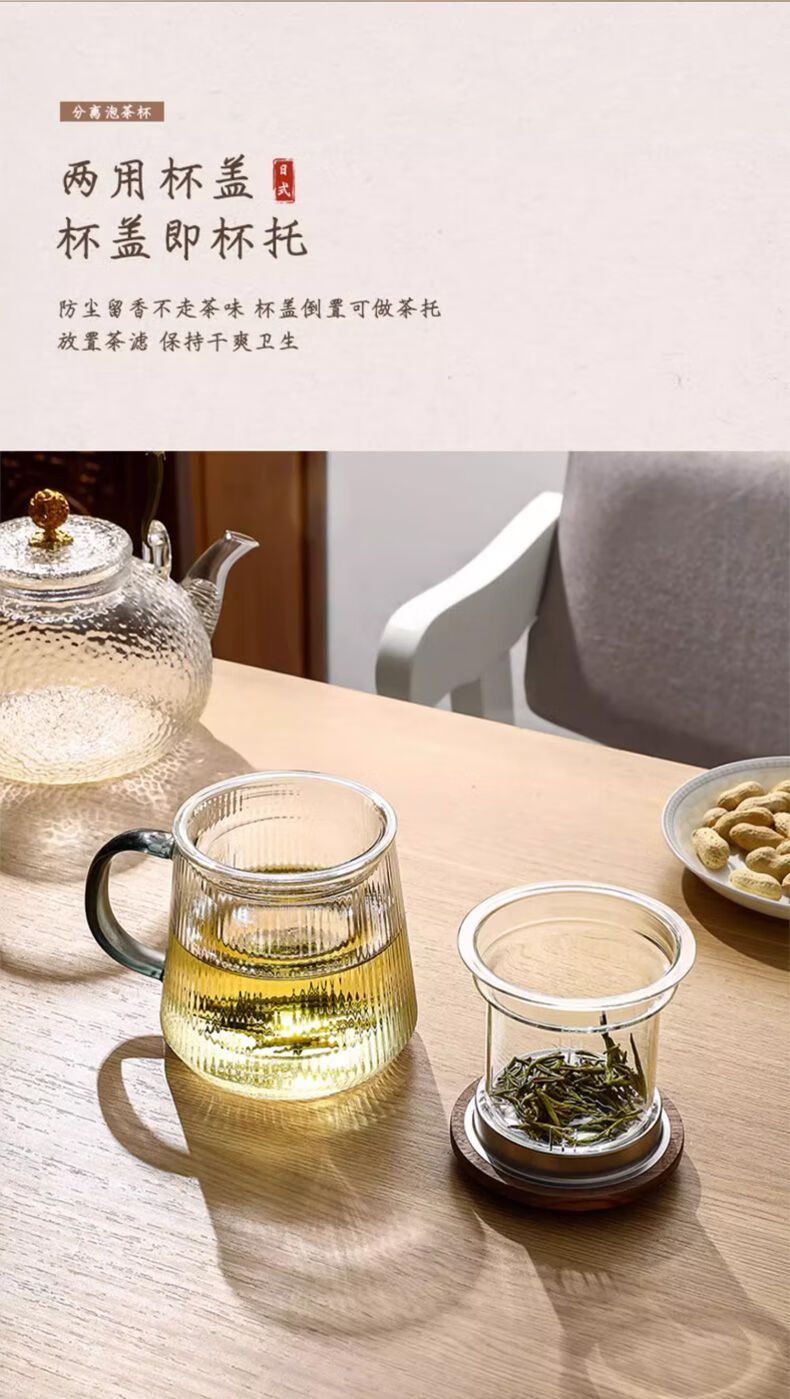 Round and interesting vertical pattern tea cup water cup tea water separation heat-resistant glass men's tea cup women's high-end personal use walnut lid vertical pattern cup 450ml