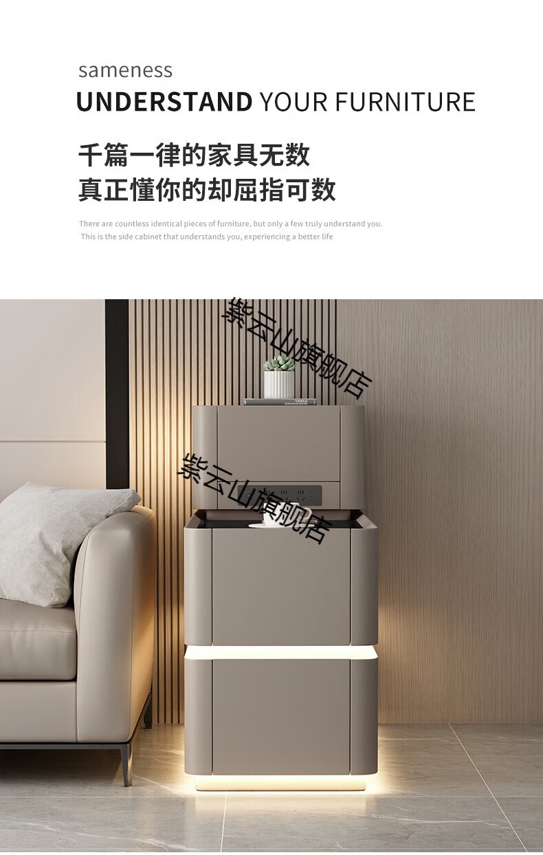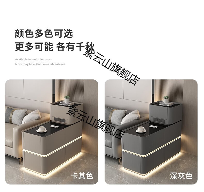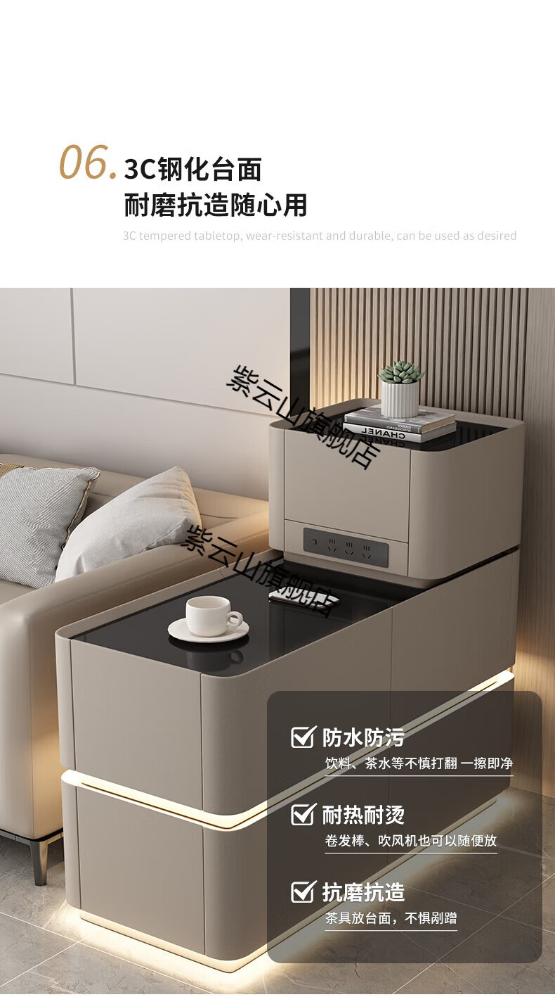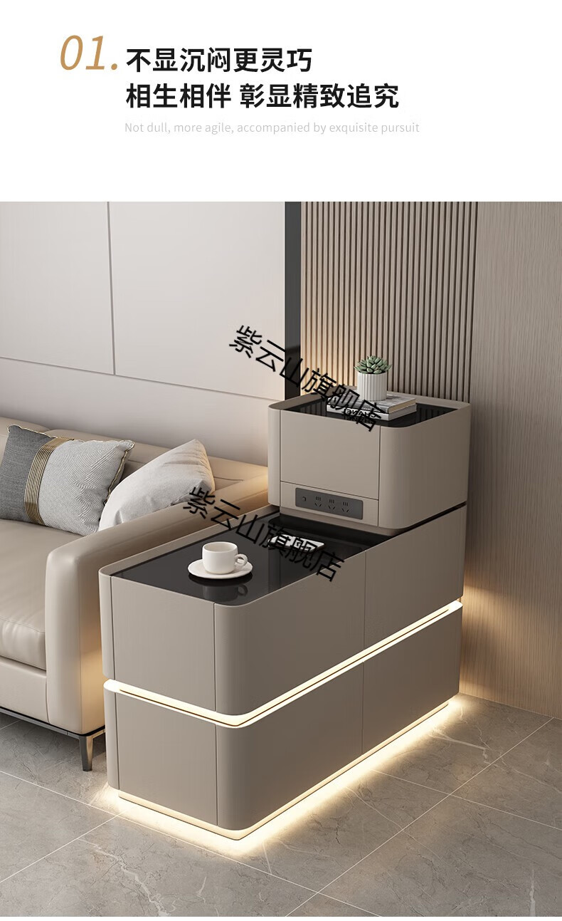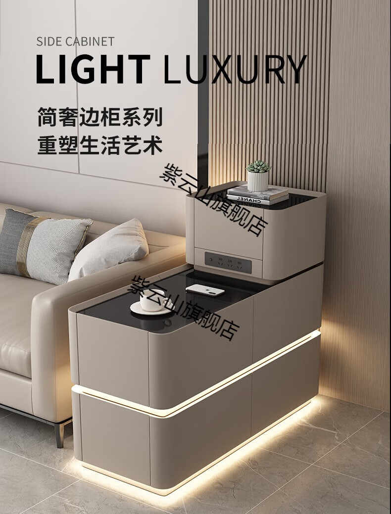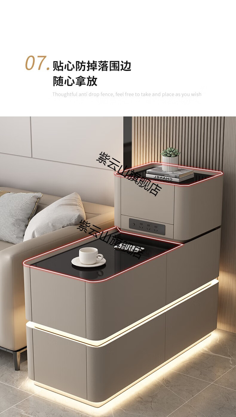 Ziyunshan sofa side table armrest cabinet with light and socket light luxury and high-end small apartment living room multi-functional side cabinet storage cabinet Khaki color (male steak plug+light strip+wireless charging) black glass width 40*height (55+30)*length 90