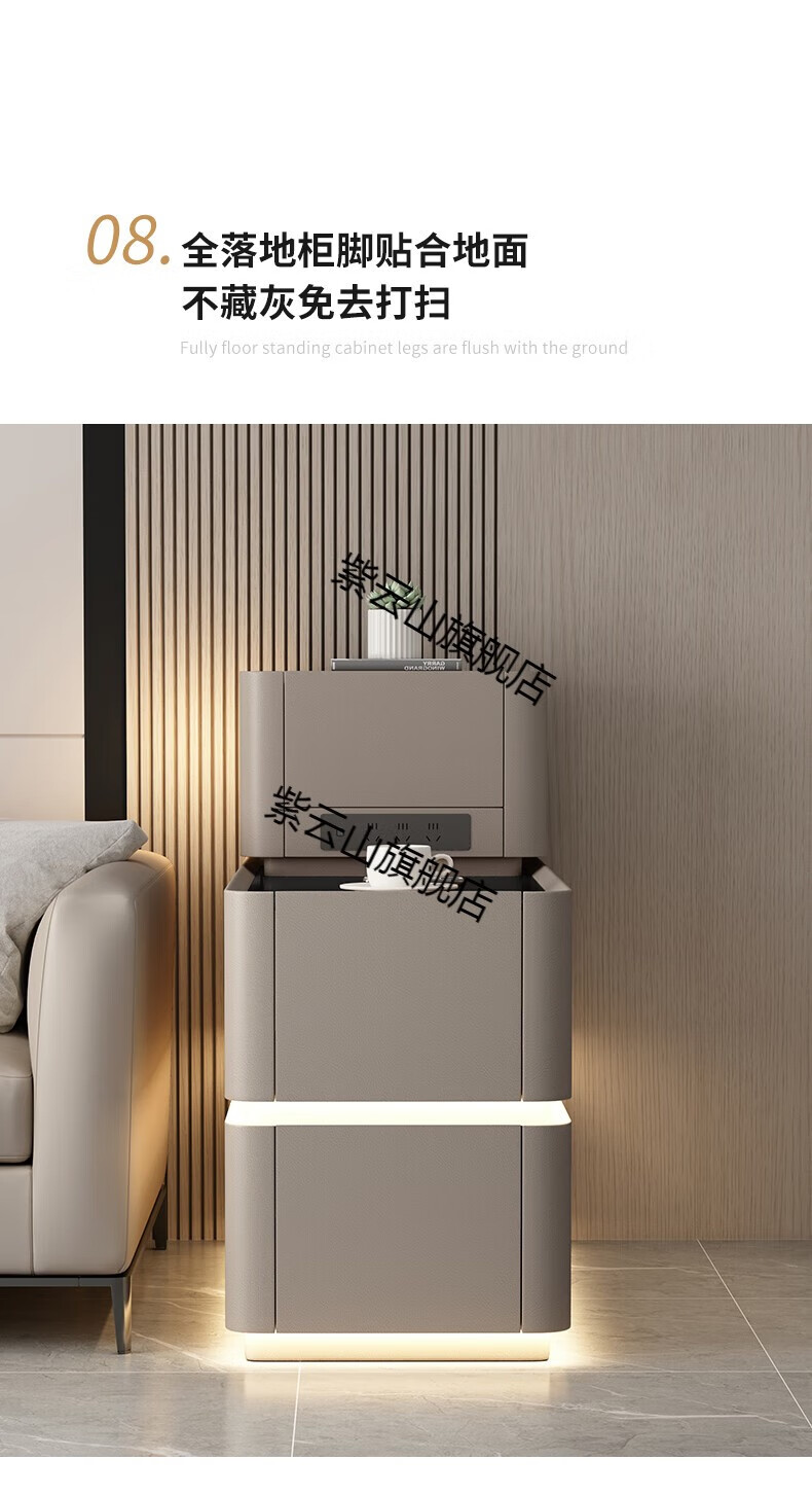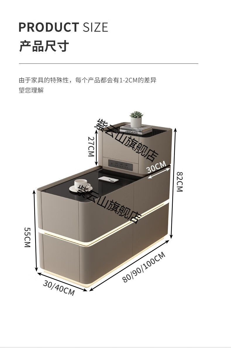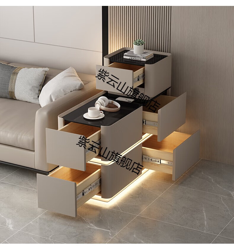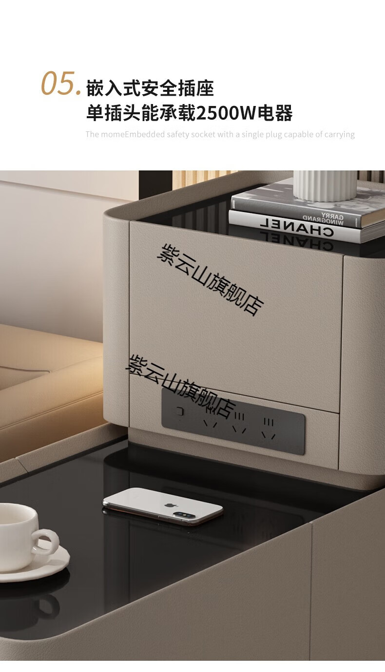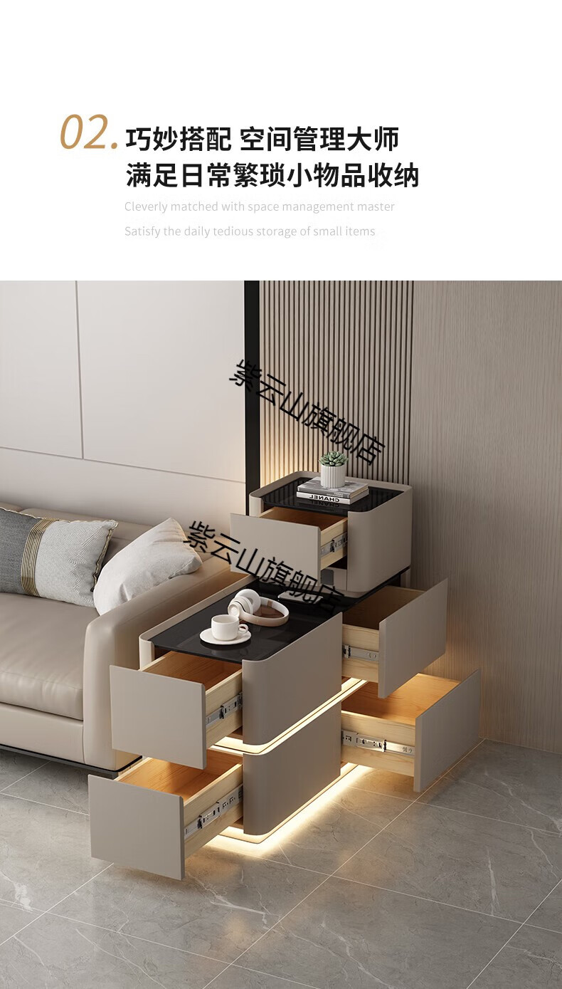 Ziyunshan sofa side table armrest cabinet with light and socket light luxury and high-end small apartment living room multi-functional side cabinet storage cabinet Khaki color (male steak plug+light strip+wireless charging) black glass width 40*height (55+30)*length 90