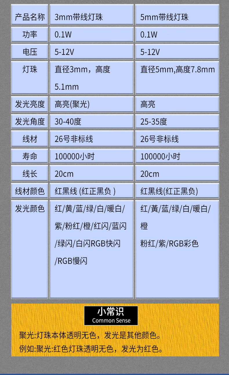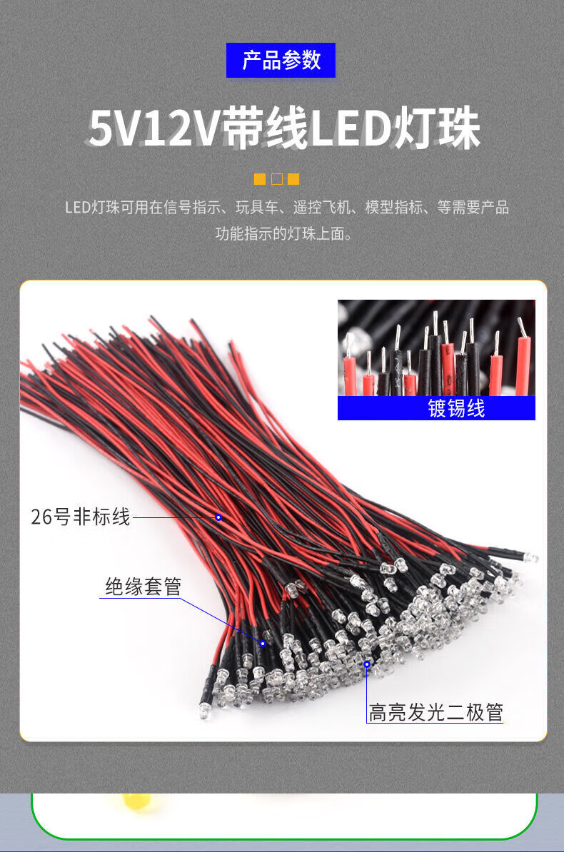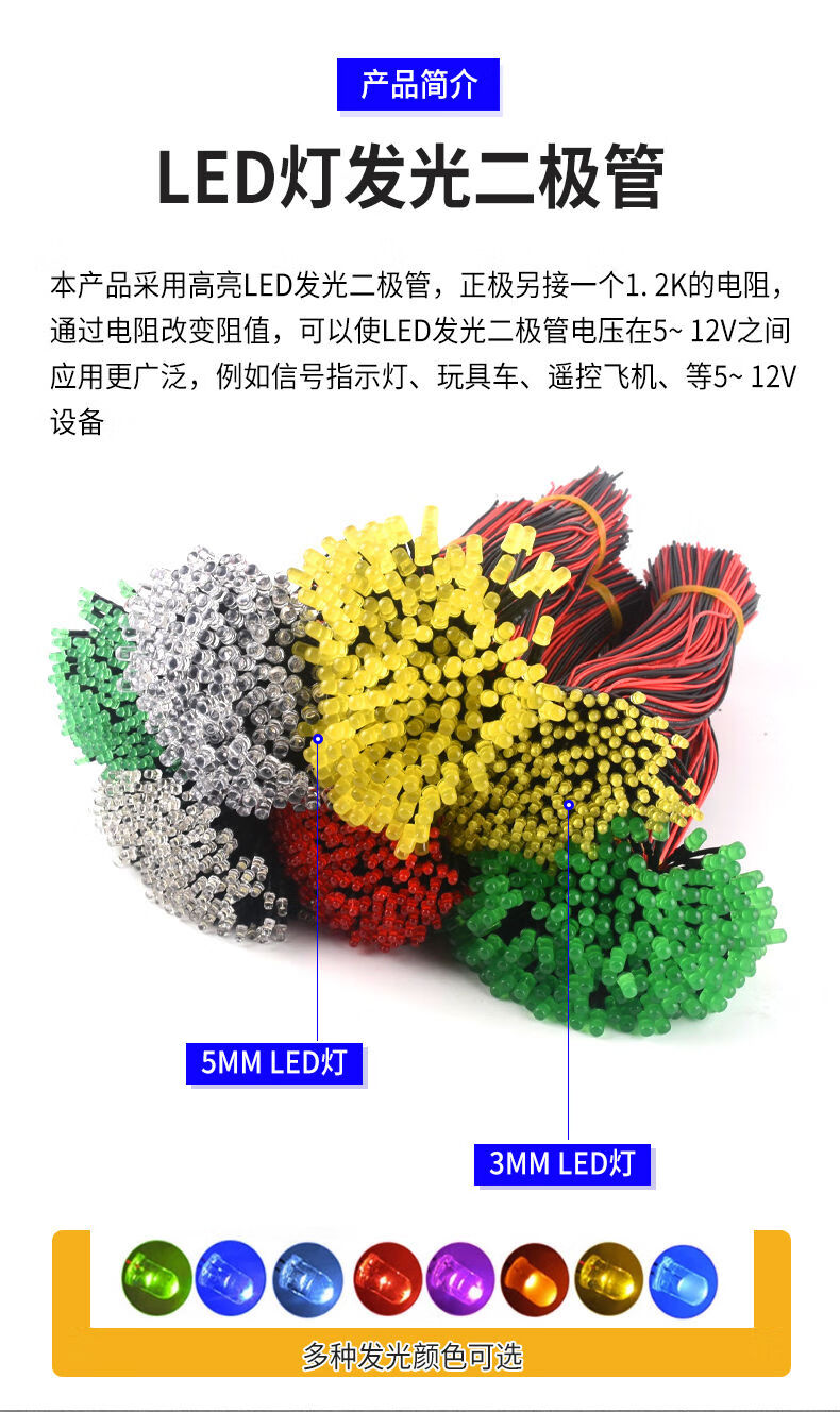 3MM/5MM high-brightness LED light-emitting diode 5V12V with wires LED lamp beads small bulb toy car indicator light 3mm white hair green 5V-12V with wires 20CM (5 pieces)