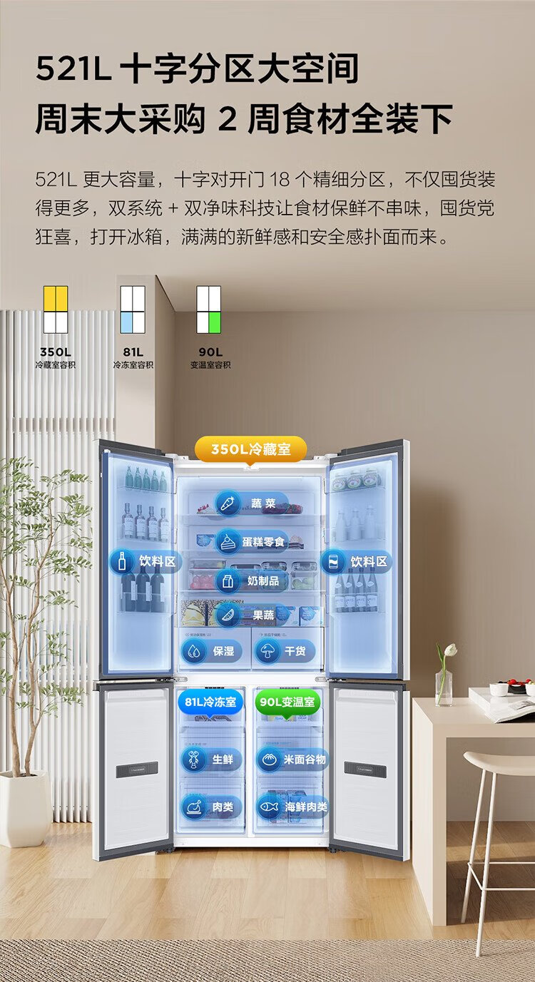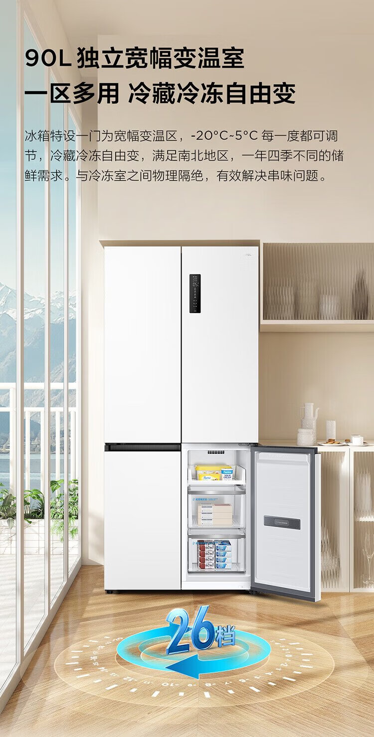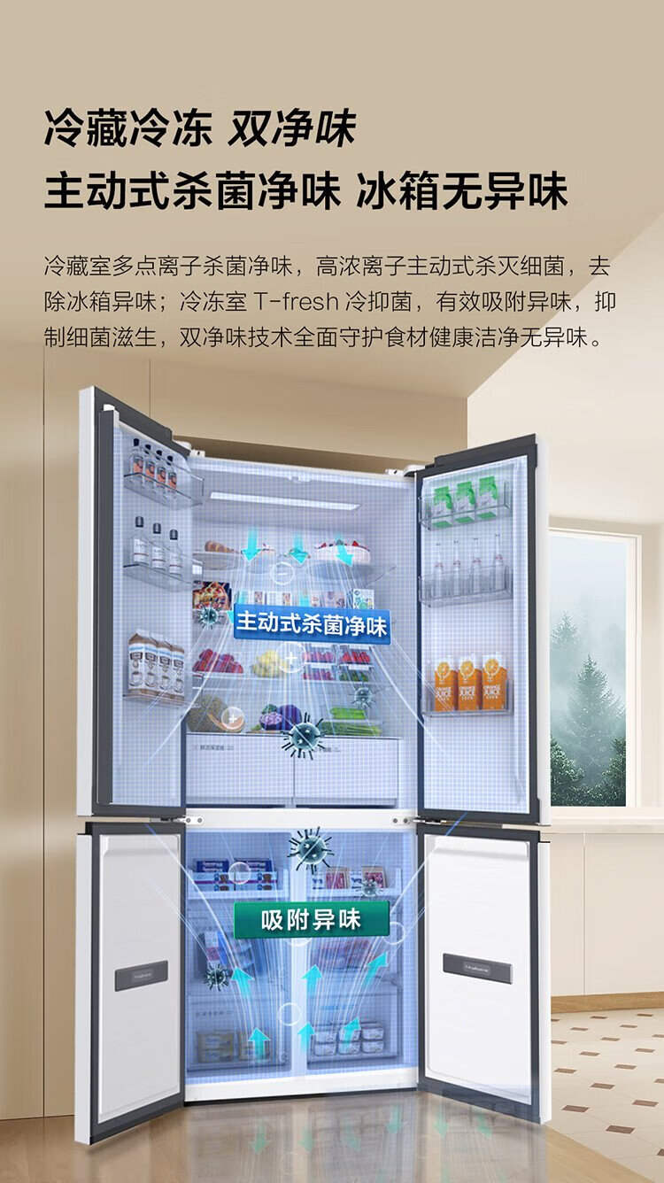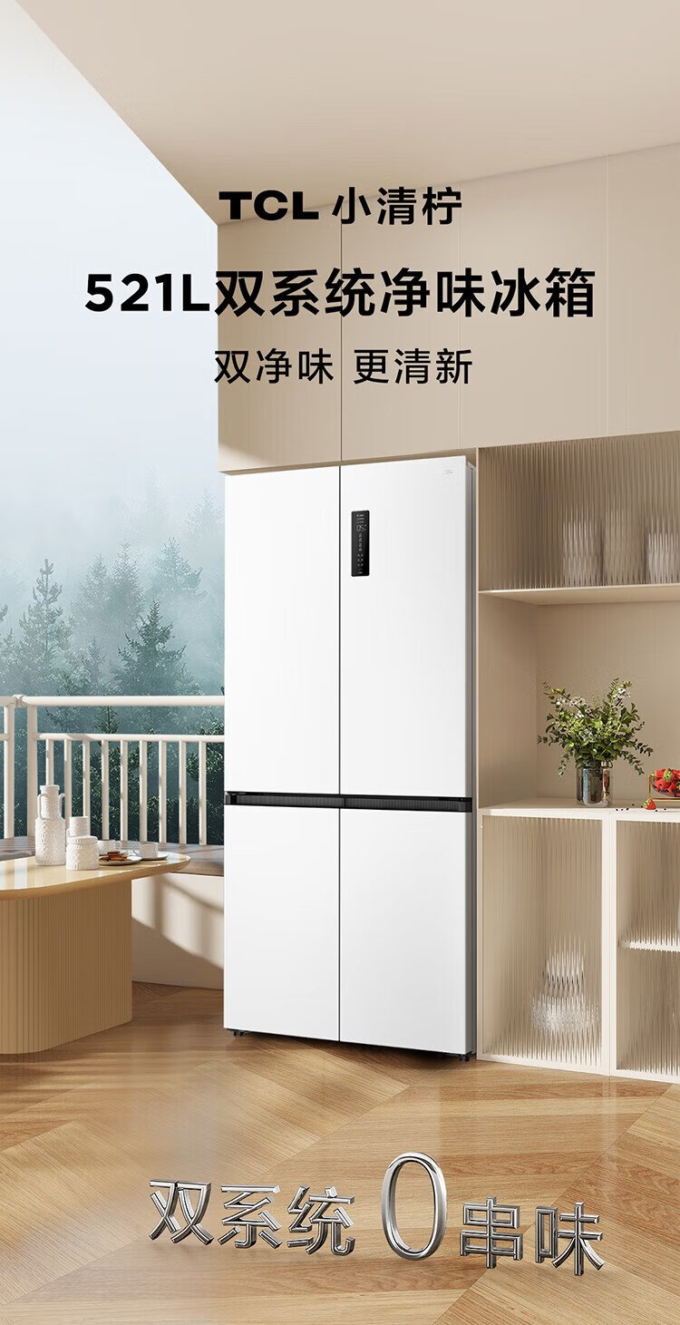 TCL Xiaoqingning 521 liter cross-opening four-door dual-system dual-purity large-capacity wide-width variable-temperature refrigerator household refrigerator first-class energy-efficiency frequency conversion old-for-new R521T5-US national subsidy