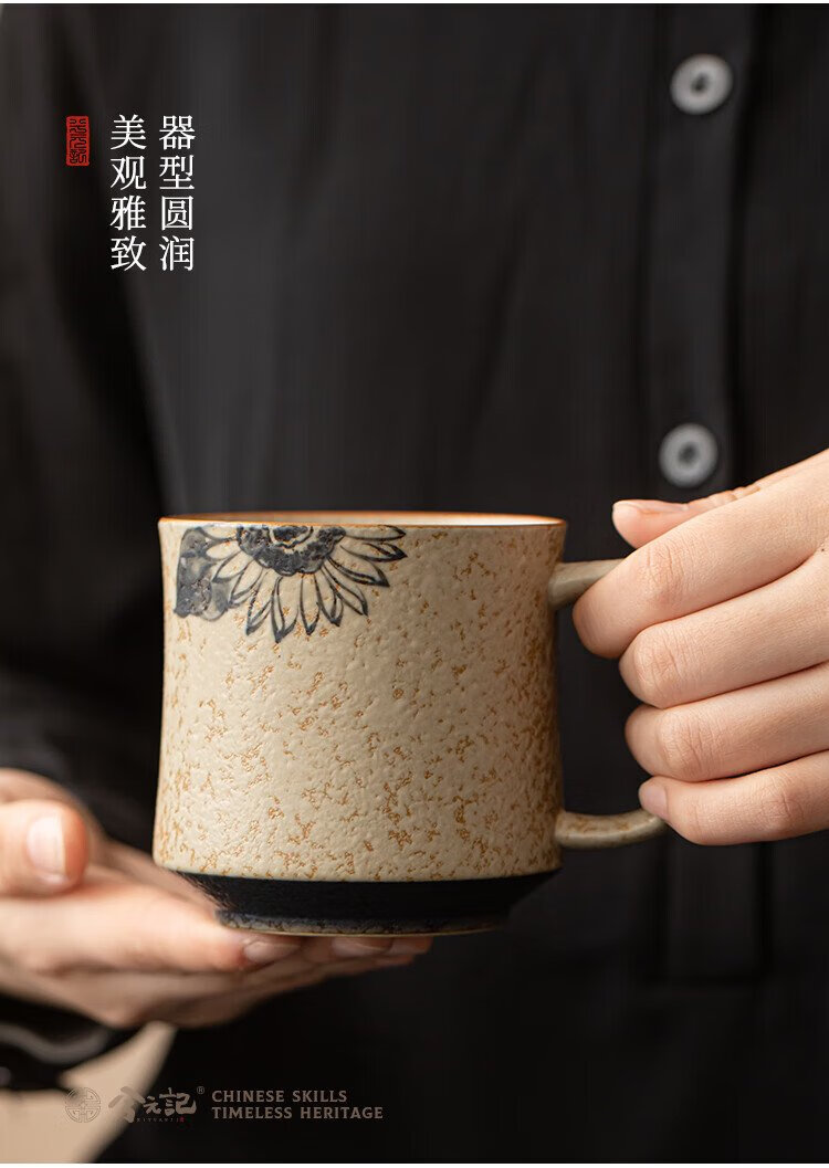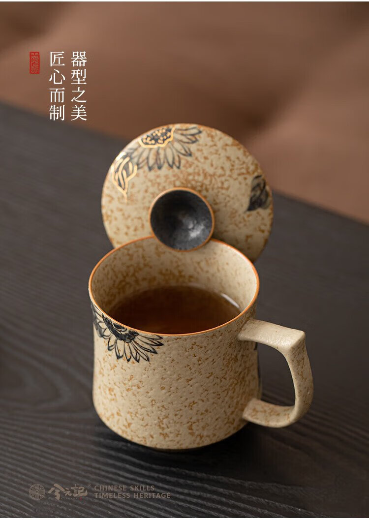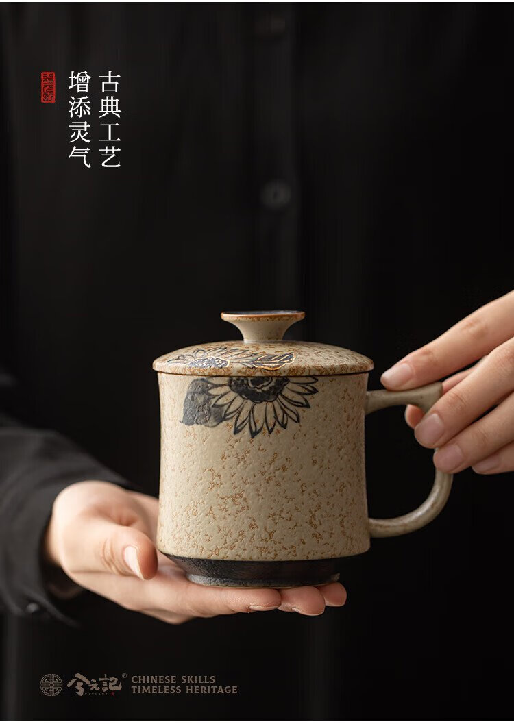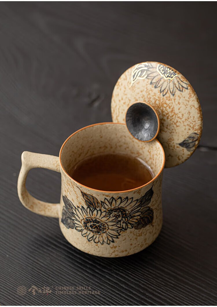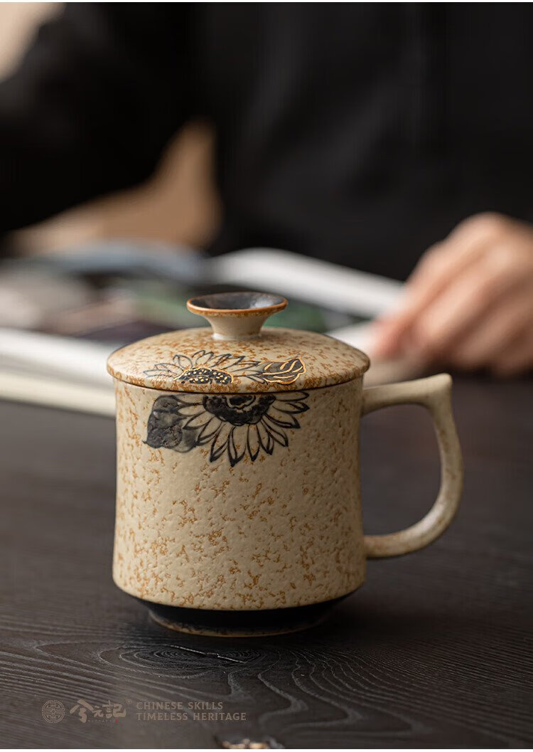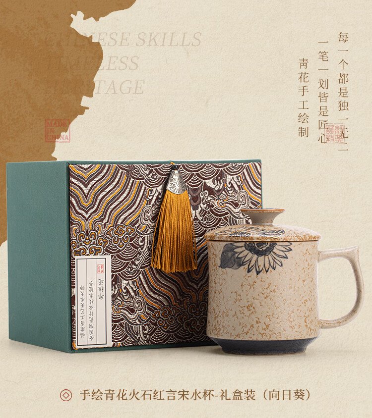 Xi Yuanji hand-painted blue and white flint red tea cup ceramic water cup with lid office mug Chinese antique cup hand-painted blue and white flint red Song Dynasty water cup-Sunflower