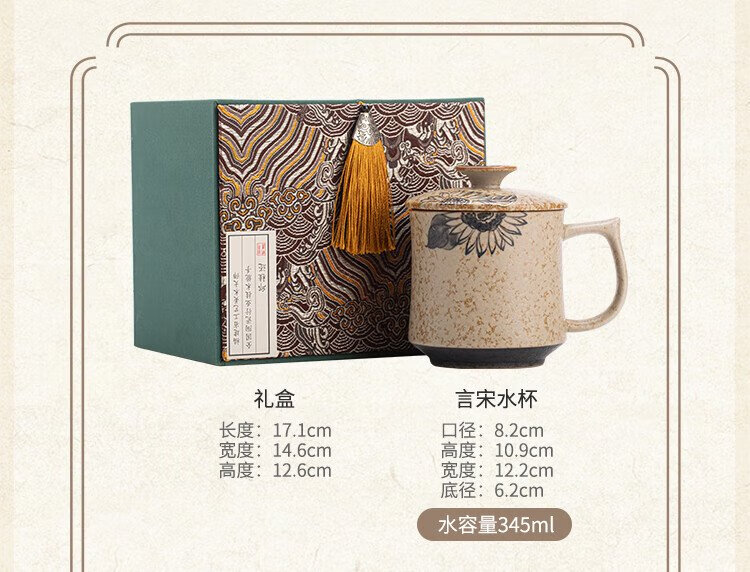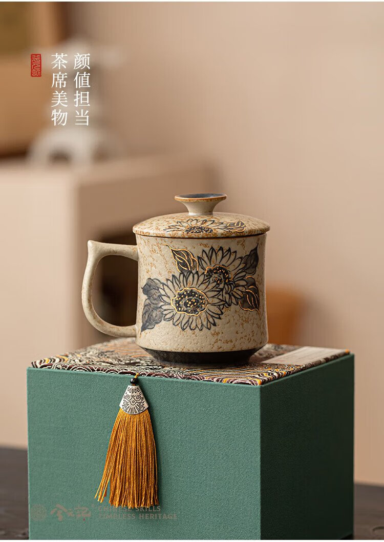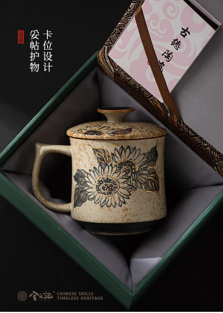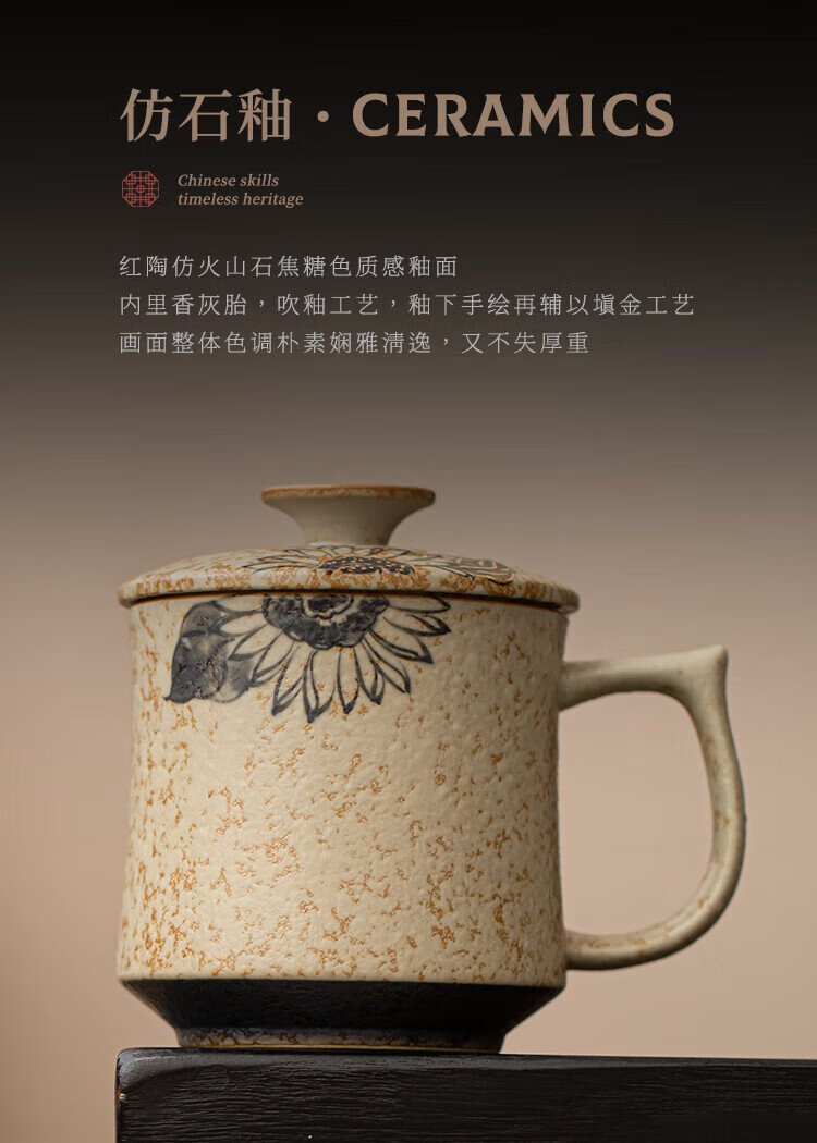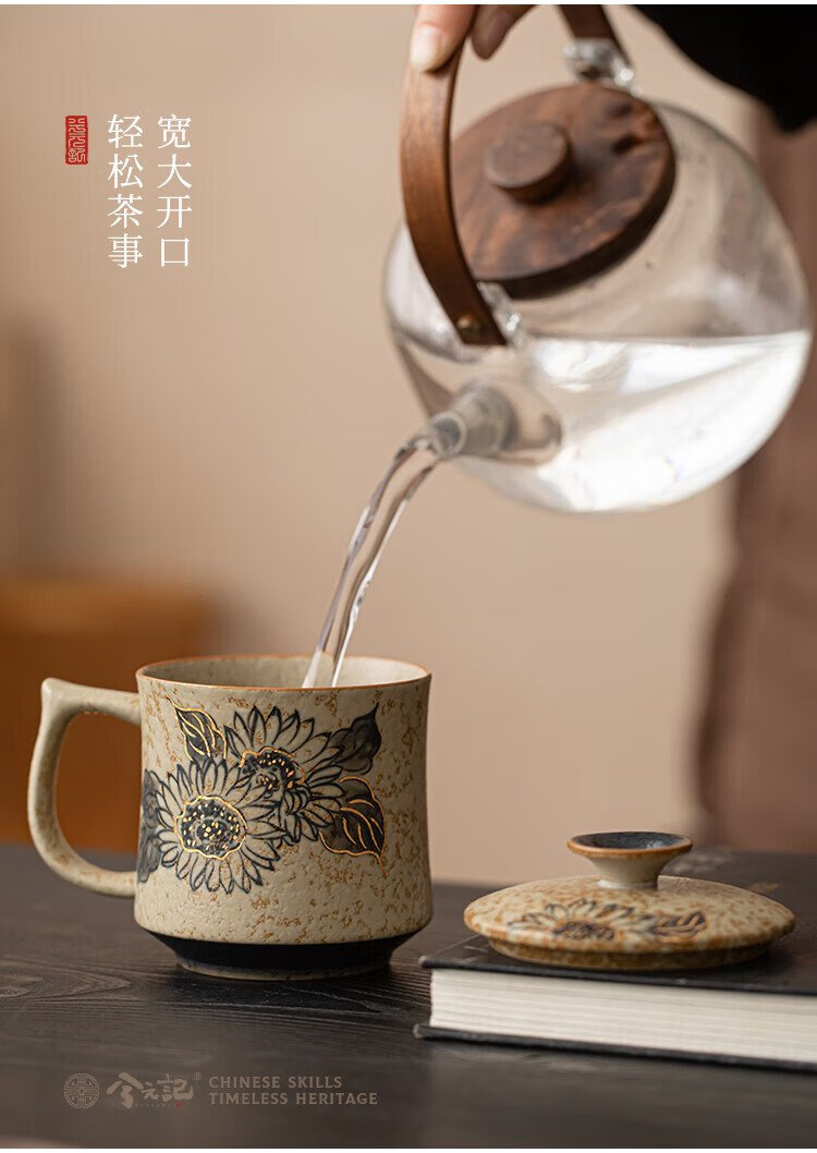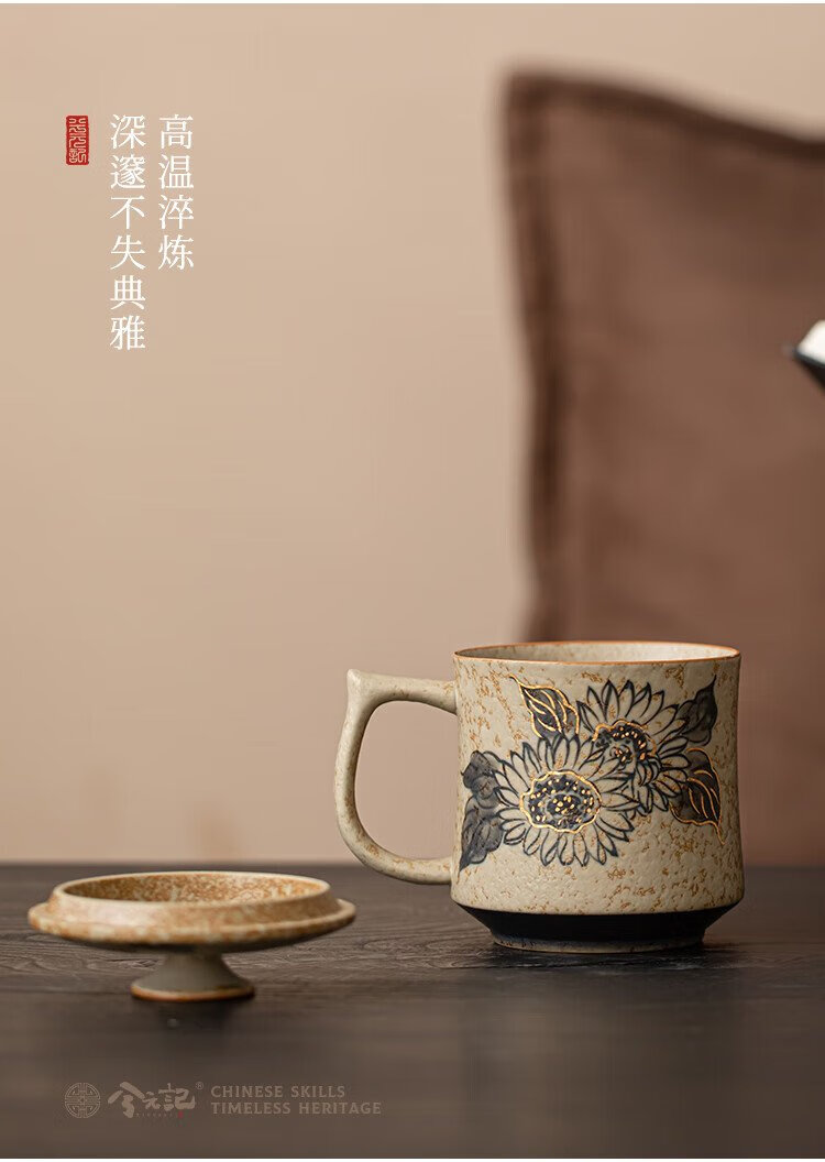 Xi Yuanji hand-painted blue and white flint red tea cup ceramic water cup with lid office mug Chinese antique cup hand-painted blue and white flint red Song Dynasty water cup-Sunflower